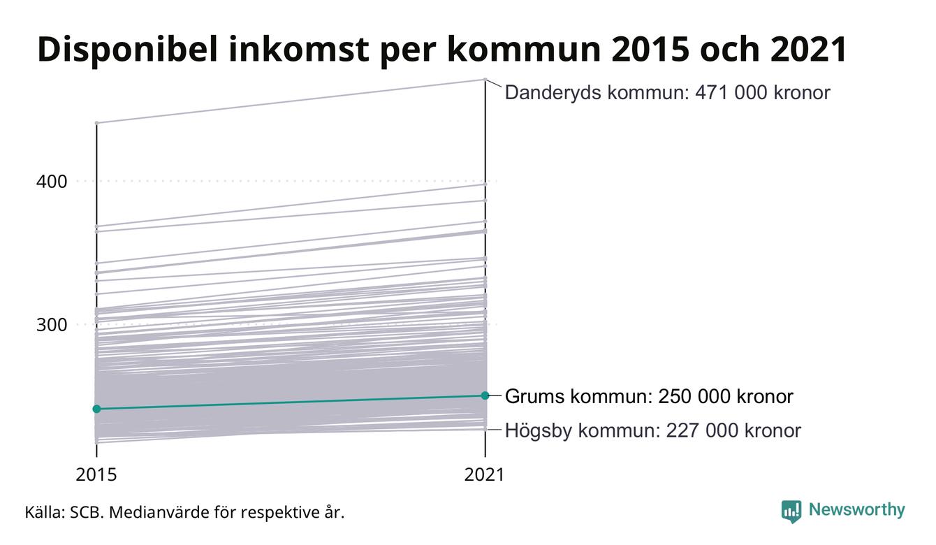 Medianinkomsten i Grums som helhet var 250 000 kronor 2021, vilket är lägre än de flesta andra kommuner. Sedan 2015 har den disponibla inkomsten i kommunen ökat med 4 procent.