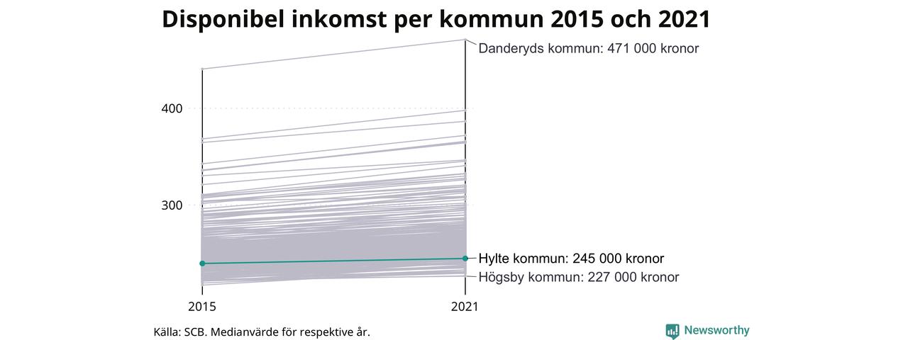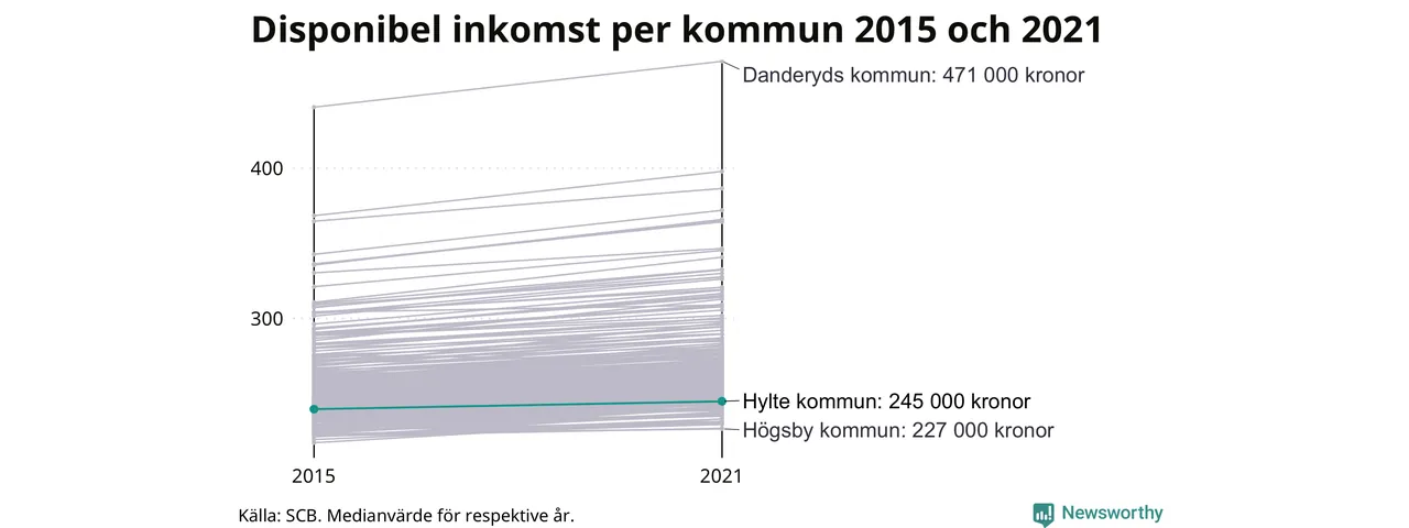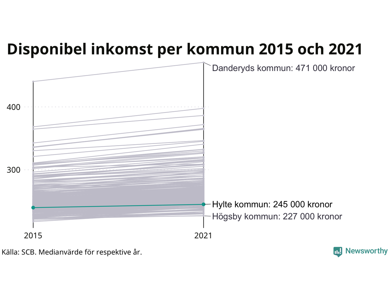 Medianinkomsten i Hylte som helhet var 245 000 kronor 2021, vilket är den lägsta i Hallands län. Sedan 2015 har den disponibla inkomsten i kommunen ökat med 2 procent.