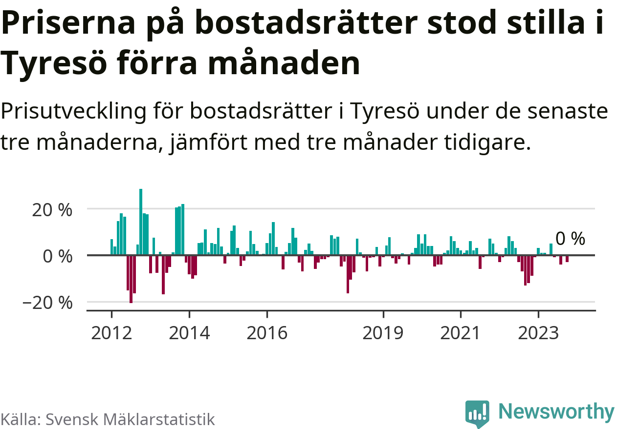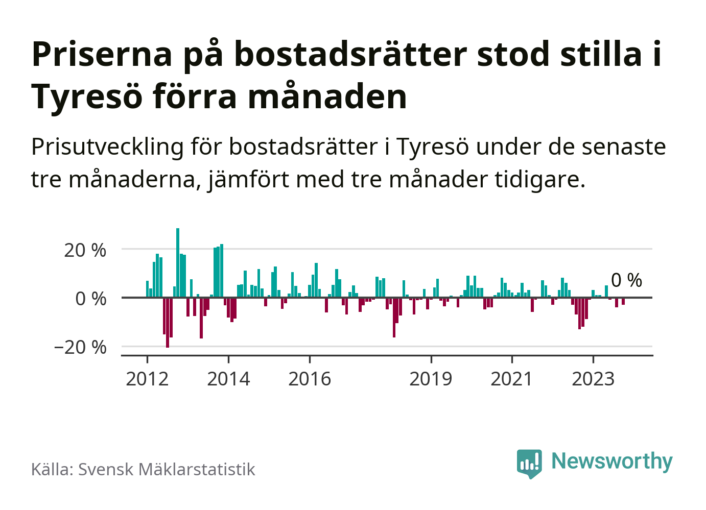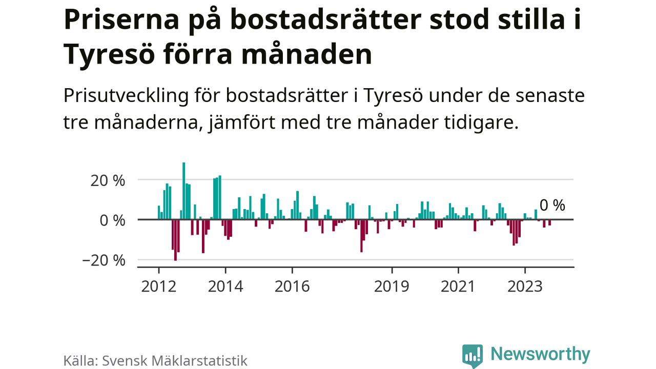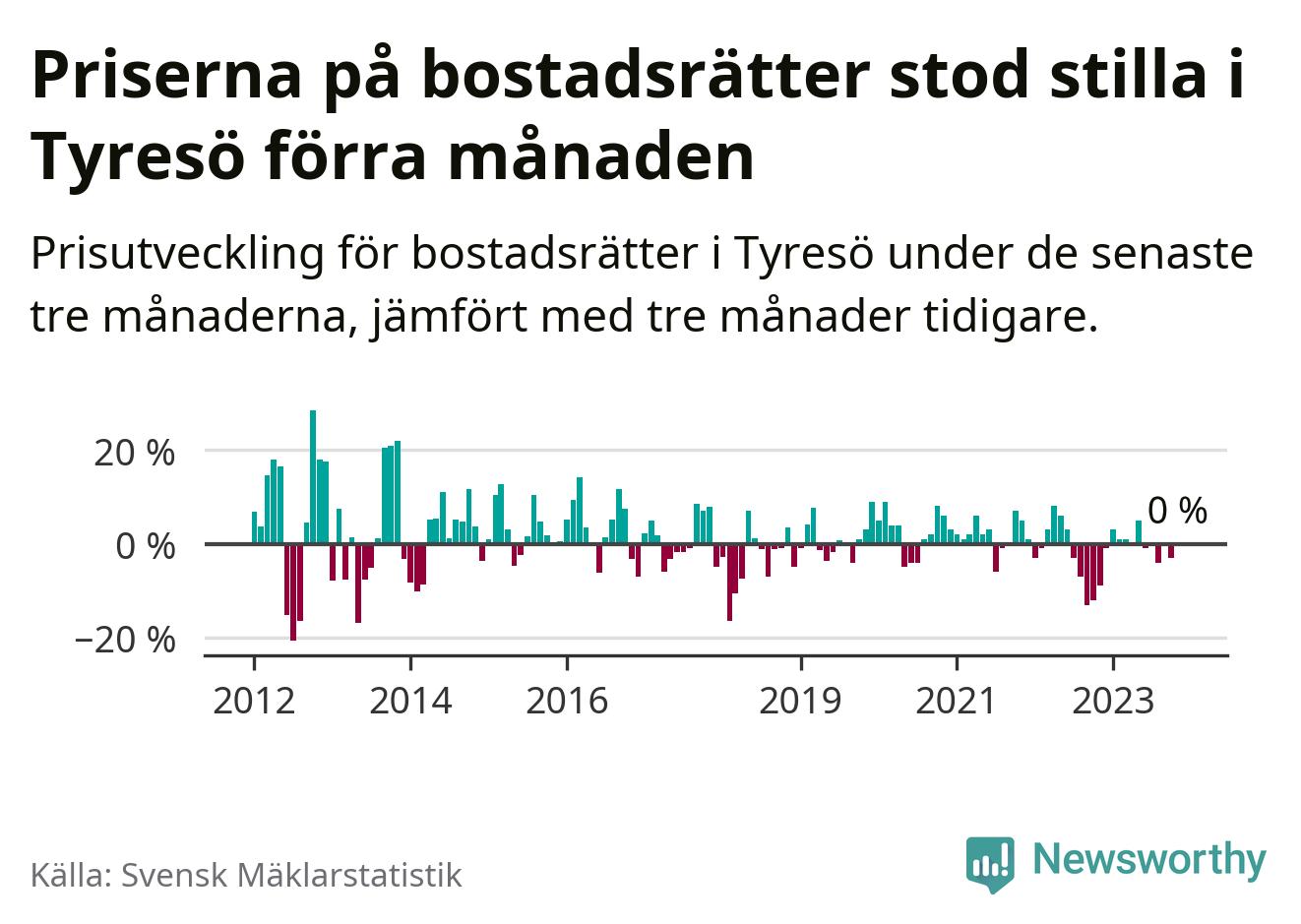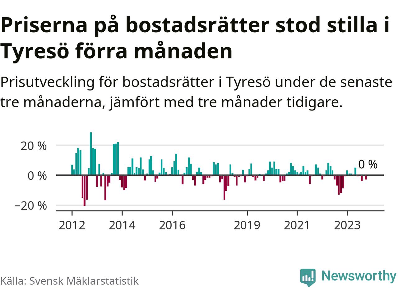 Priserna på bostadsrätter står i stort sett stilla i Tyresö kommun. Medelpriset på de på försäljningarna under de senaste tre månaderna låg på samma nivå som för tre månader sedan.