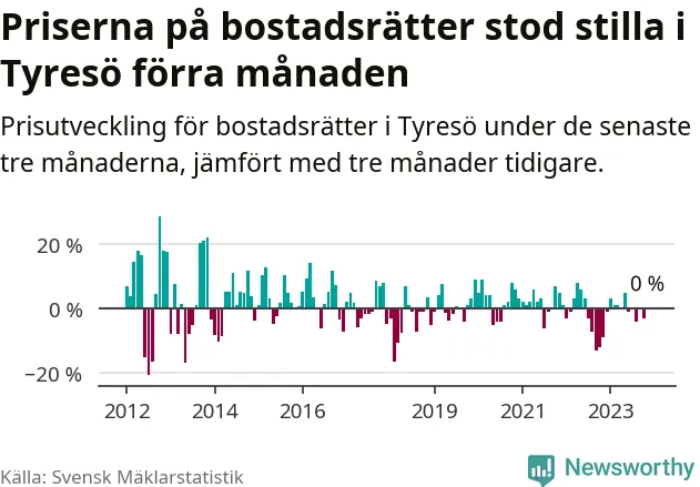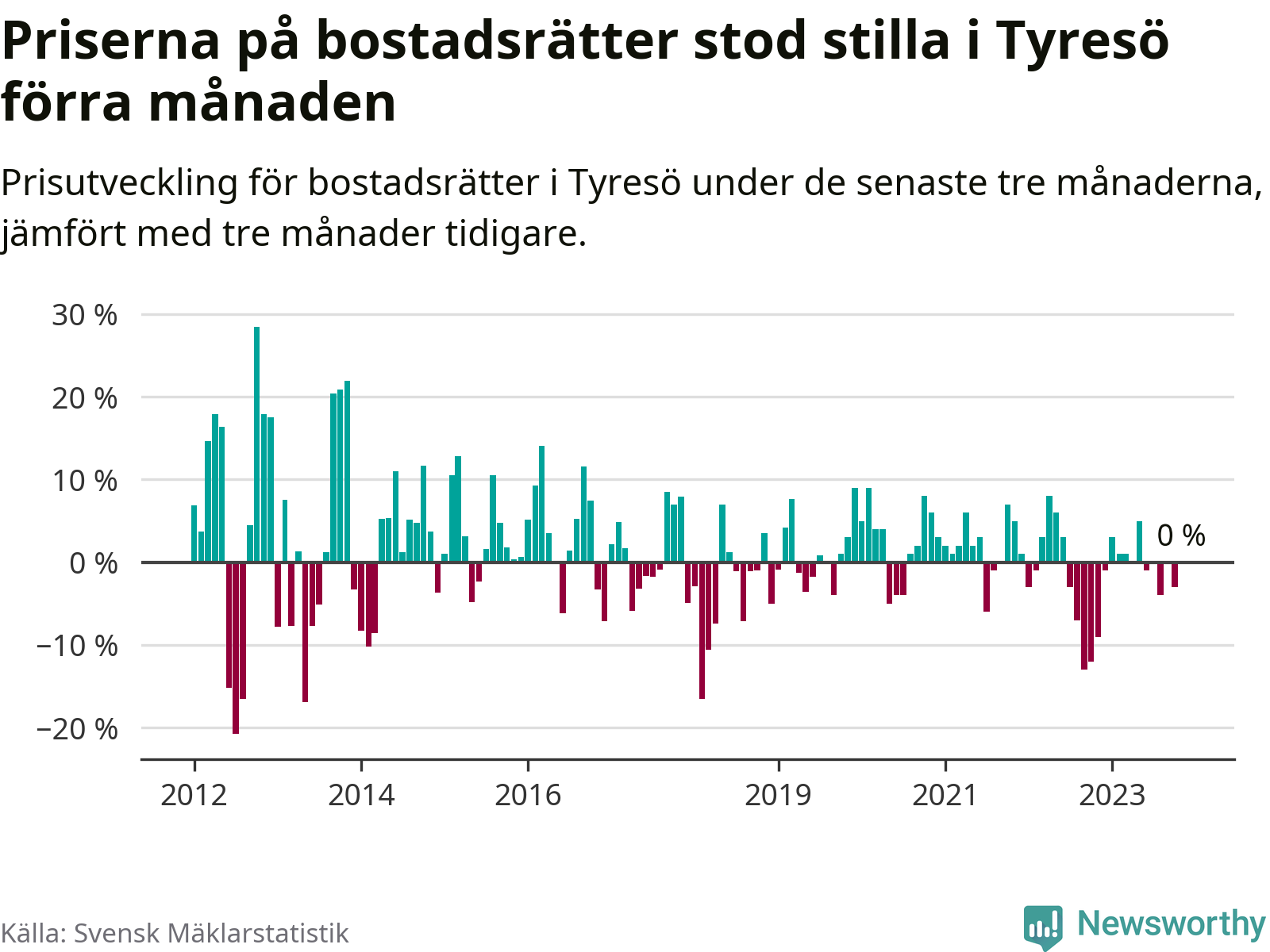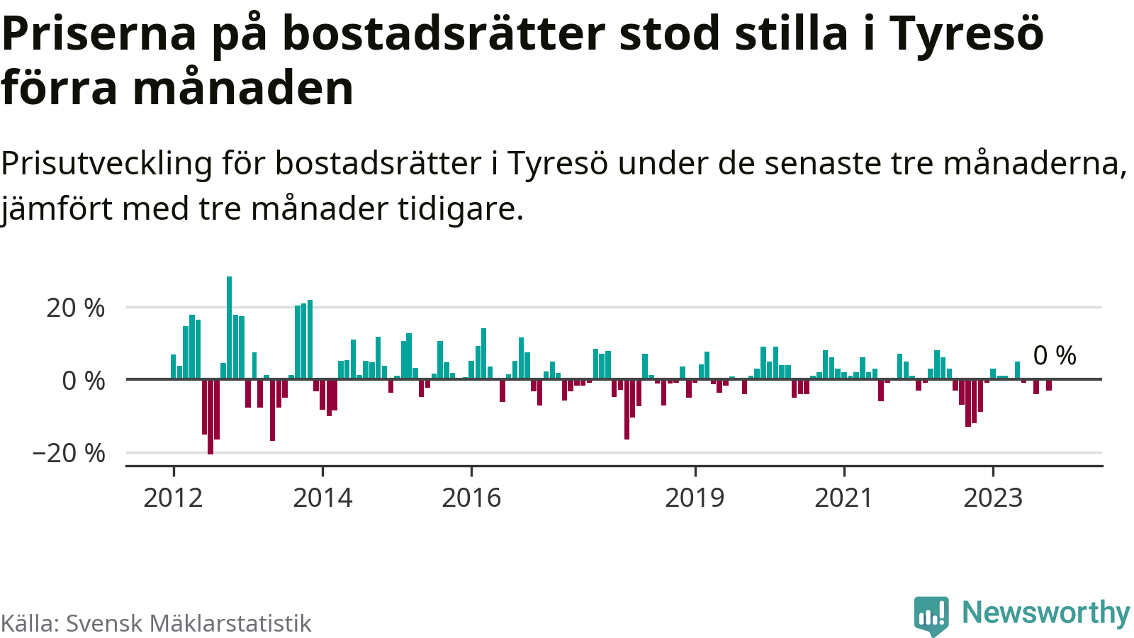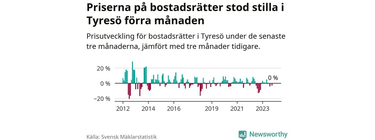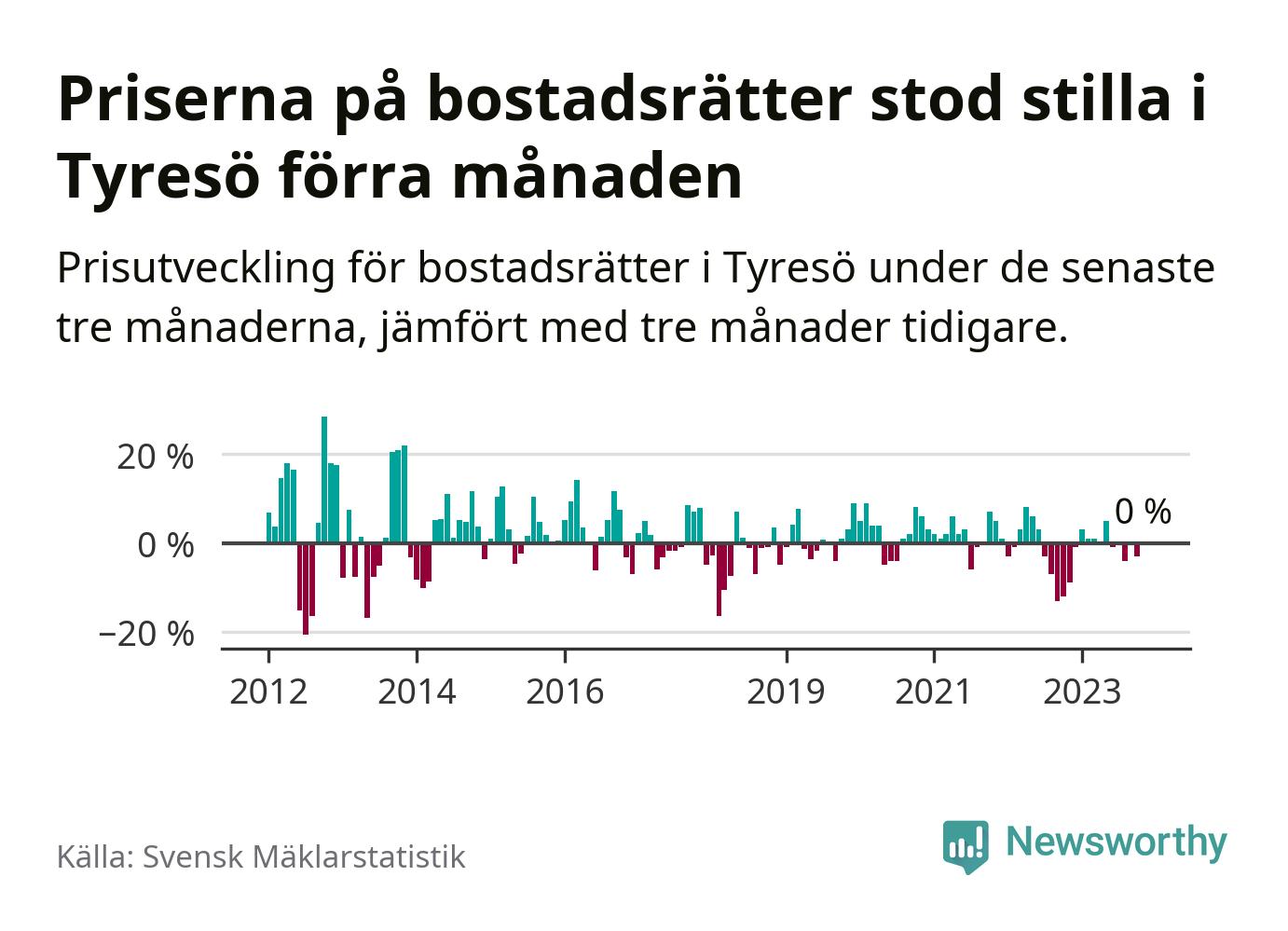 Priserna på bostadsrätter står i stort sett stilla i Tyresö kommun. Medelpriset på de på försäljningarna under de senaste tre månaderna låg på samma nivå som för tre månader sedan.