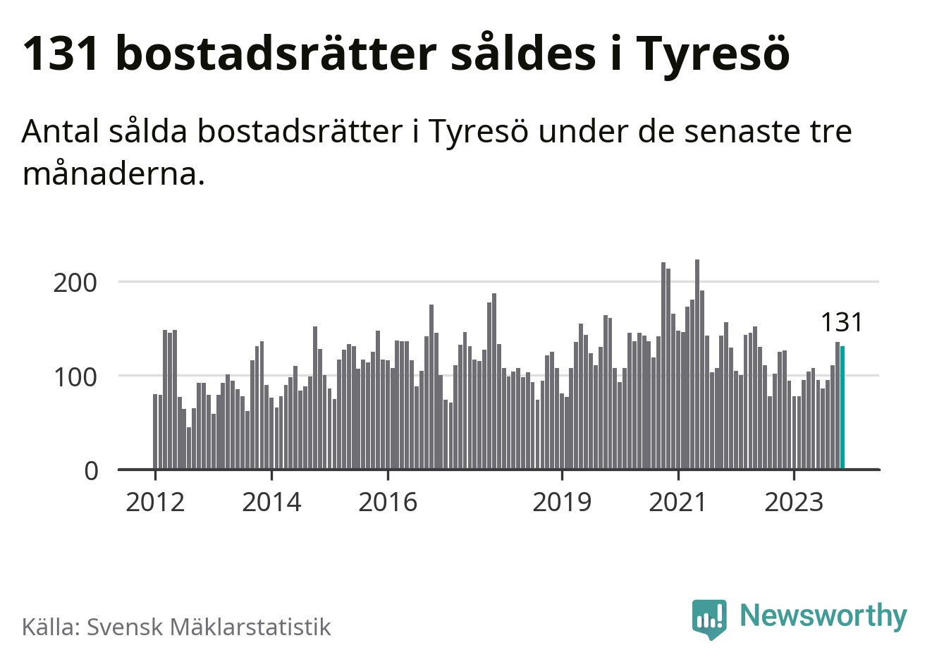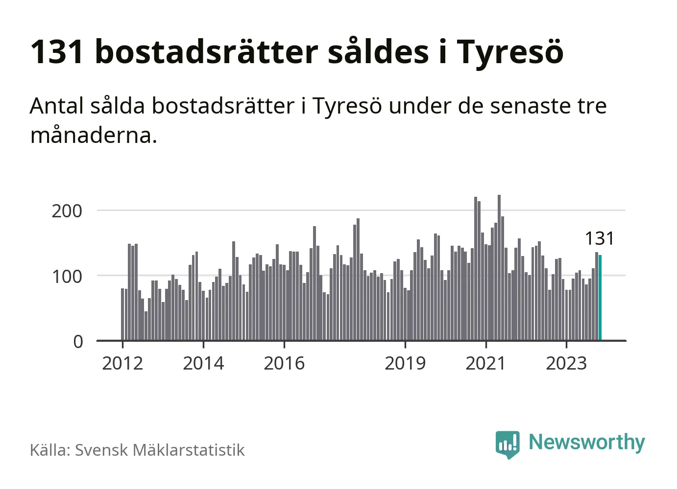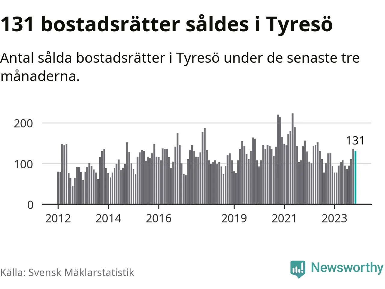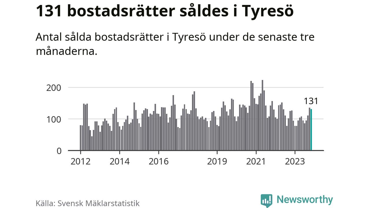 Sammanlagt såldes 131 bostadsrätter i Tyresö kommun mellan september och november till ett genomsnittligt pris på 2,7 miljoner kronor. I fjol gjordes 126 affärer vid den här tiden på året.