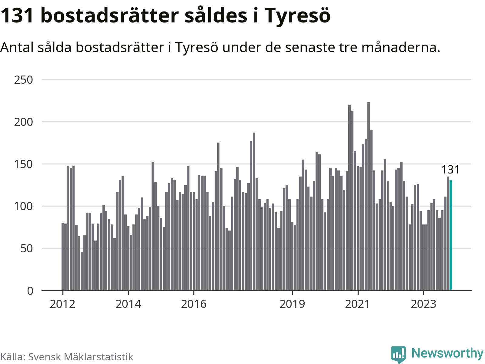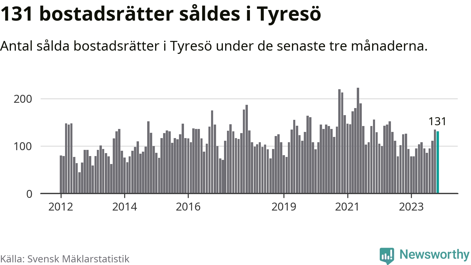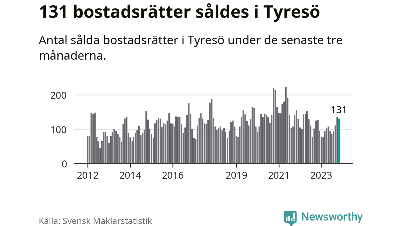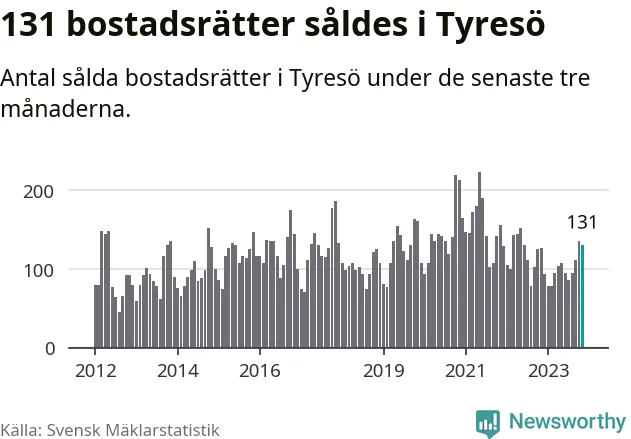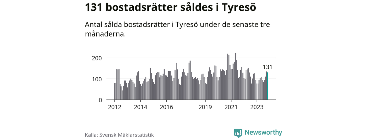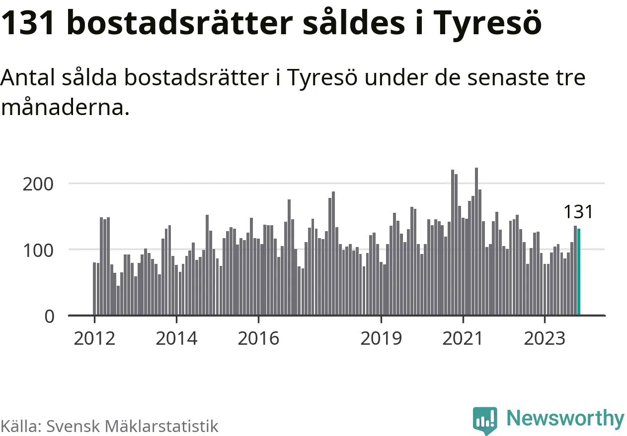 Sammanlagt såldes 131 bostadsrätter i Tyresö kommun mellan september och november till ett genomsnittligt pris på 2,7 miljoner kronor. I fjol gjordes 126 affärer vid den här tiden på året.