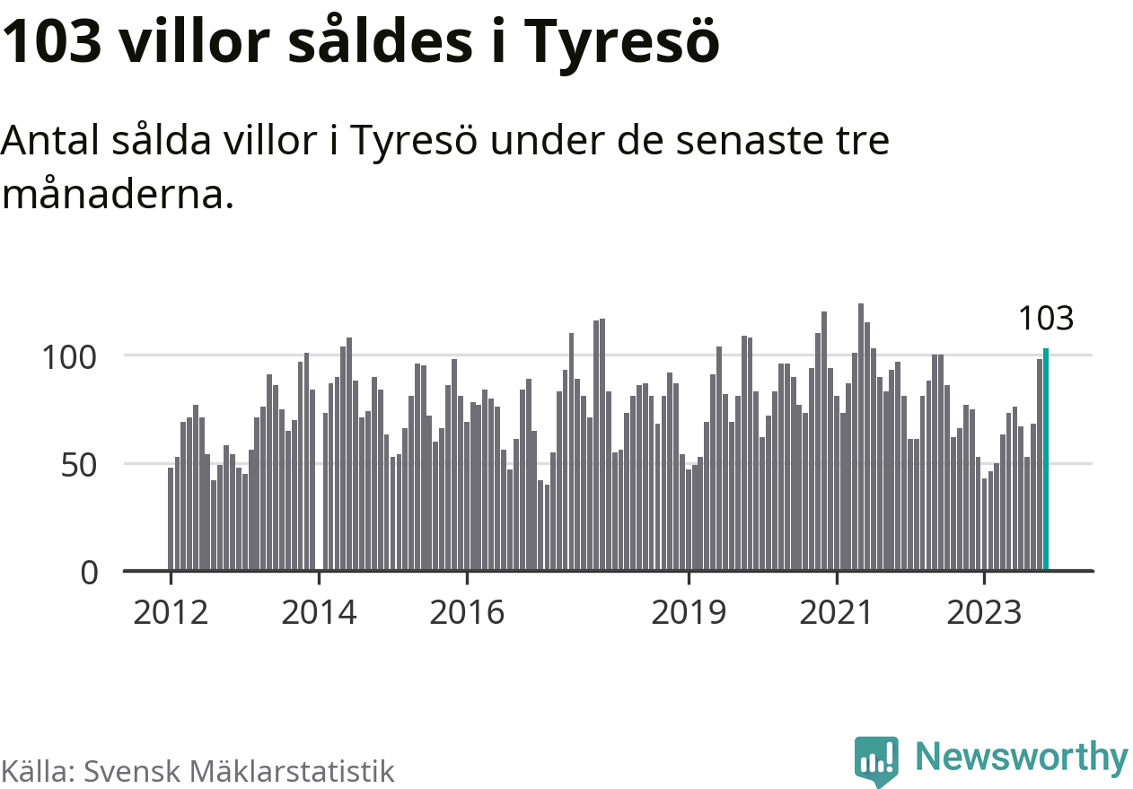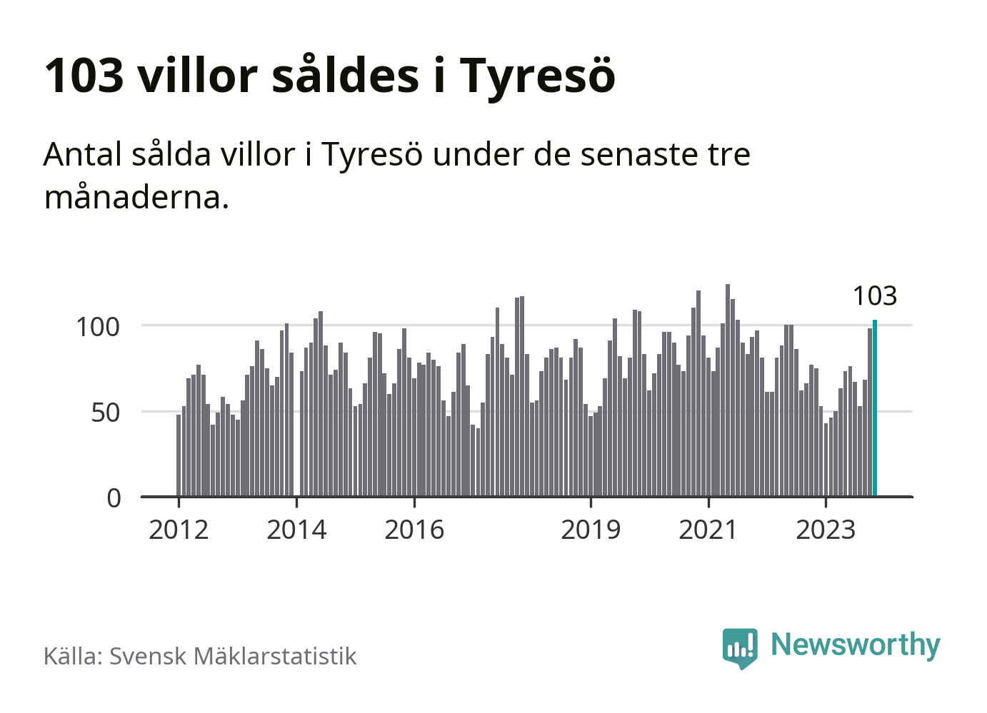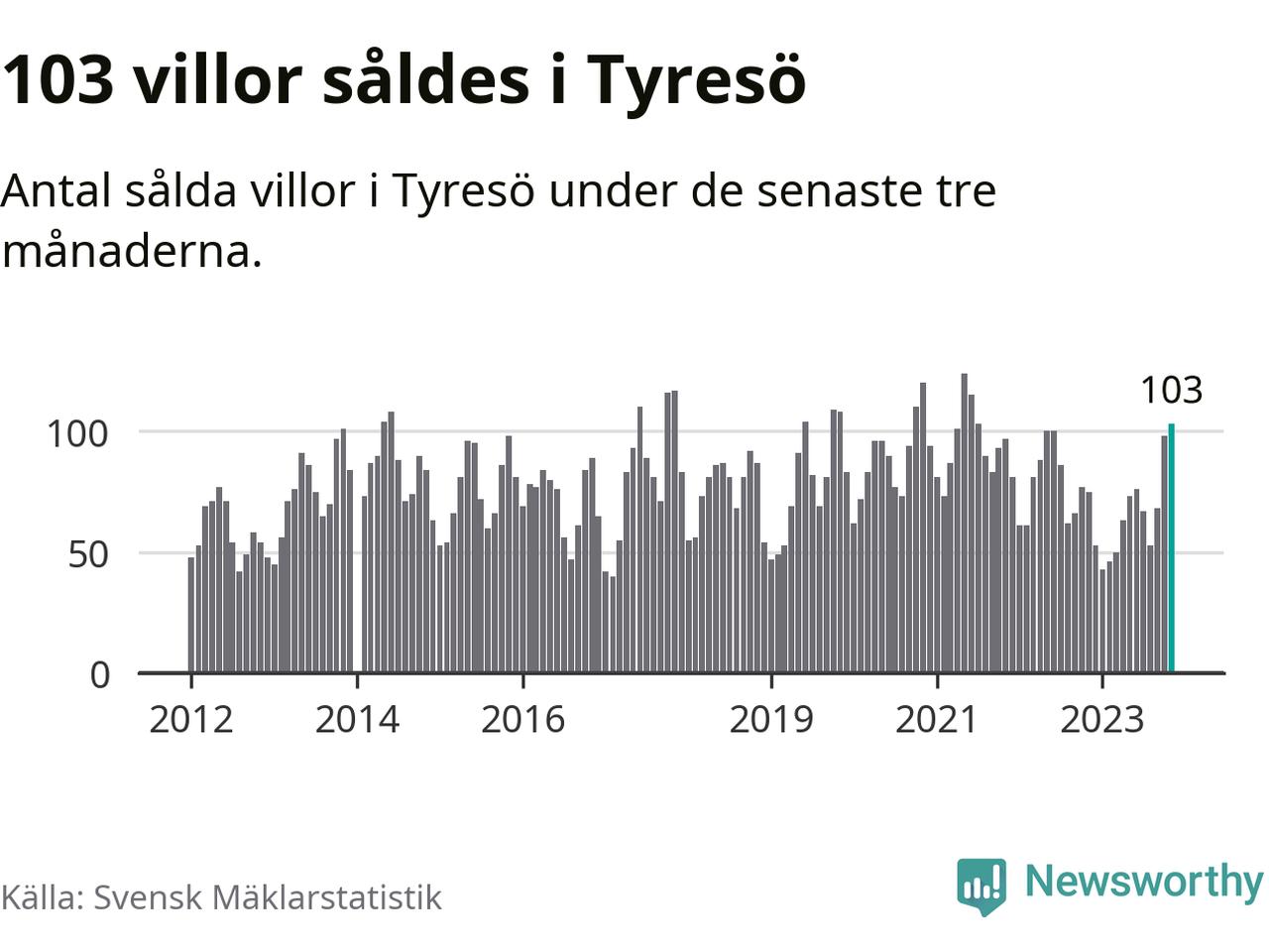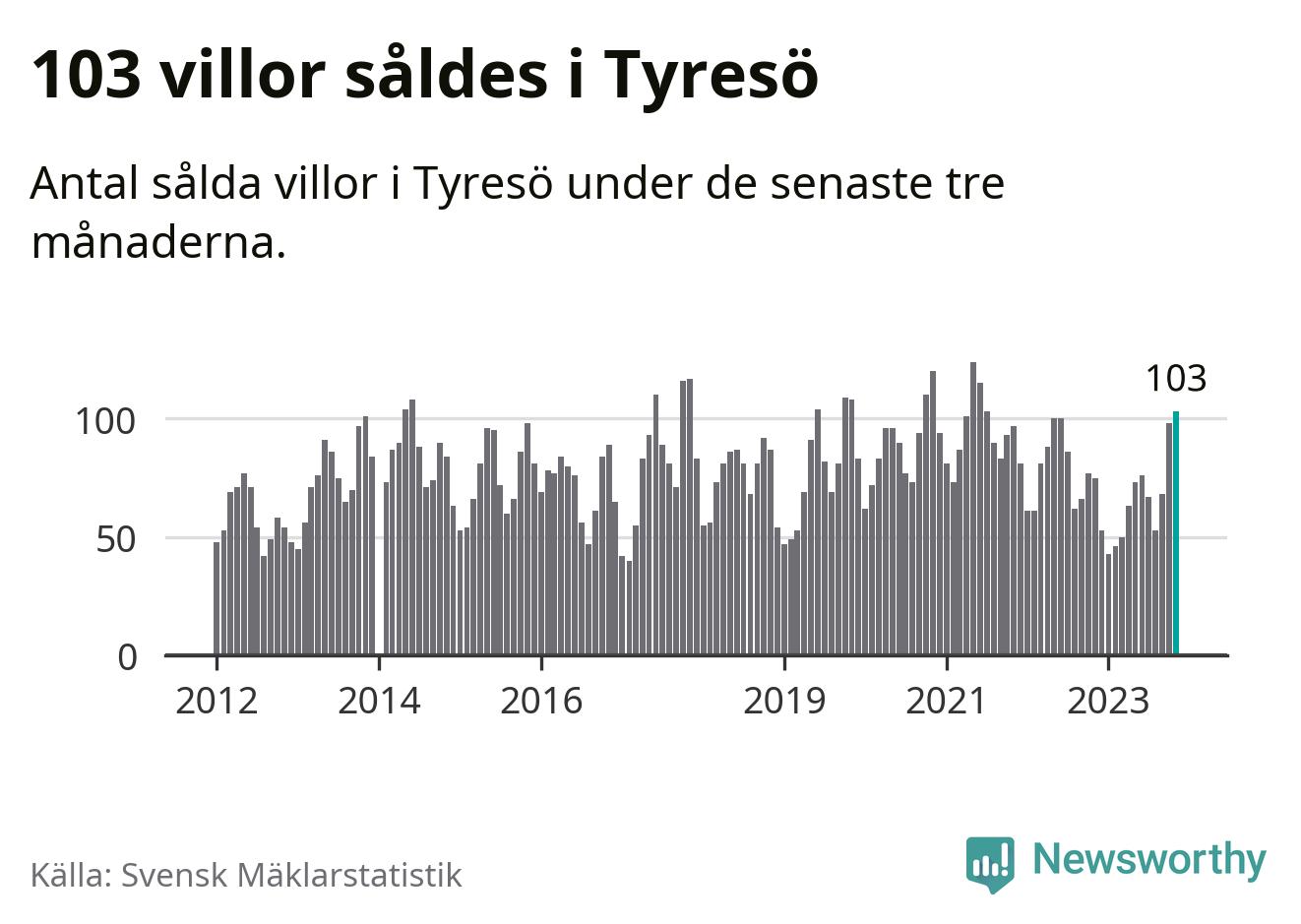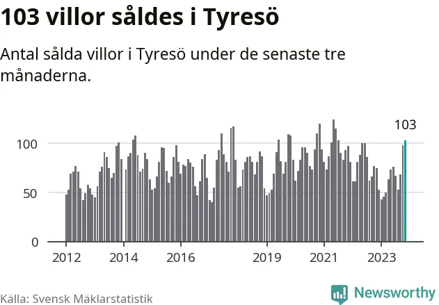 Mellan september och november såldes 103 villor i Tyresö kommun. Det är relativt många sett till aktiviteten på bostadsmarknaden i kommunen under de senaste tolv månaderna, samt det historiska snittet för den här tiden på året.
