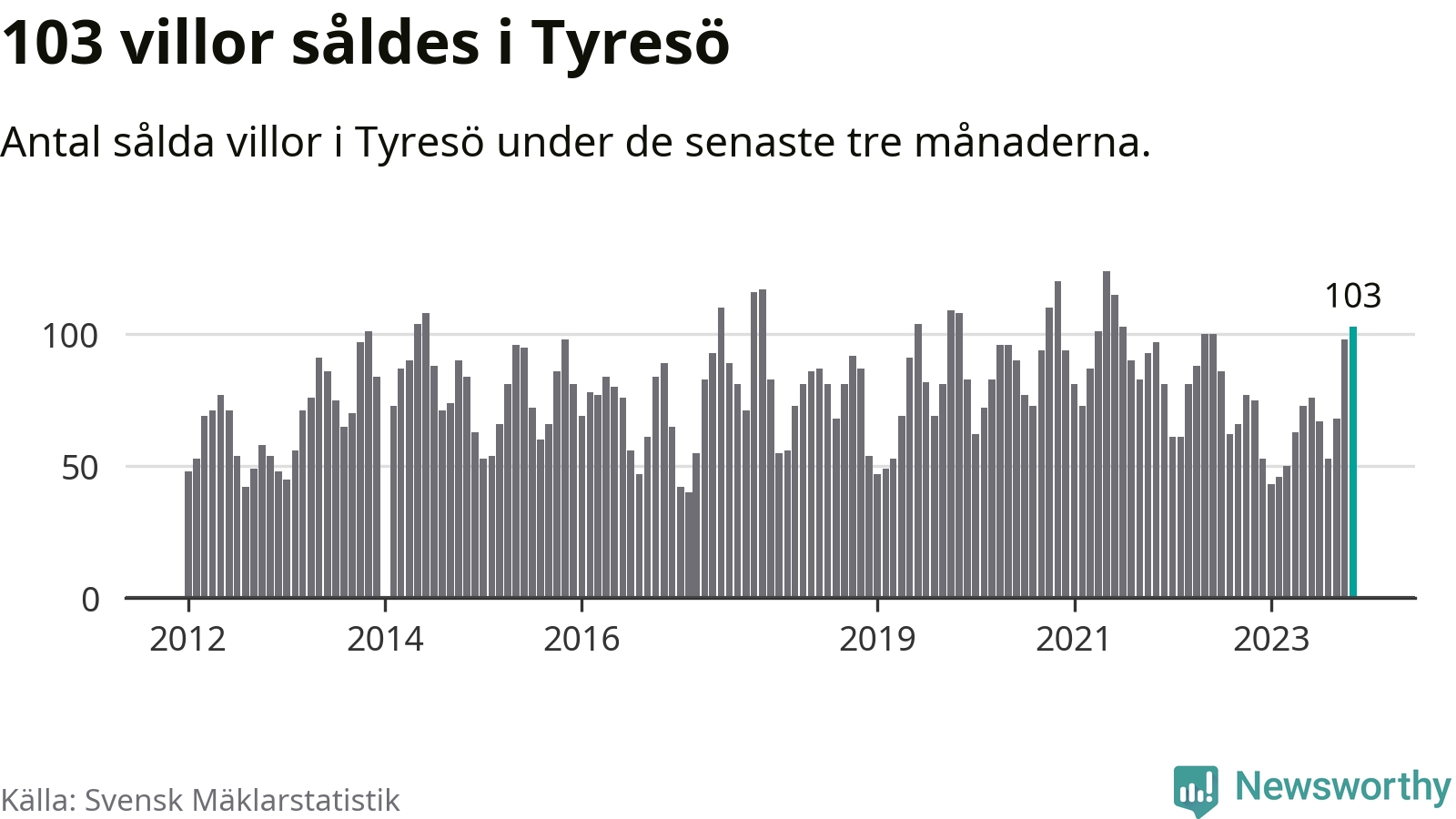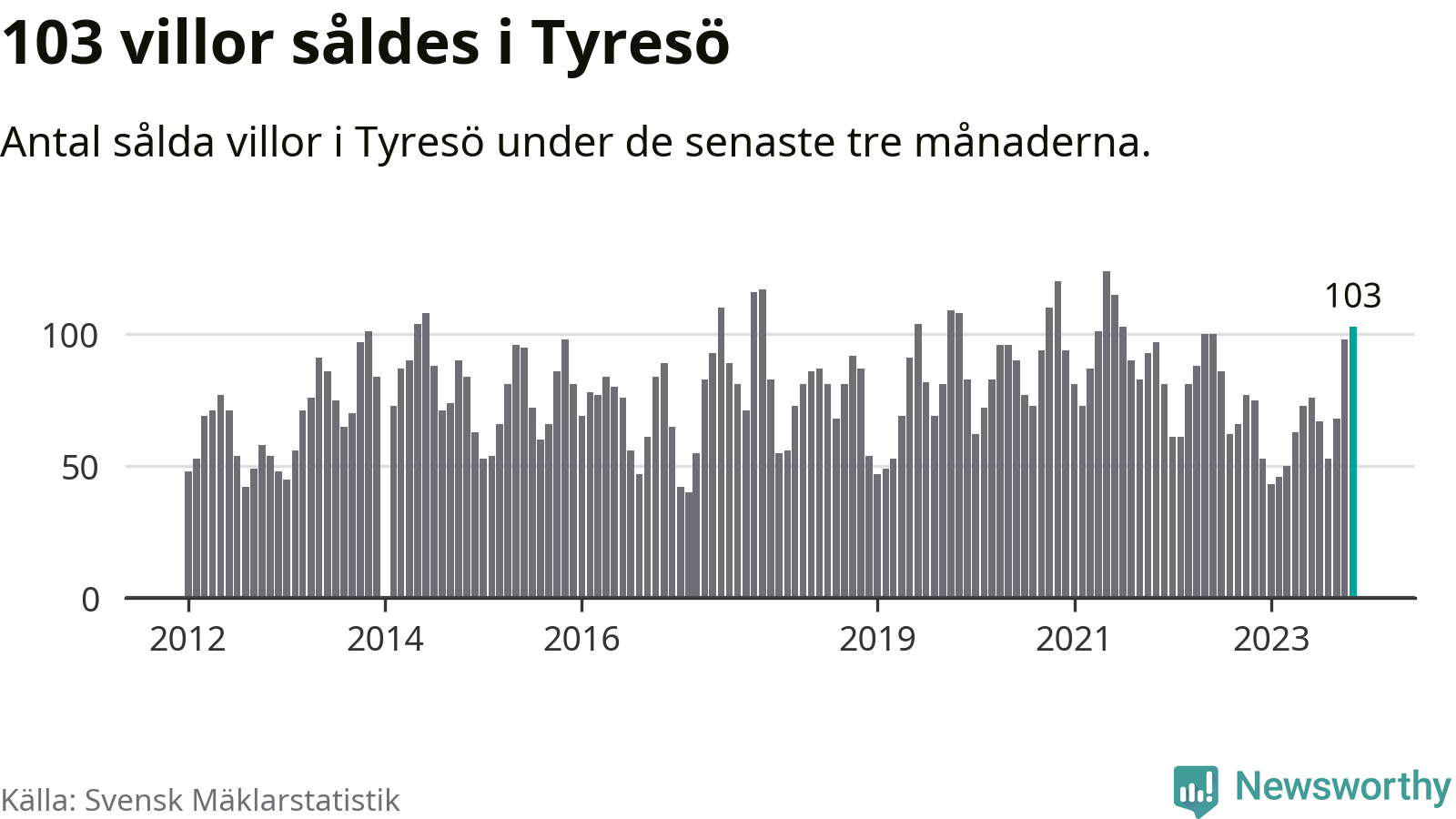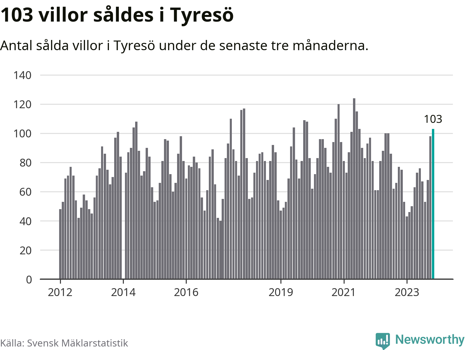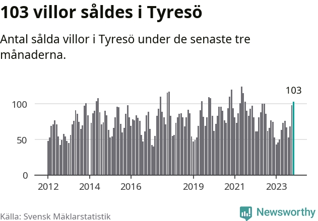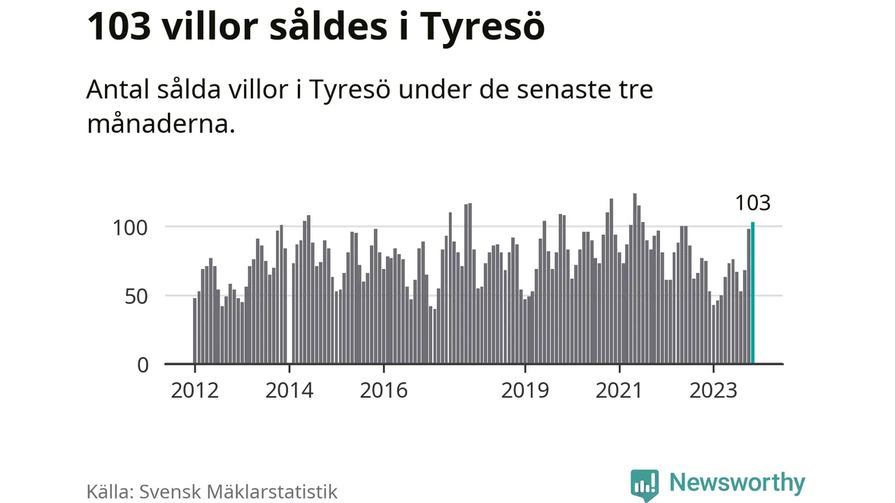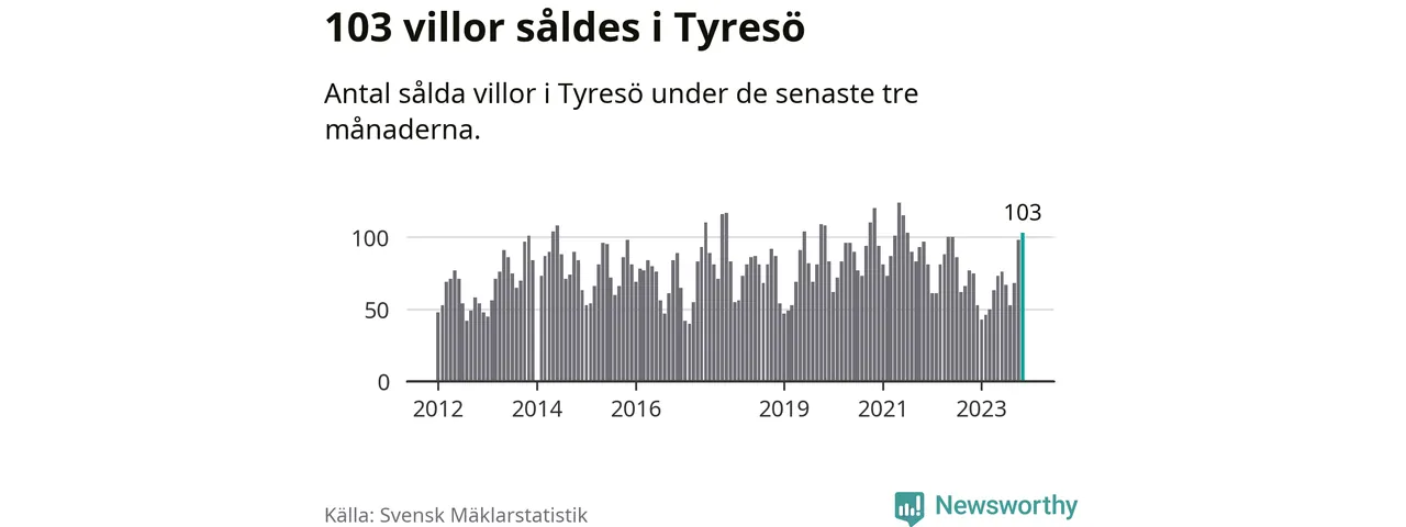 Mellan september och november såldes 103 villor i Tyresö kommun. Det är relativt många sett till aktiviteten på bostadsmarknaden i kommunen under de senaste tolv månaderna, samt det historiska snittet för den här tiden på året.