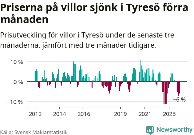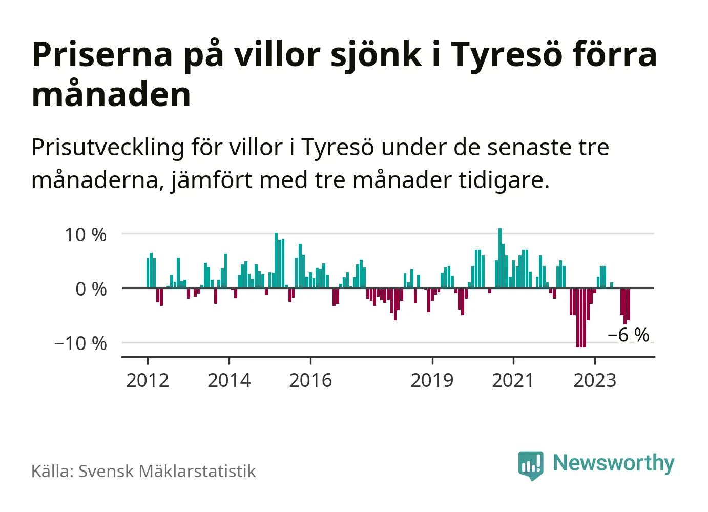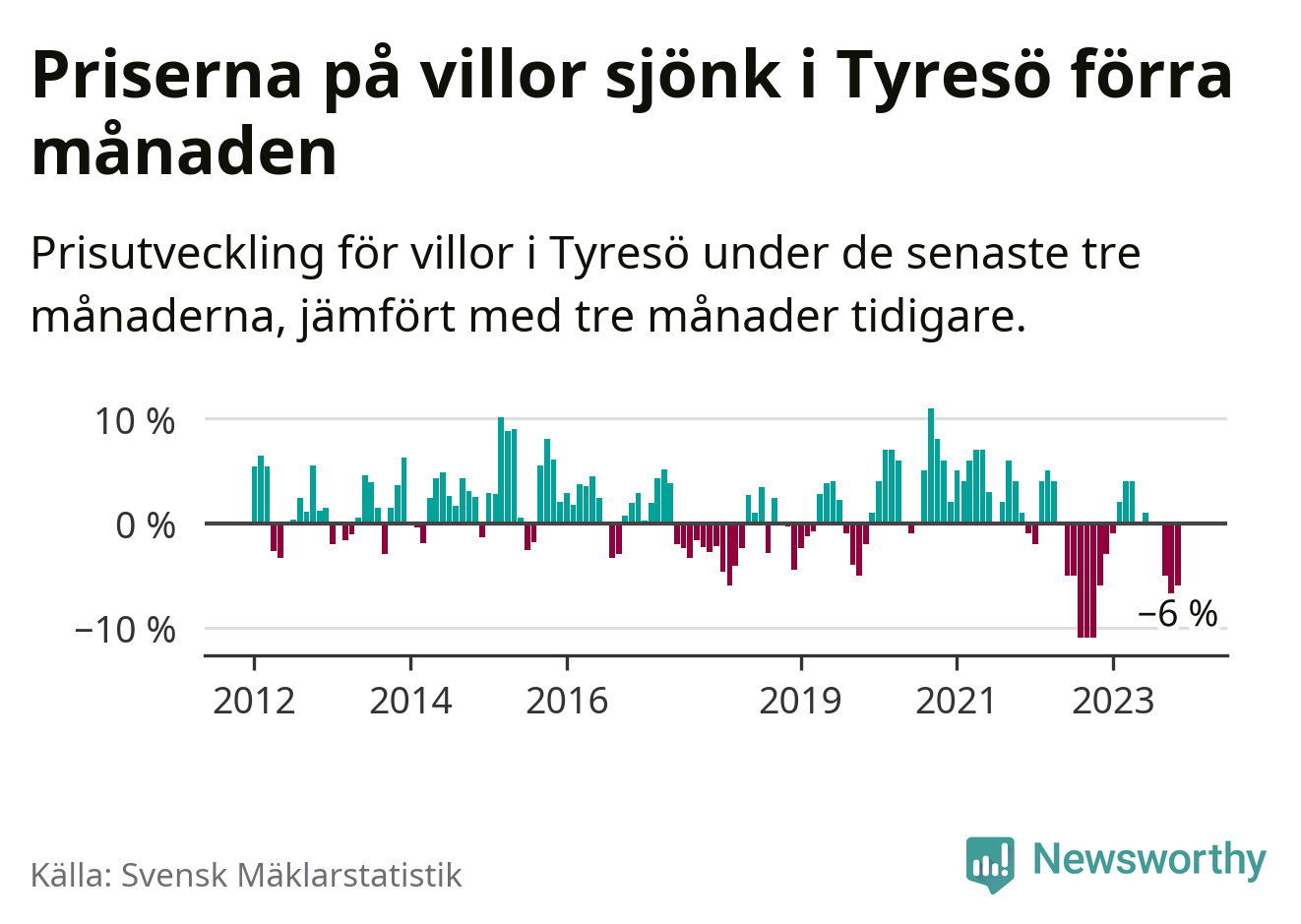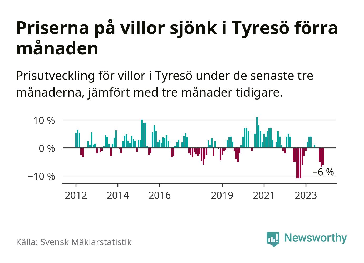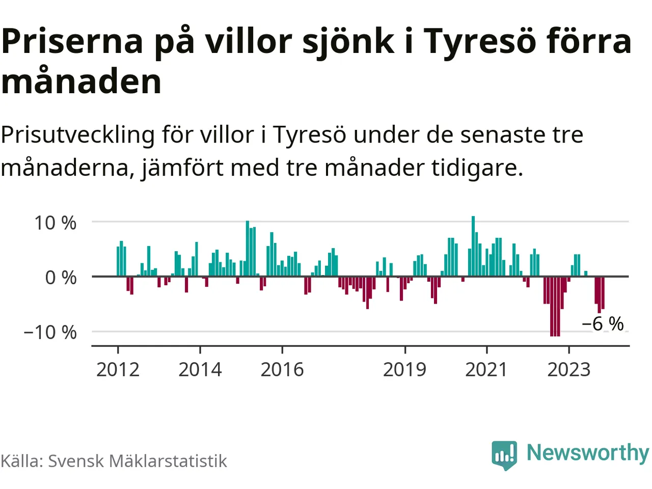 Statistiken visar även på en kännbar prisnedgång i Tyresö kommun. Medelpriset på försäljningarna av villor i kommunen var 6 procent lägre än för tre månader sedan. Även i hela Stockholms län sjunker villapriserna. I hela länet noterades en prisnedgång på 3 procent.