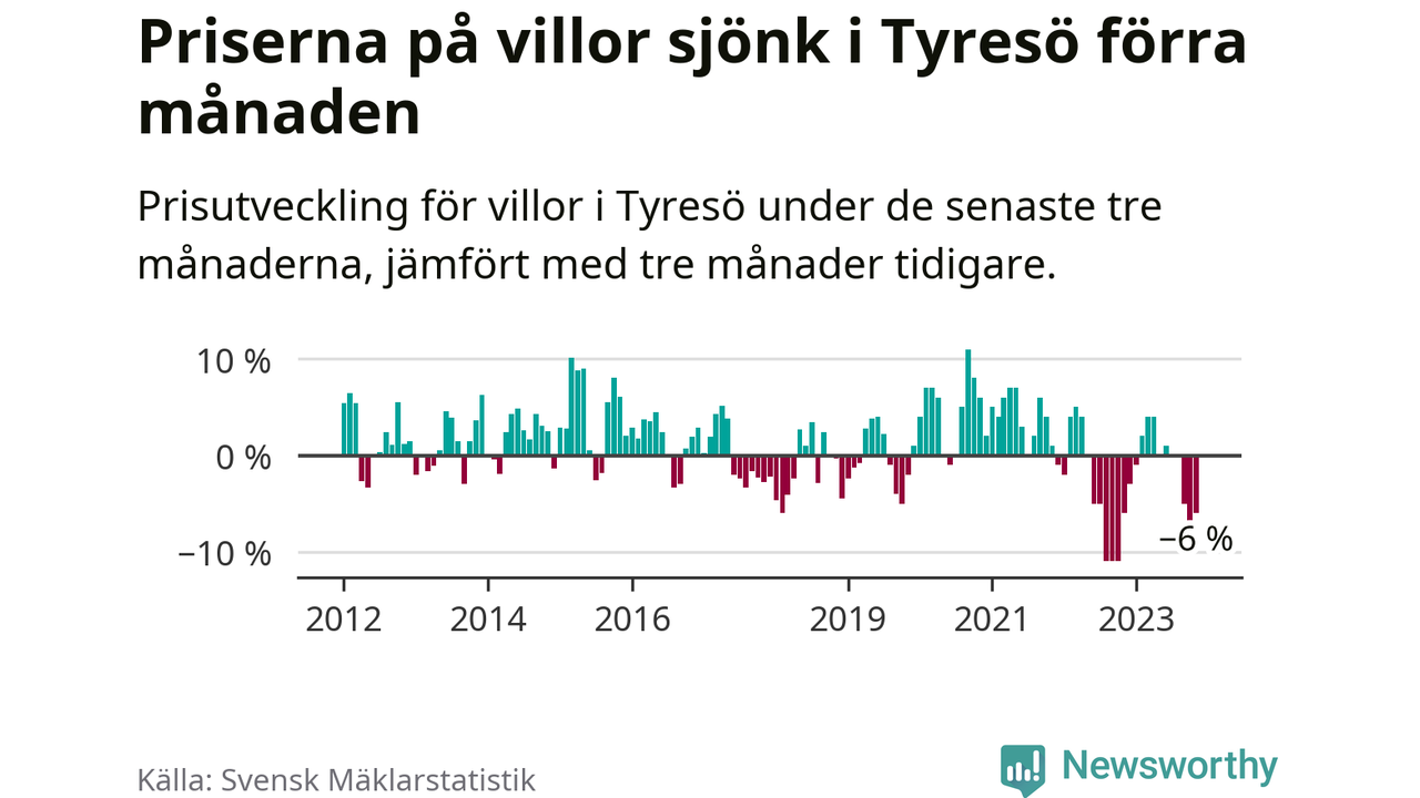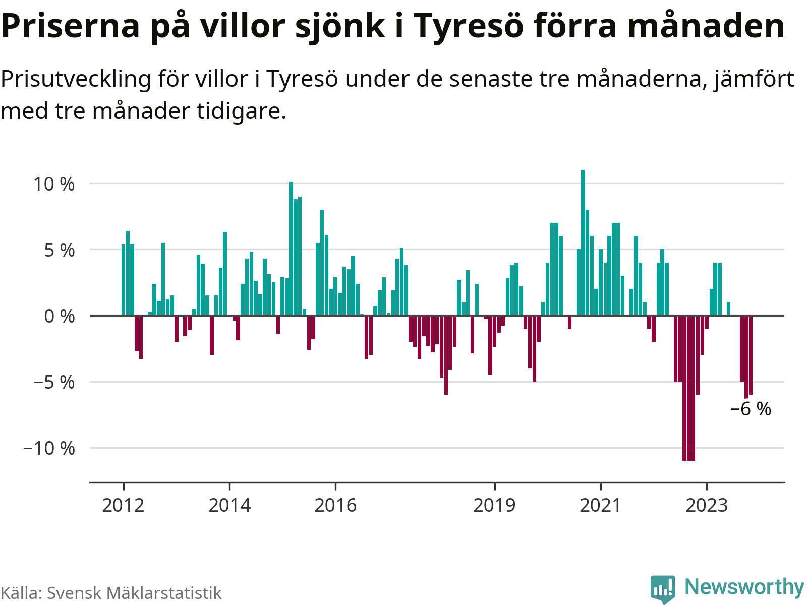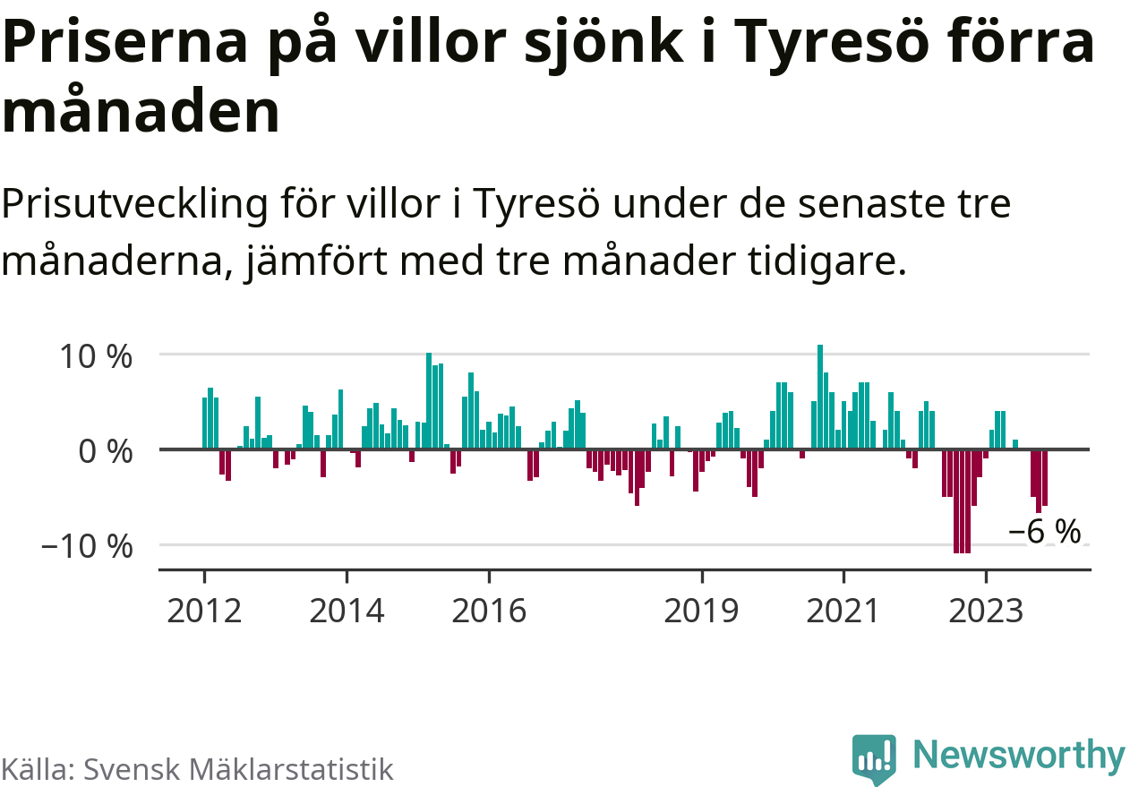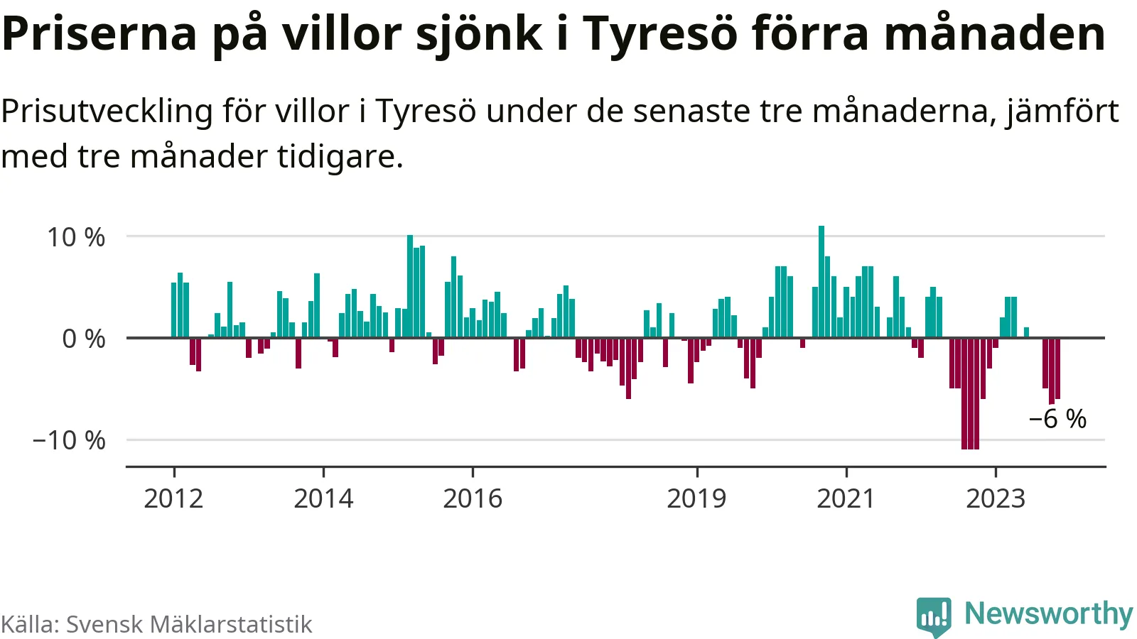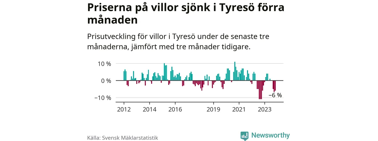 Statistiken visar även på en kännbar prisnedgång i Tyresö kommun. Medelpriset på försäljningarna av villor i kommunen var 6 procent lägre än för tre månader sedan. Även i hela Stockholms län sjunker villapriserna. I hela länet noterades en prisnedgång på 3 procent.