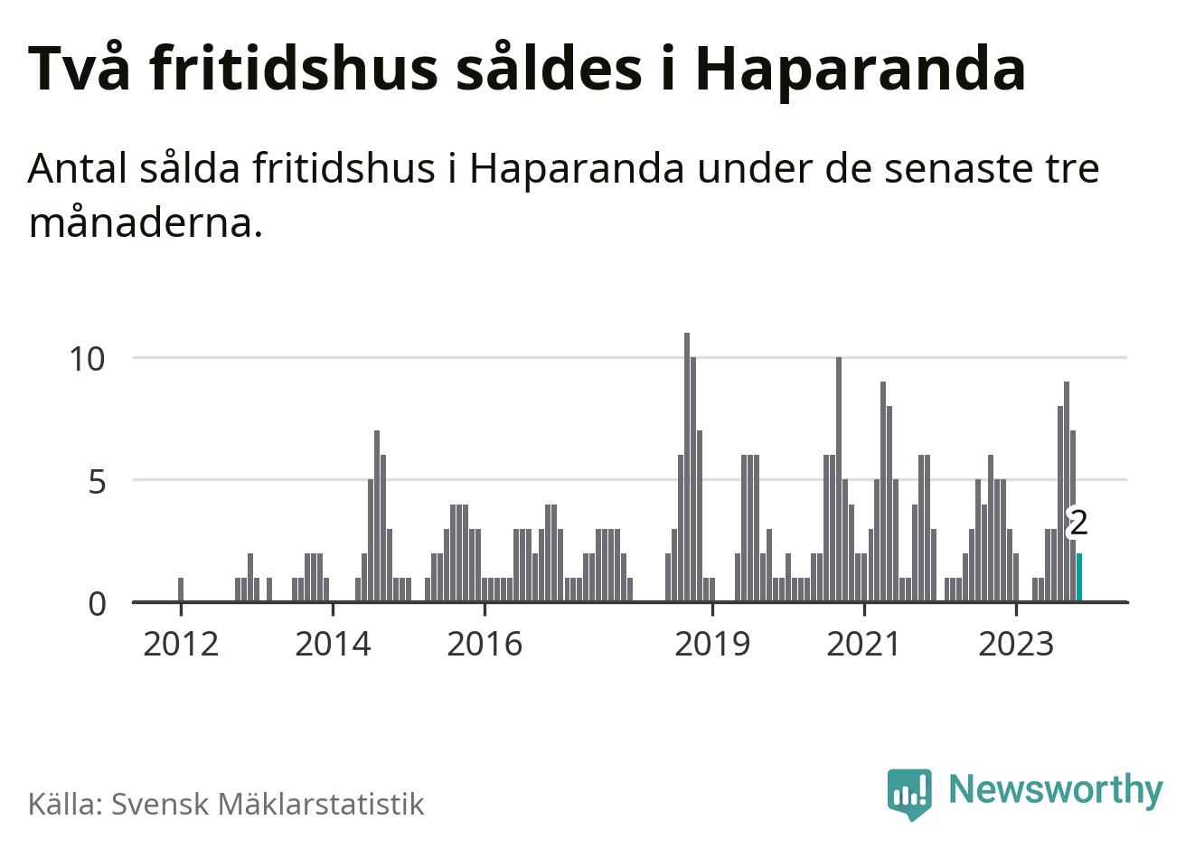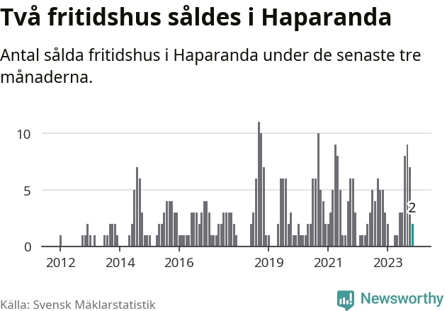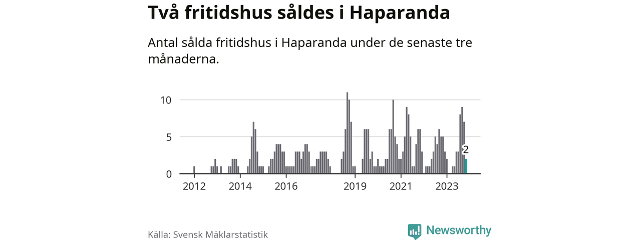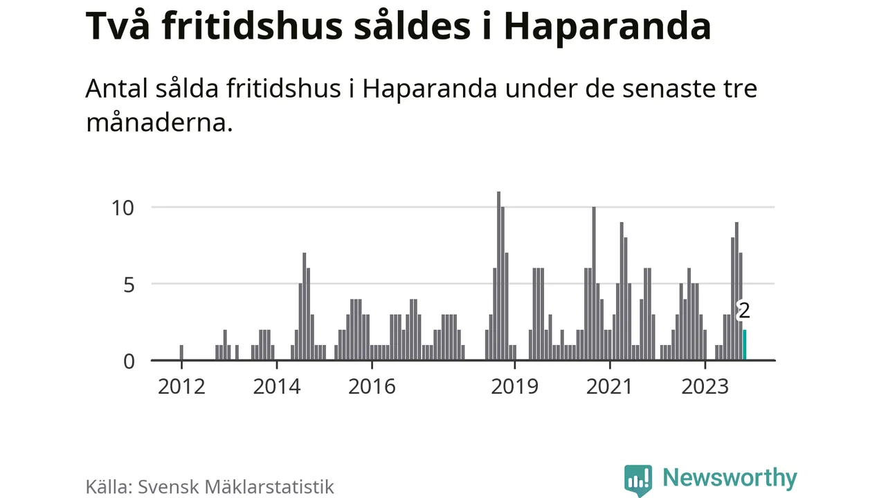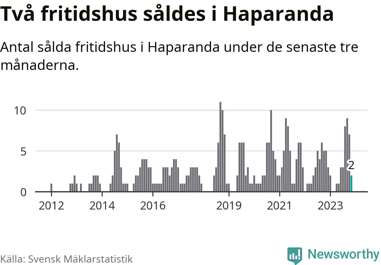 Mellan september och november gjordes sammanlagt två affärer med fritidshus i Haparanda kommun. Det kan jämföras med fem vid motsvarande tid i fjol.