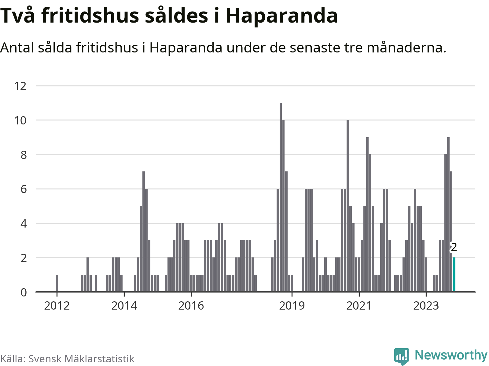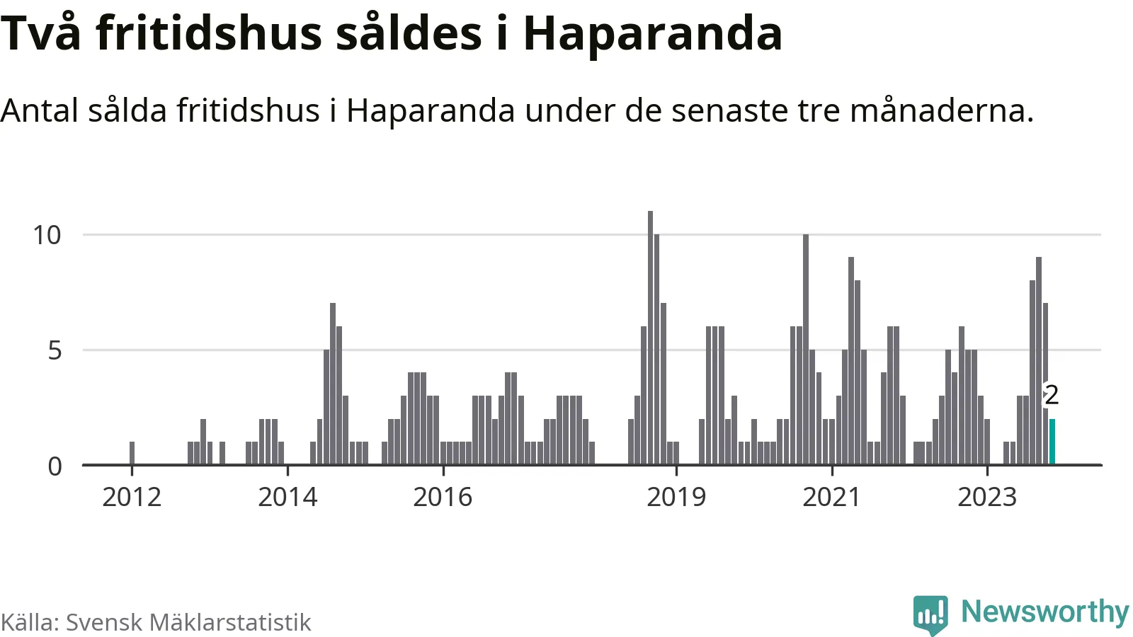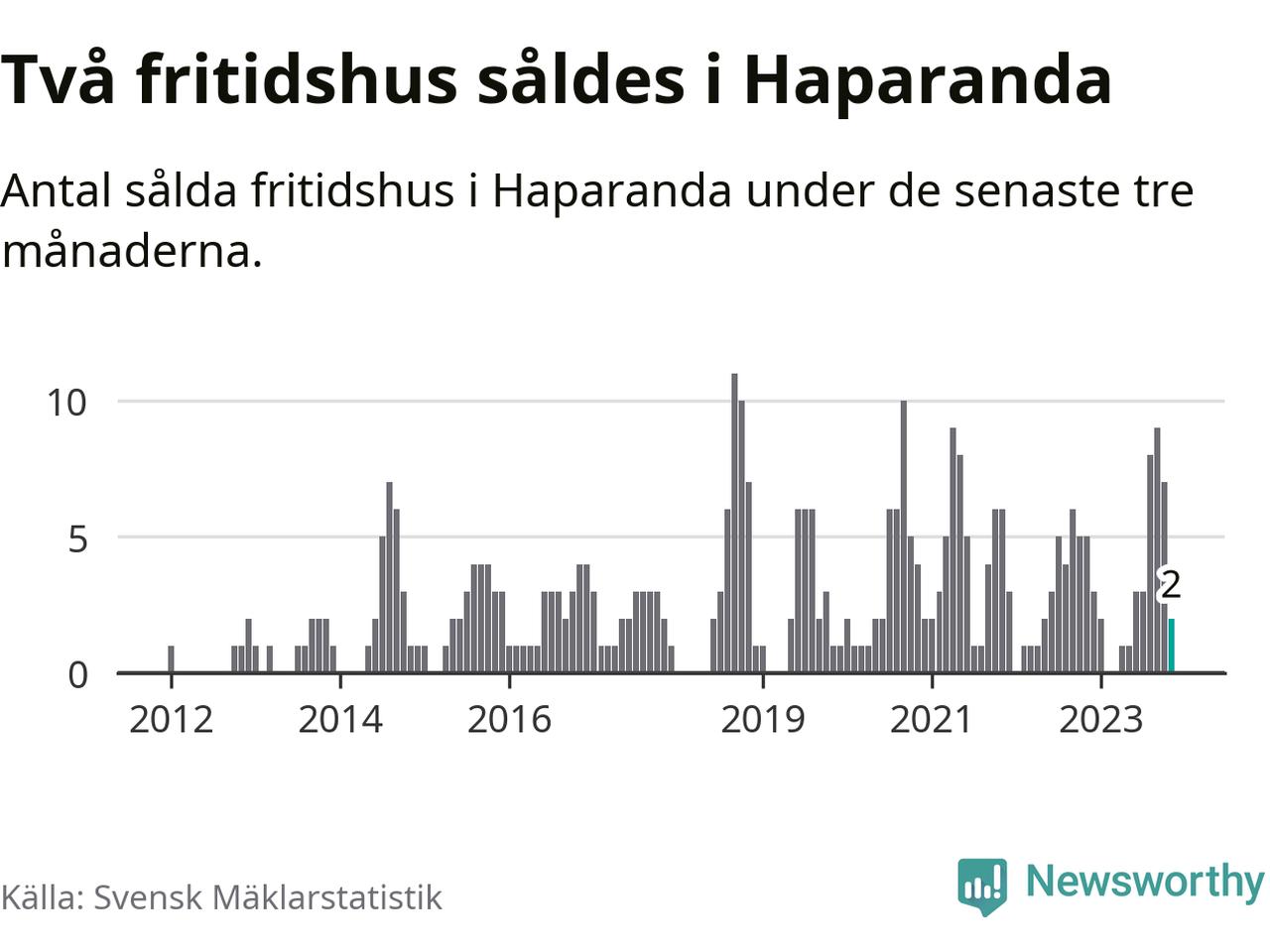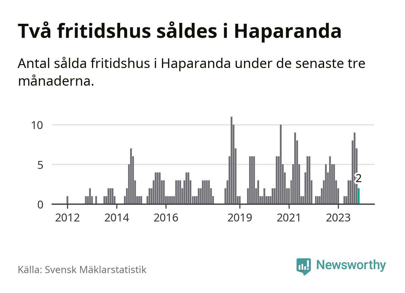 Mellan september och november gjordes sammanlagt två affärer med fritidshus i Haparanda kommun. Det kan jämföras med fem vid motsvarande tid i fjol.