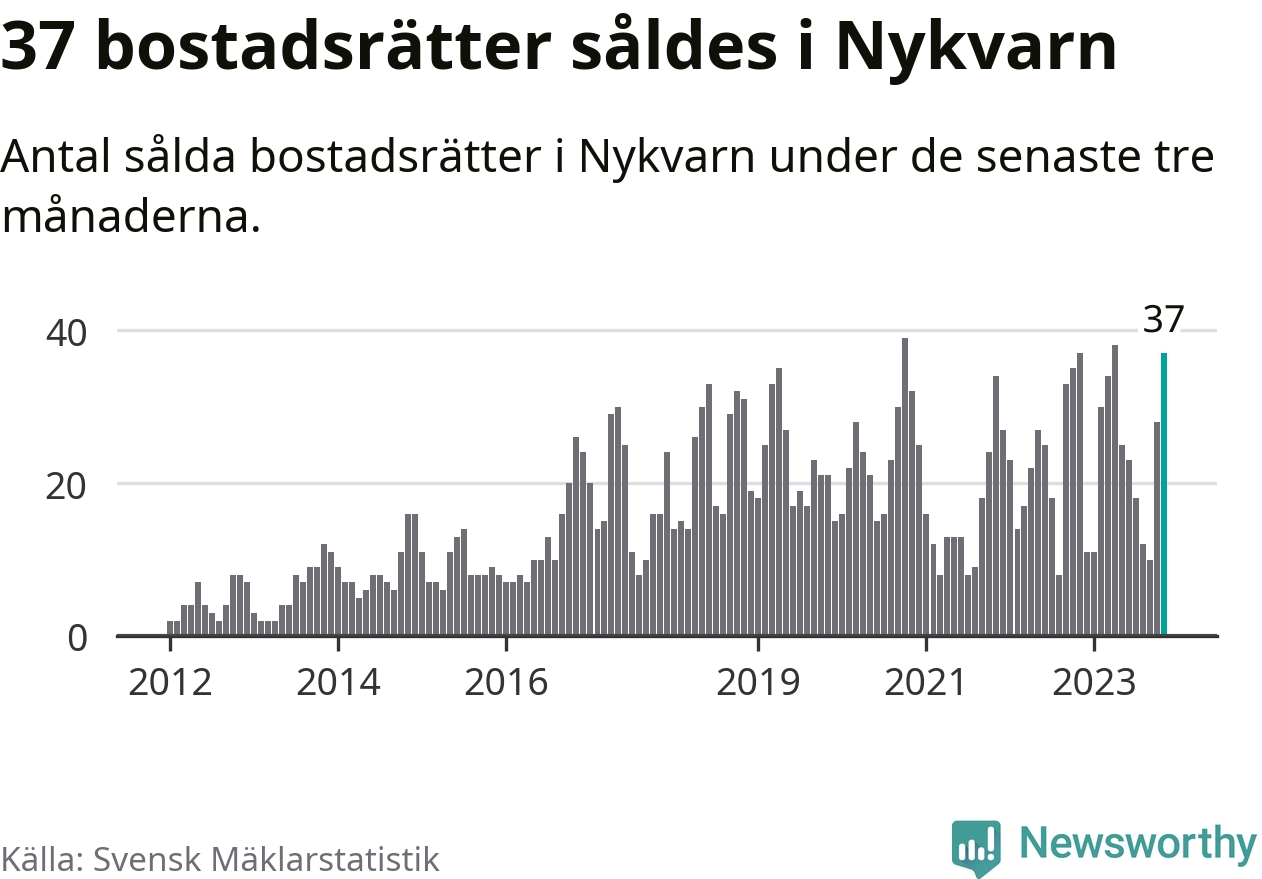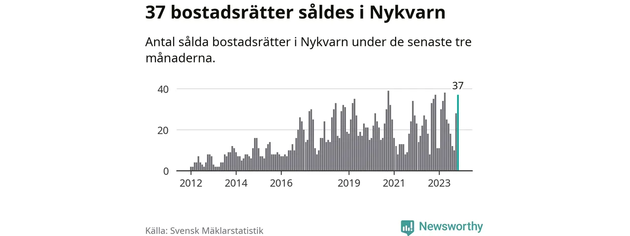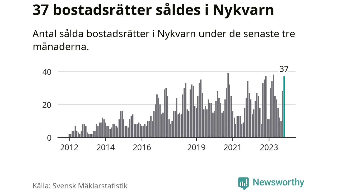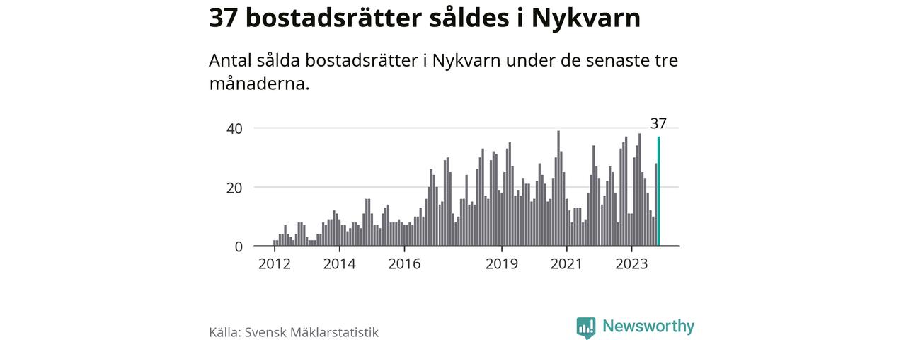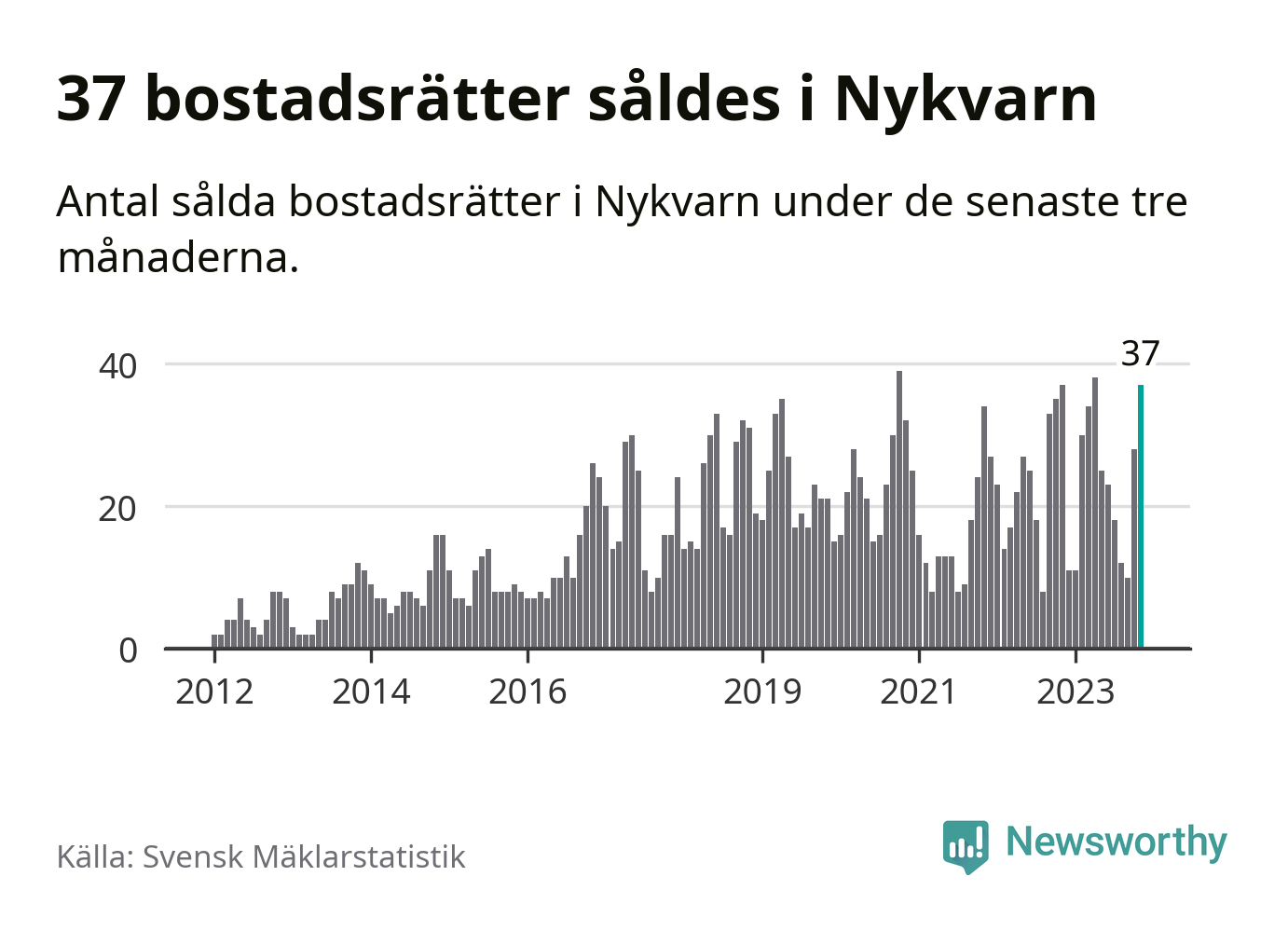 Mellan september och november gjordes sammanlagt 37 affärer med bostadsrätter i Nykvarns kommun. Det är lika många affärer som vid motsvarande tid i fjol.