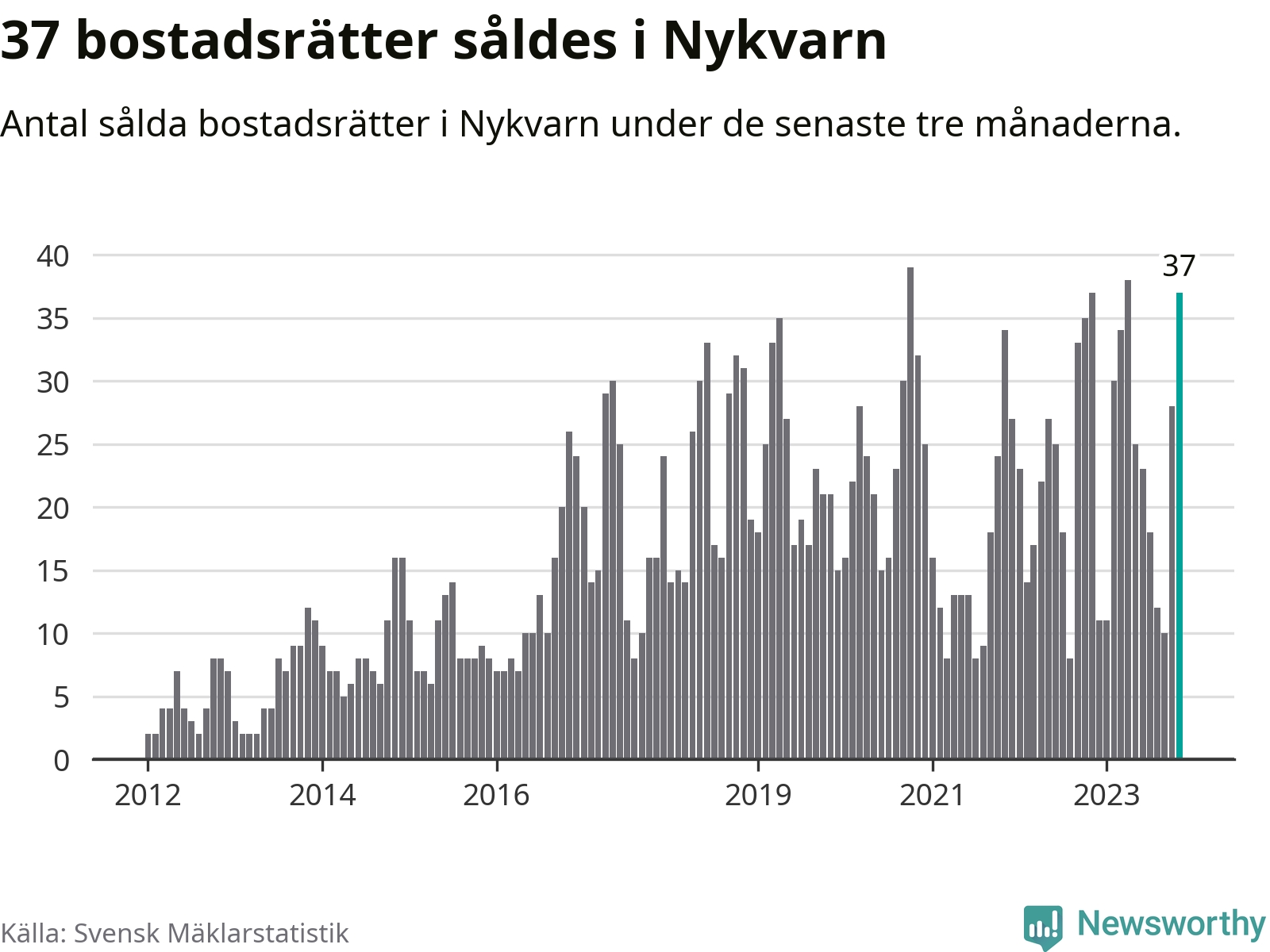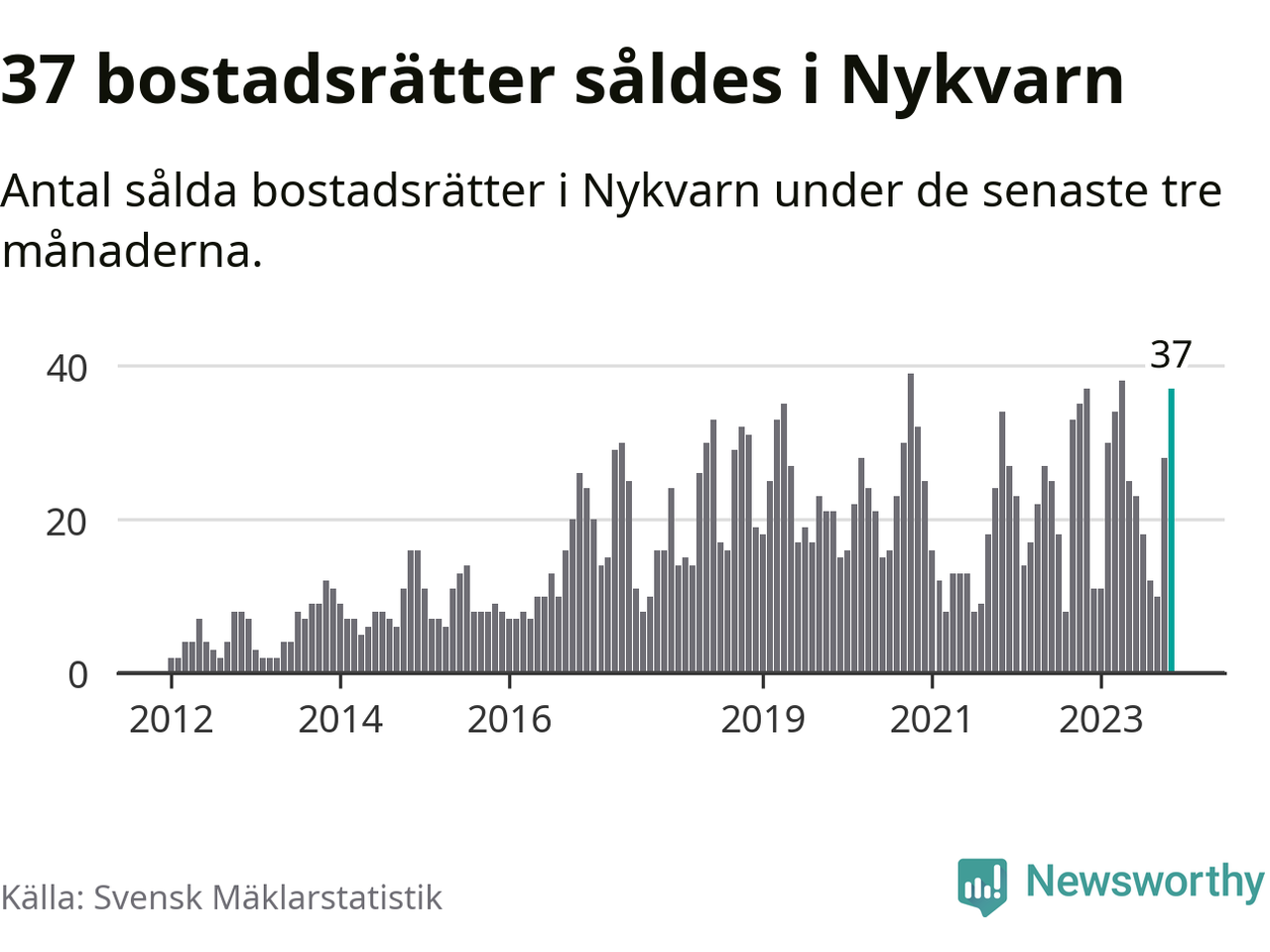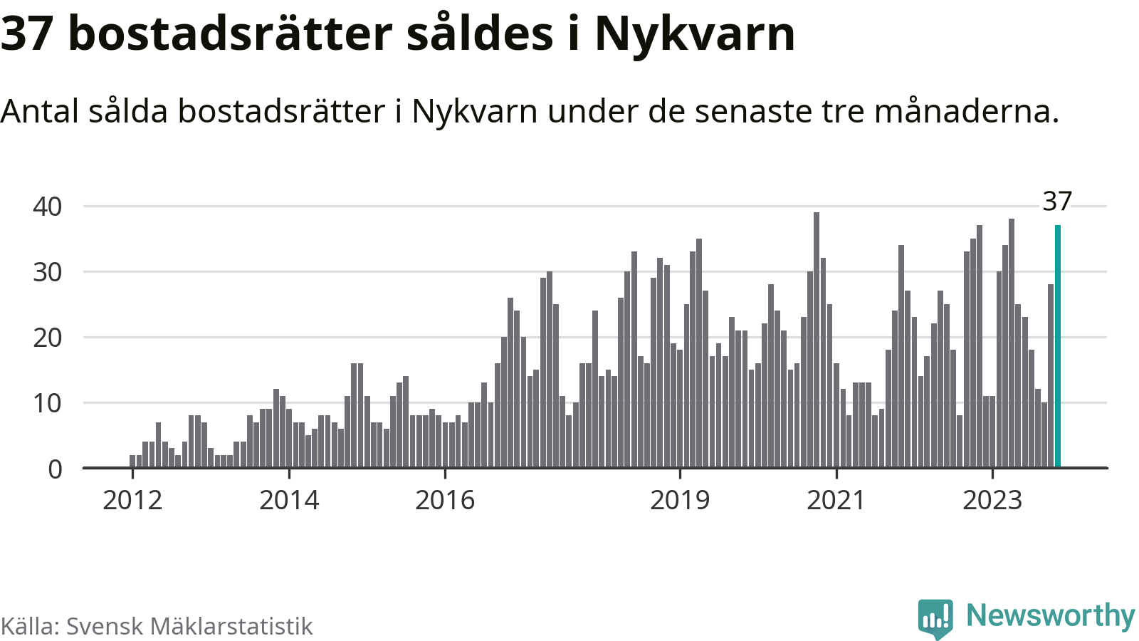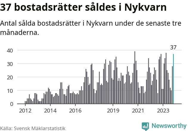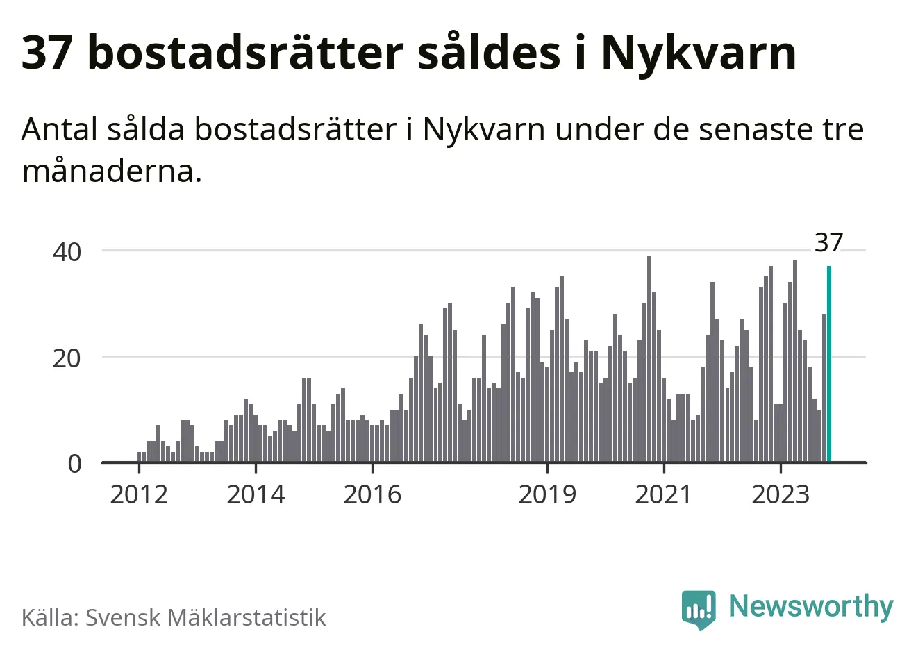 Mellan september och november gjordes sammanlagt 37 affärer med bostadsrätter i Nykvarns kommun. Det är lika många affärer som vid motsvarande tid i fjol.