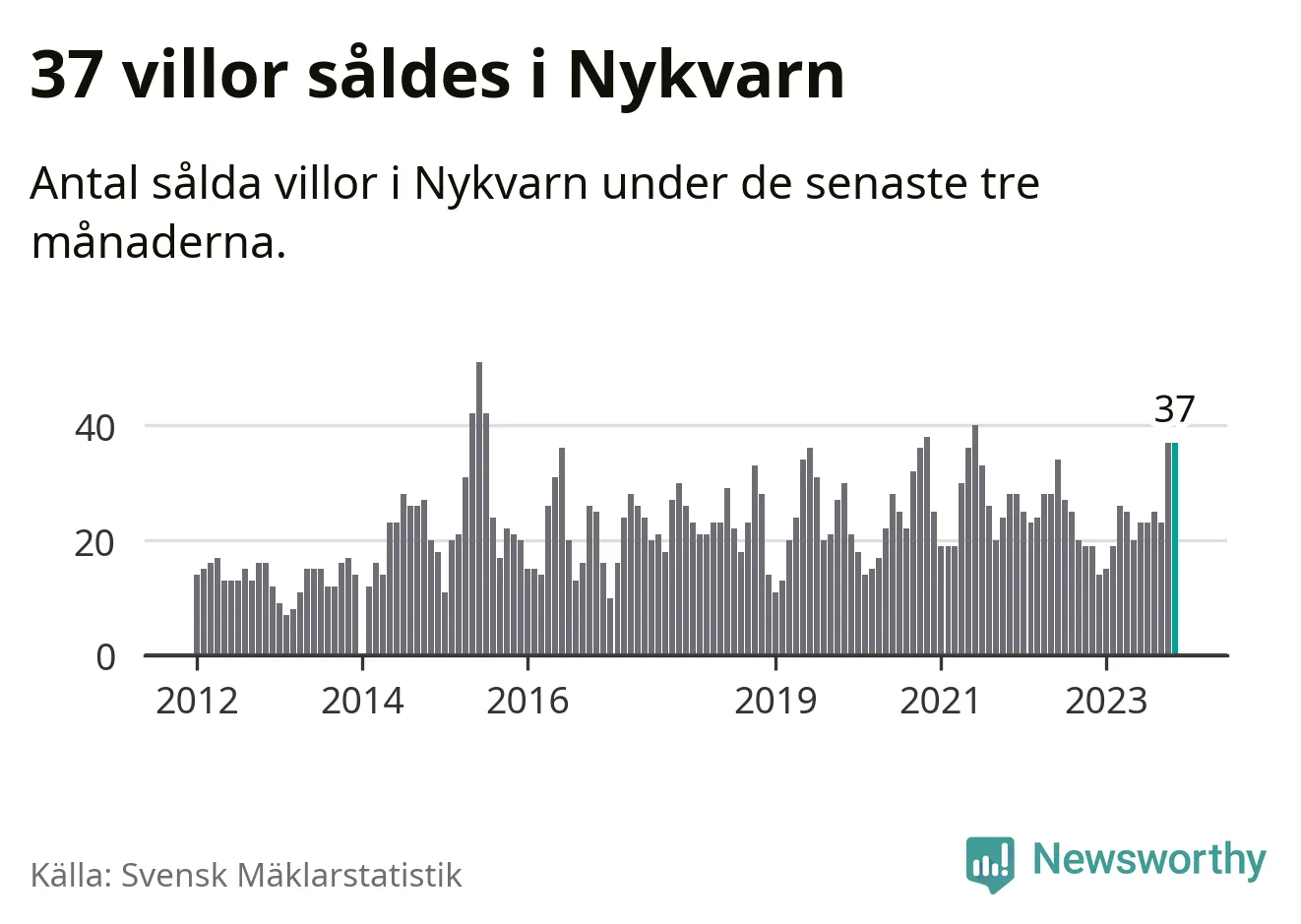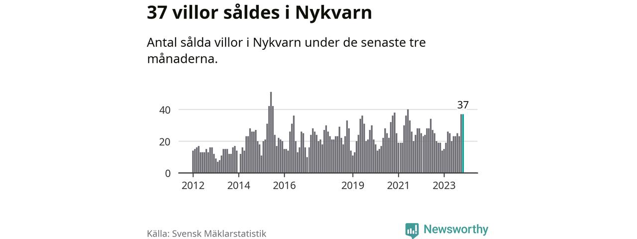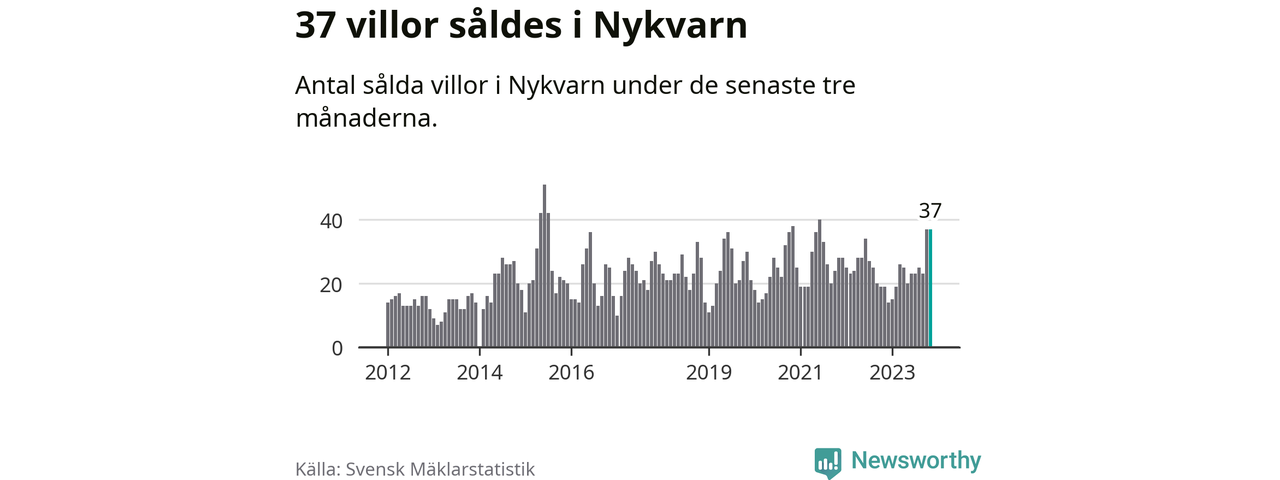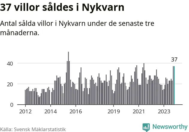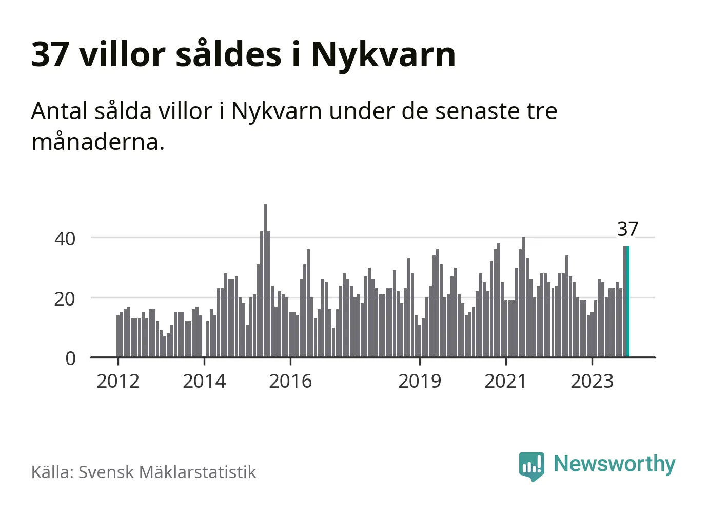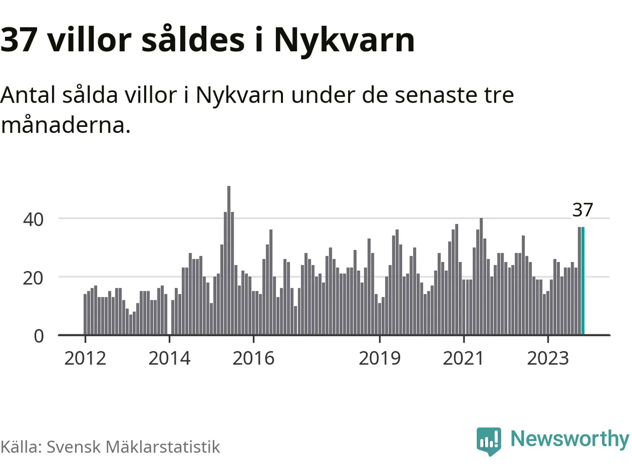 Mellan september och november såldes 37 villor i Nykvarns kommun. Det är relativt många sett till aktiviteten på bostadsmarknaden i kommunen under de senaste tolv månaderna, samt det historiska snittet för den här tiden på året.