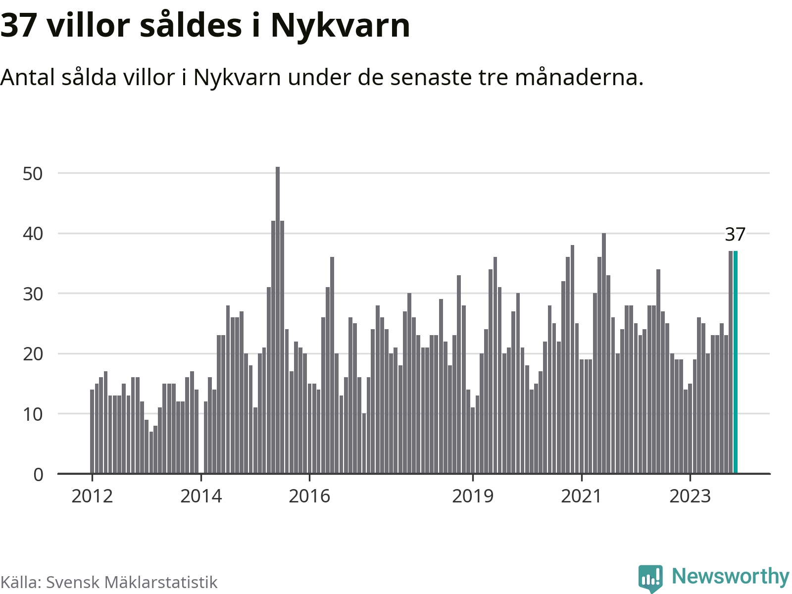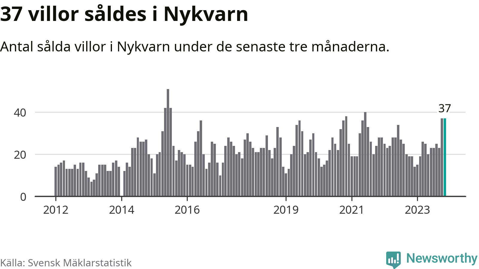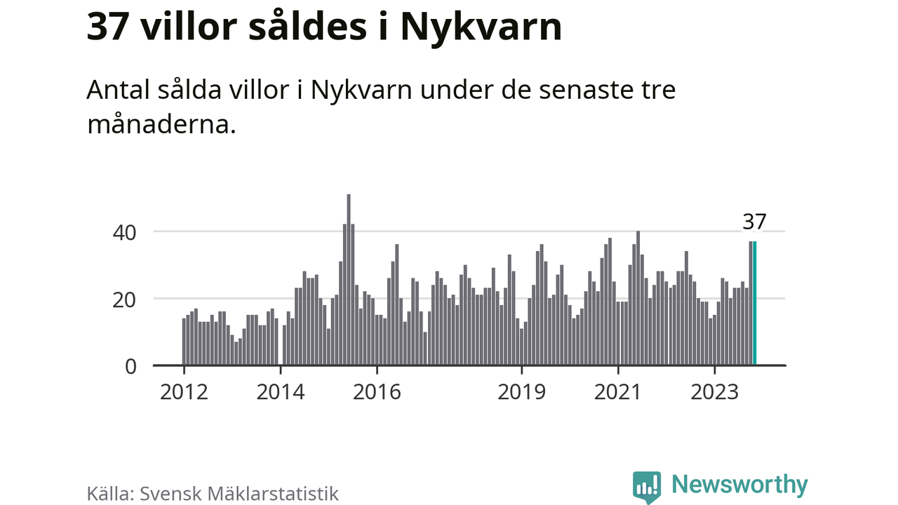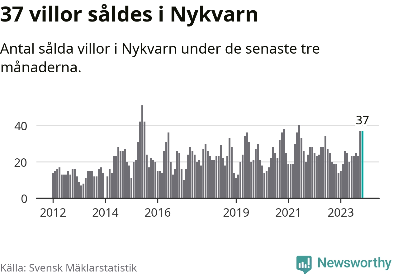 Mellan september och november såldes 37 villor i Nykvarns kommun. Det är relativt många sett till aktiviteten på bostadsmarknaden i kommunen under de senaste tolv månaderna, samt det historiska snittet för den här tiden på året.