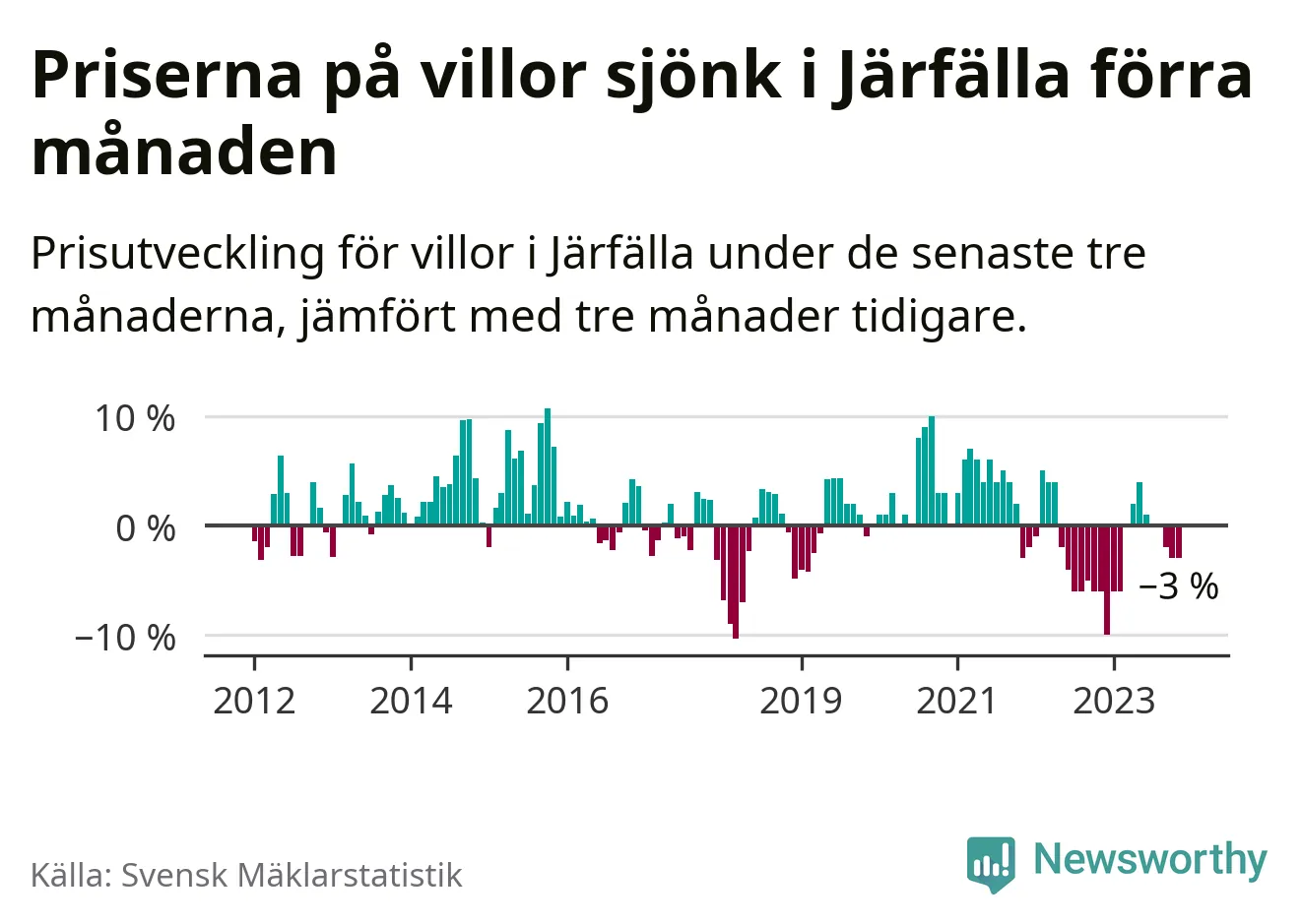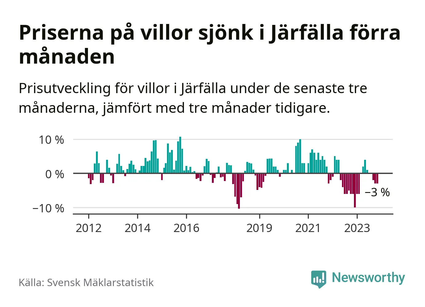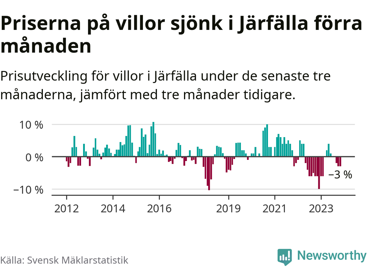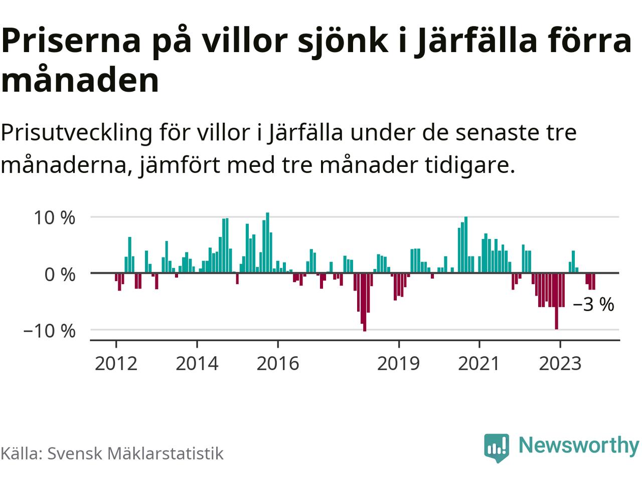 Villapriserna har gått ner i Järfälla kommun. Medelpriset på försäljningarna under de senaste tre månaderna visar på en nedgång med 3 procent.