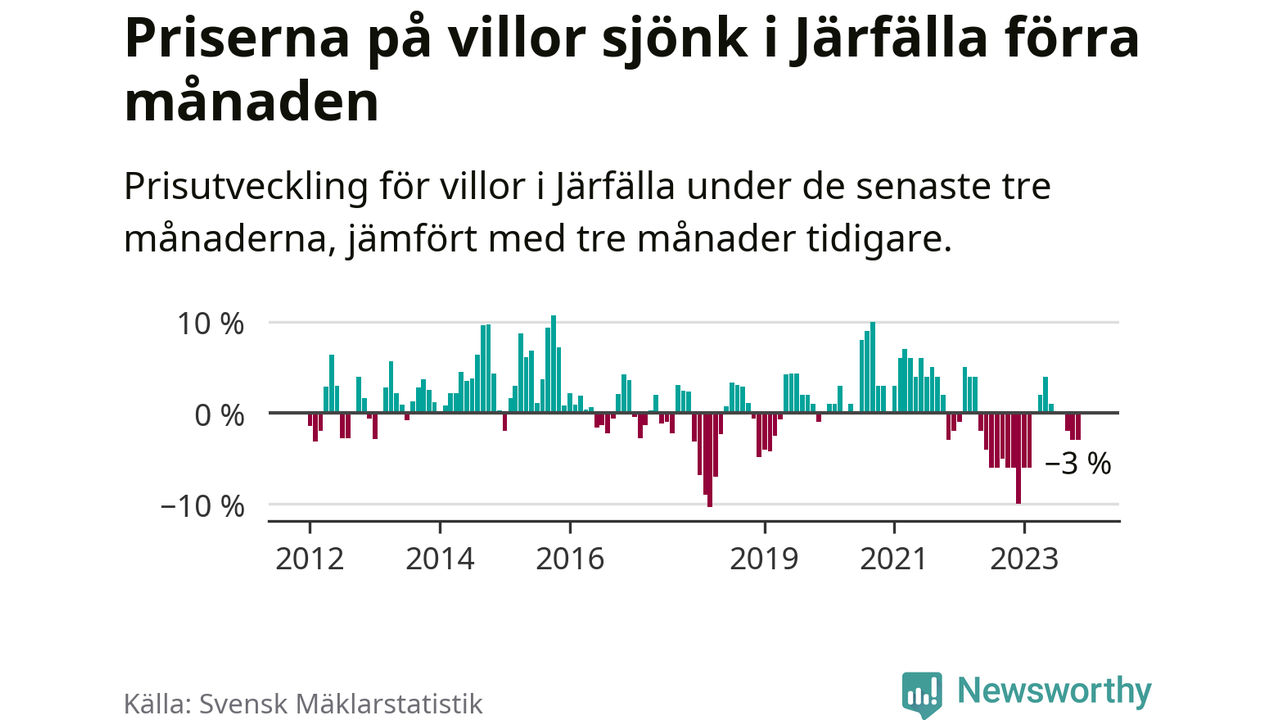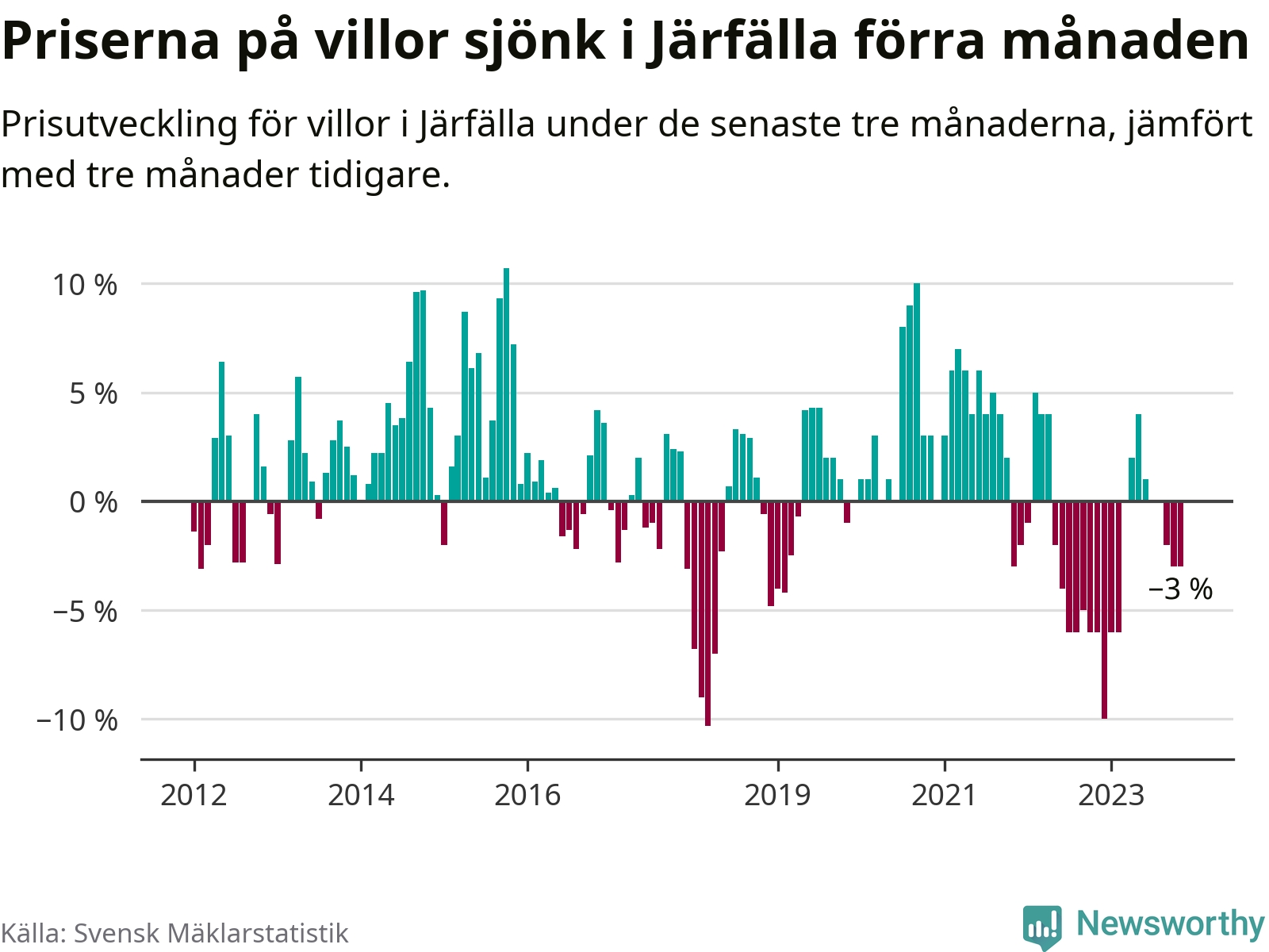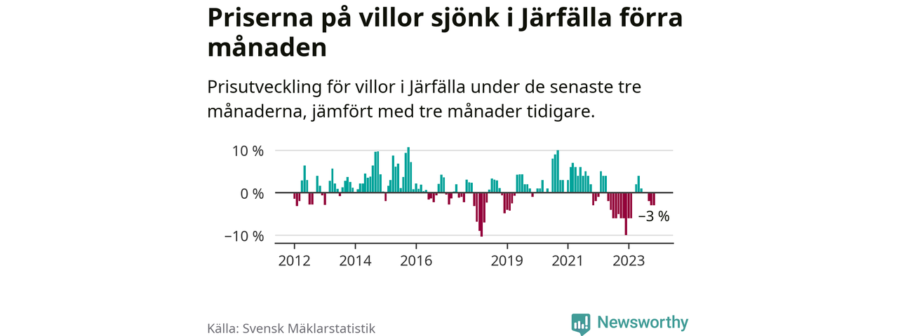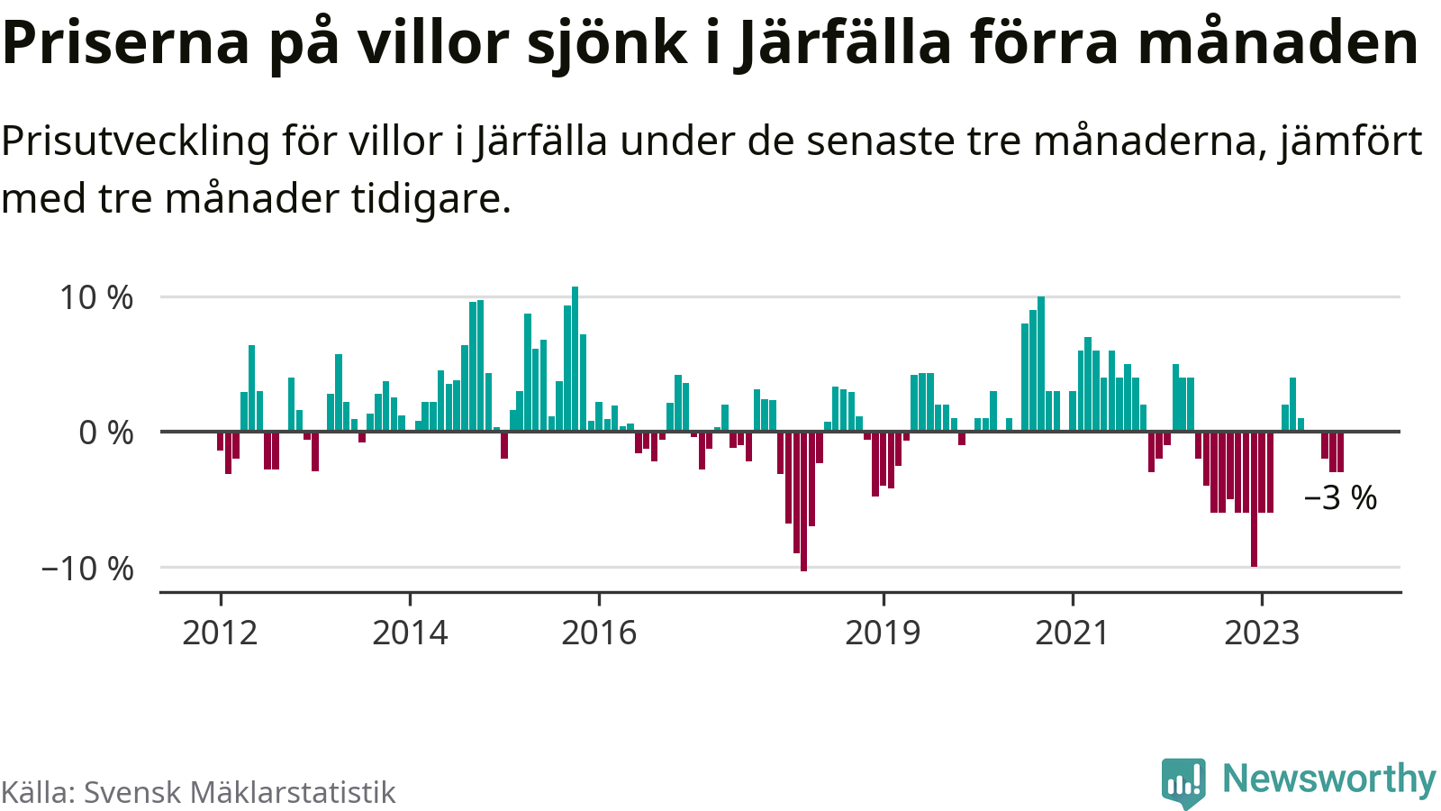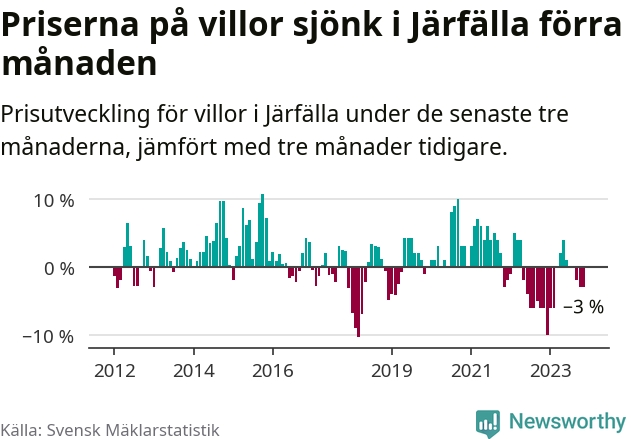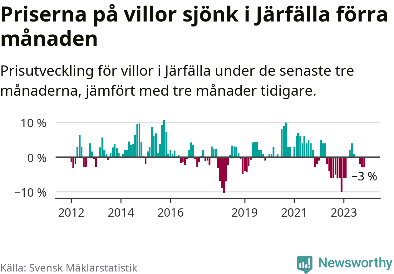 Villapriserna har gått ner i Järfälla kommun. Medelpriset på försäljningarna under de senaste tre månaderna visar på en nedgång med 3 procent.