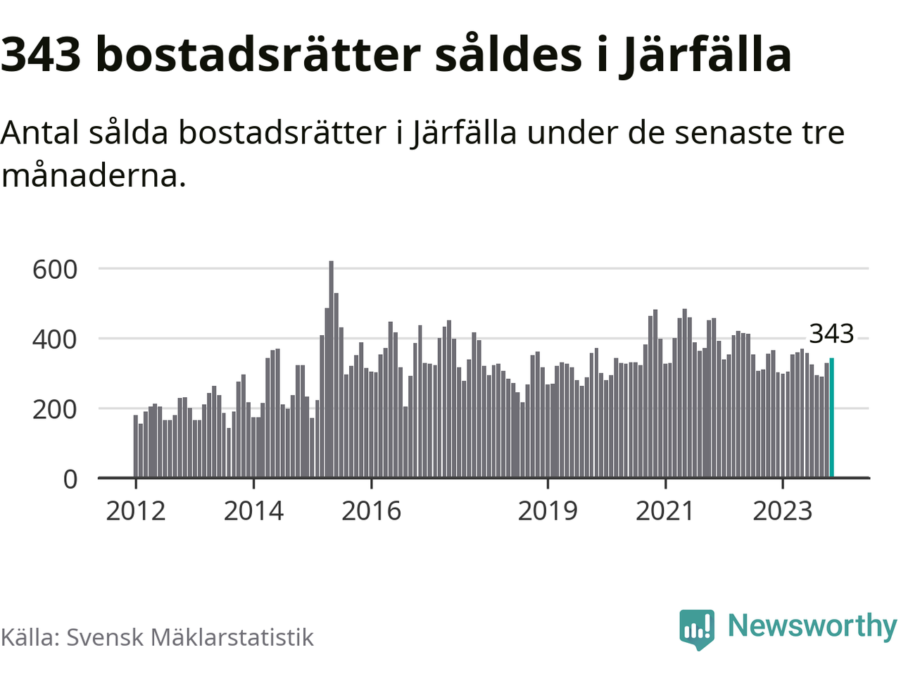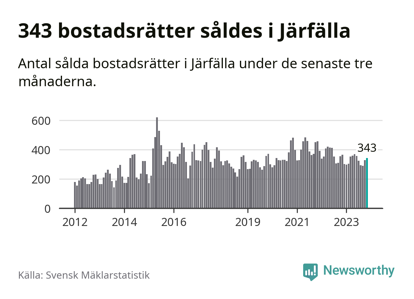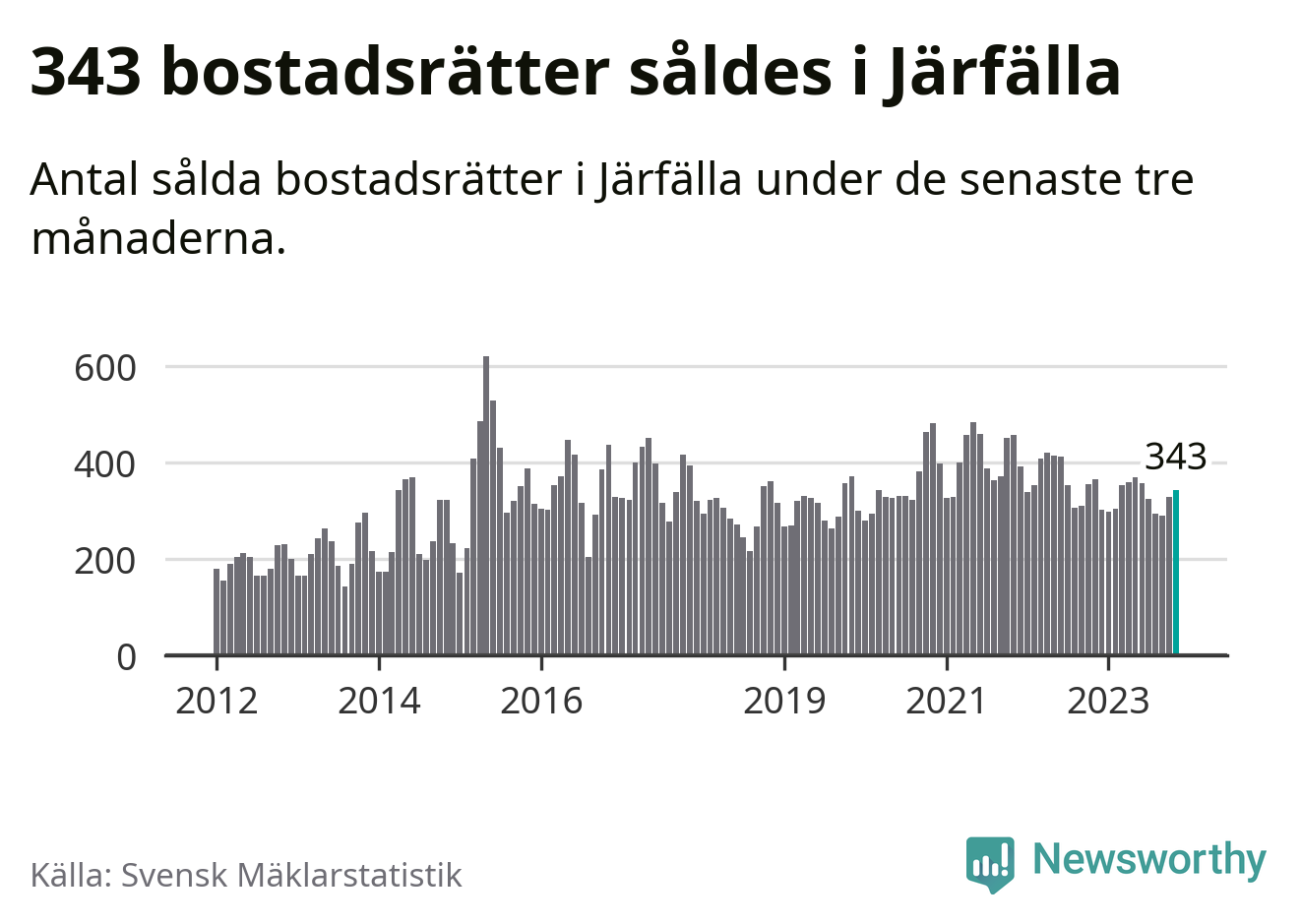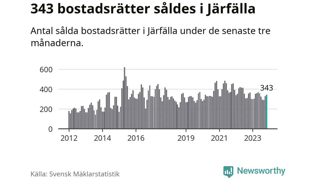 Sammanlagt såldes 343 bostadsrätter i Järfälla kommun mellan september och november till ett genomsnittligt pris på 2,3 miljoner kronor. I fjol gjordes 365 affärer vid den här tiden på året.