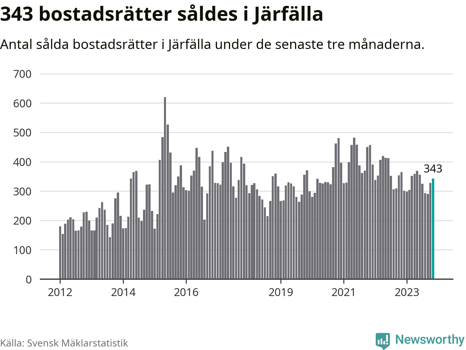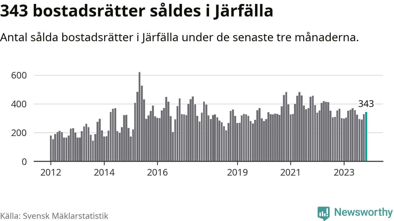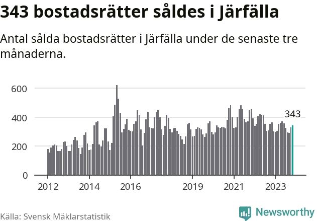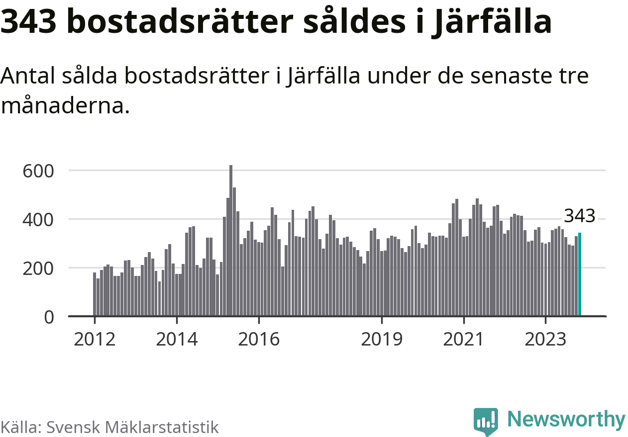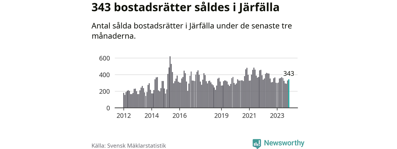 Sammanlagt såldes 343 bostadsrätter i Järfälla kommun mellan september och november till ett genomsnittligt pris på 2,3 miljoner kronor. I fjol gjordes 365 affärer vid den här tiden på året.
