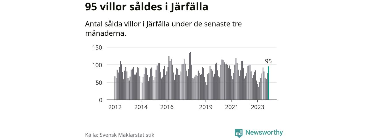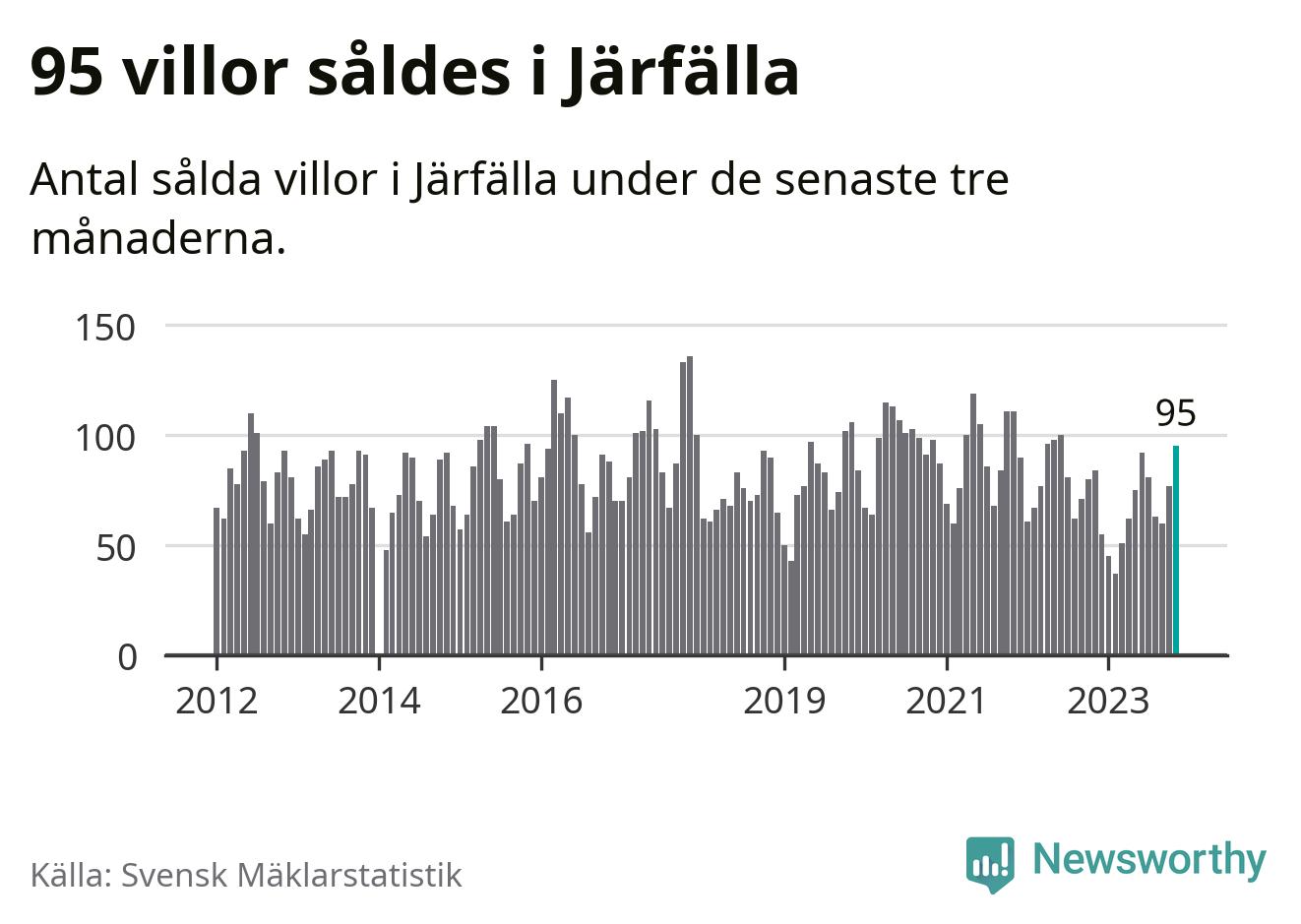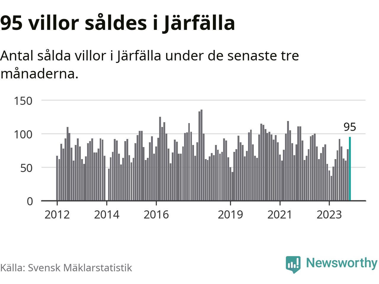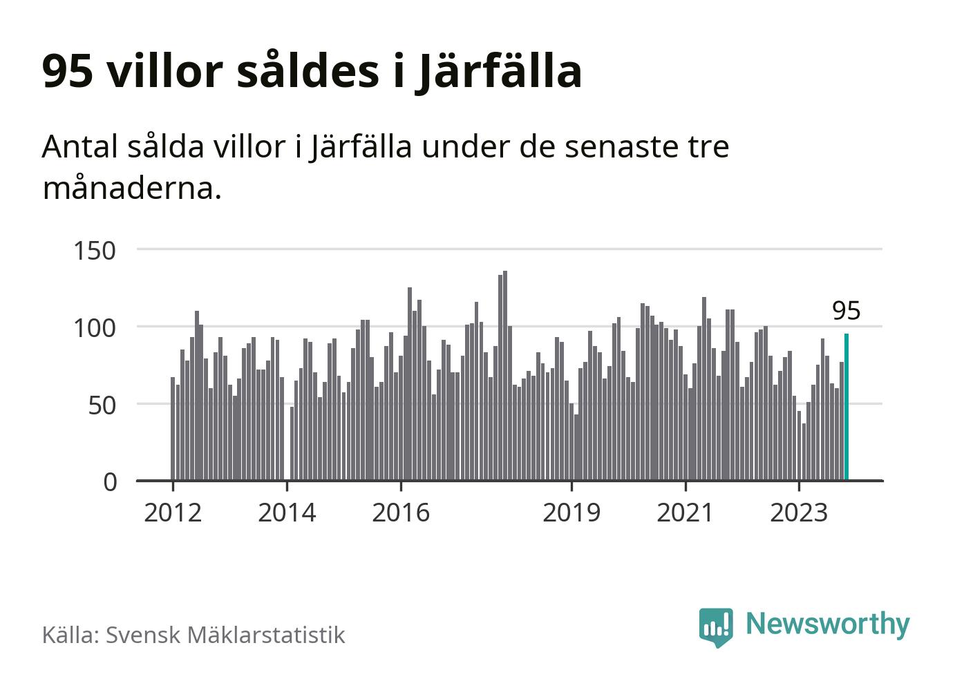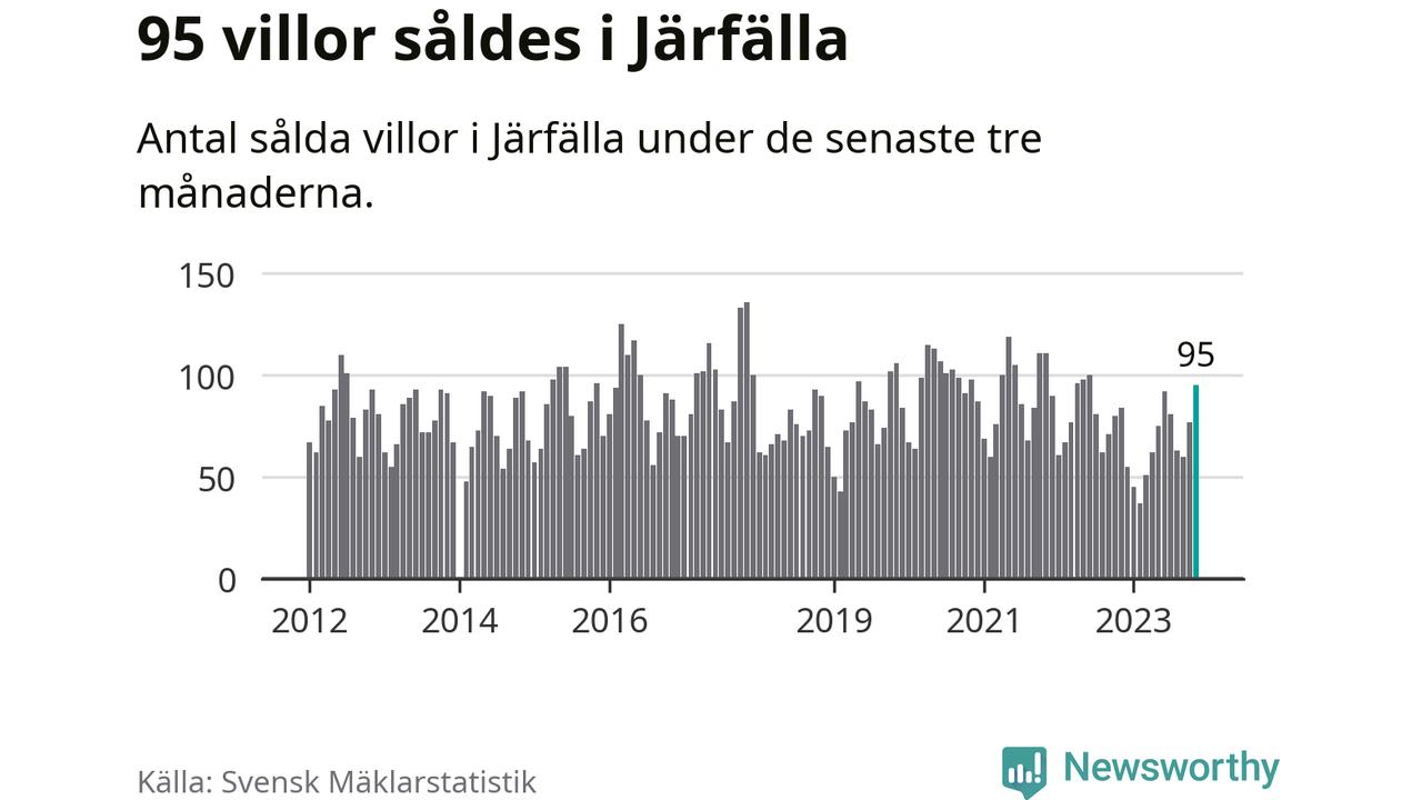 Sammanlagt såldes 95 villor i Järfälla kommun mellan september och november till ett genomsnittligt pris på 5,5 miljoner kronor. I fjol gjordes 84 affärer vid den här tiden på året.