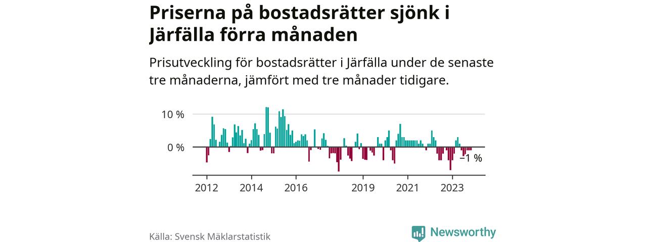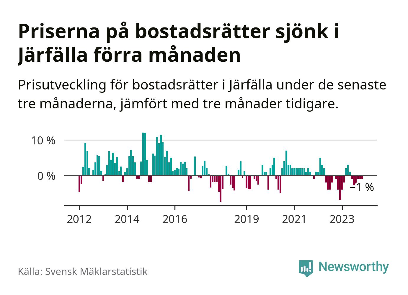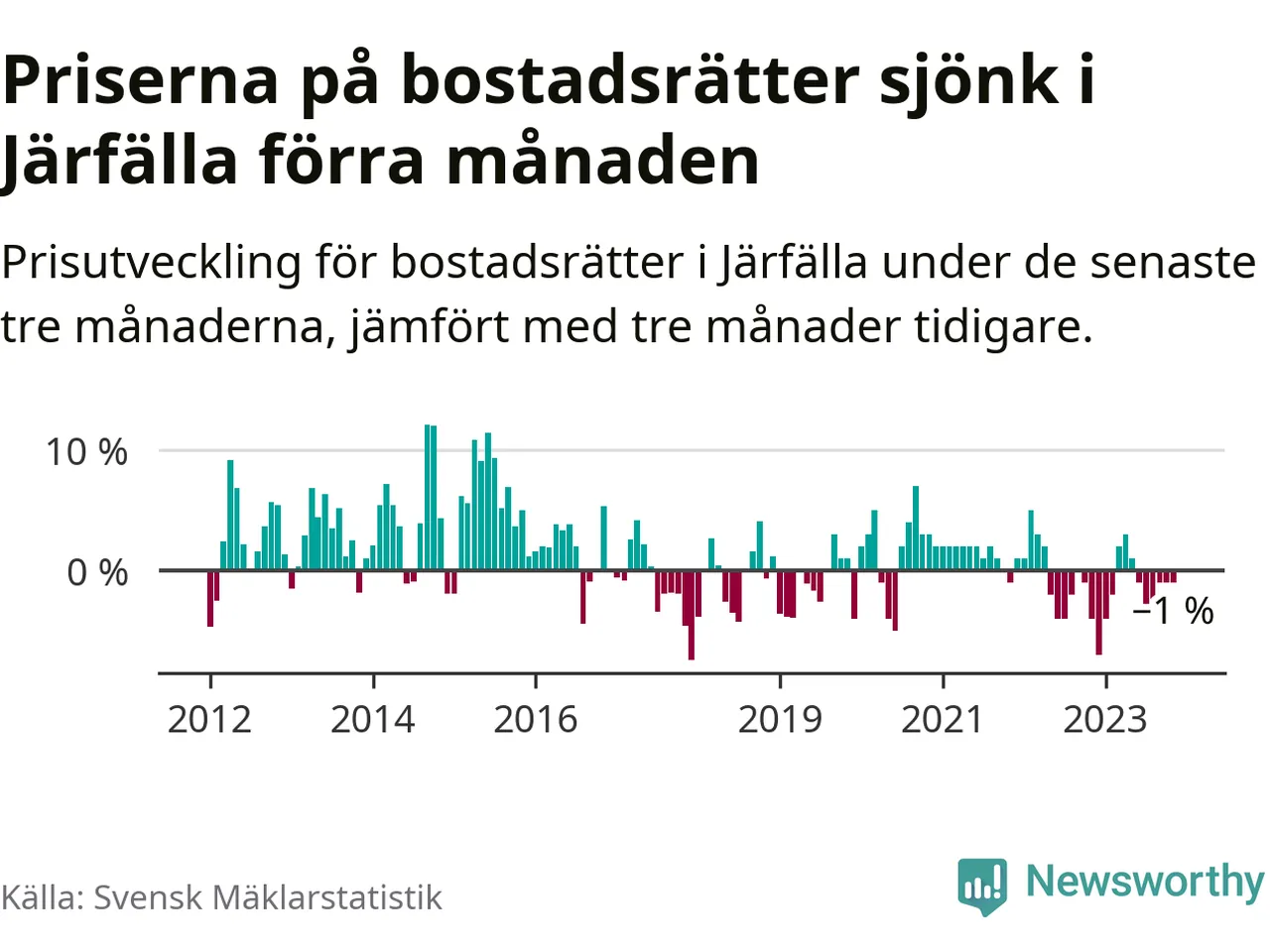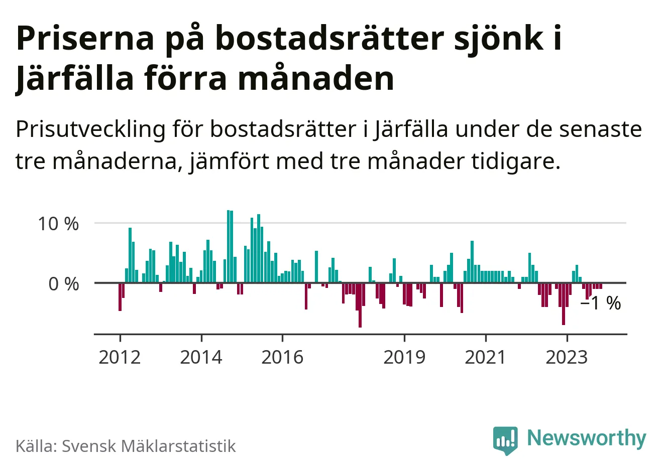 Priserna på bostadsrätter har gått ner i Järfälla kommun. Medelpriset på försäljningarna under de senaste tre månaderna visar på en nedgång med 1 procent.