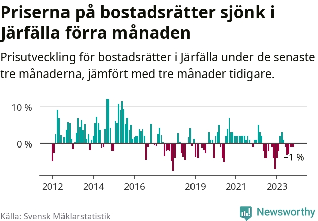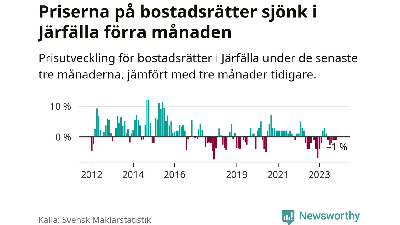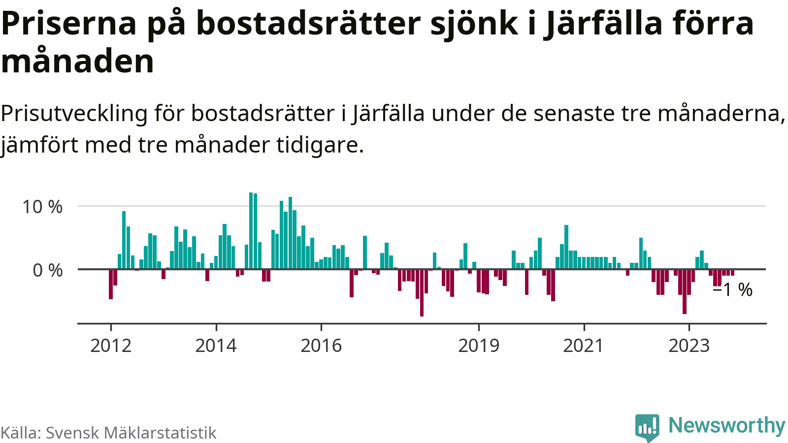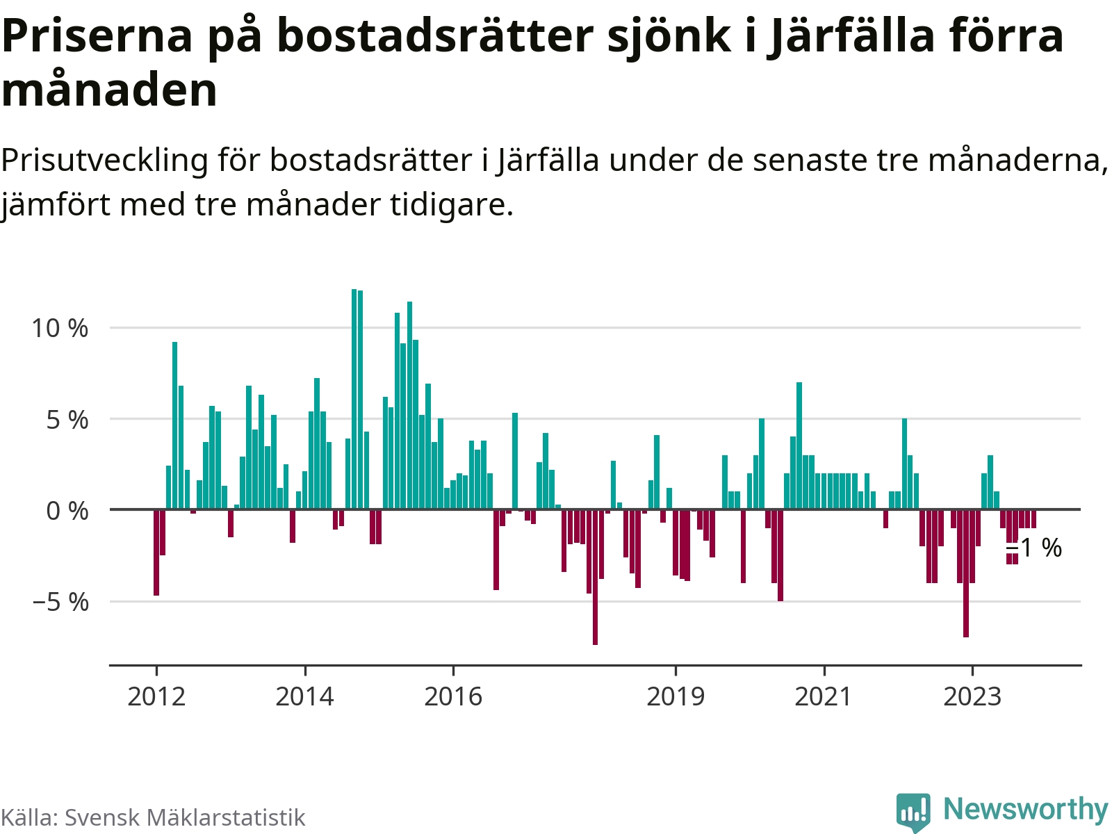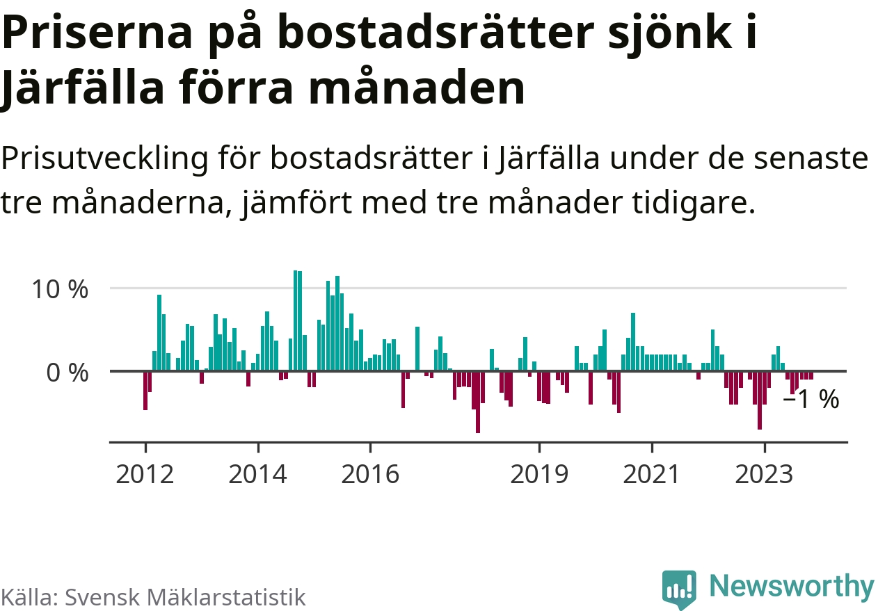 Priserna på bostadsrätter har gått ner i Järfälla kommun. Medelpriset på försäljningarna under de senaste tre månaderna visar på en nedgång med 1 procent.