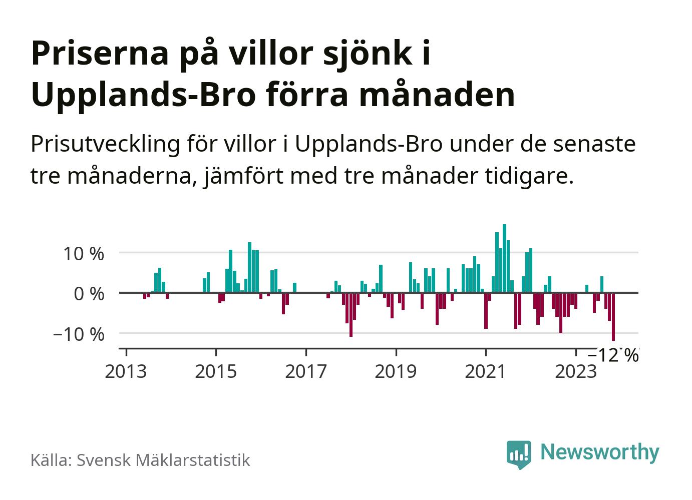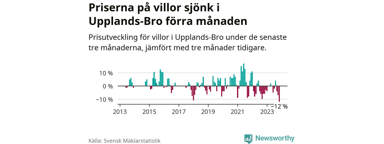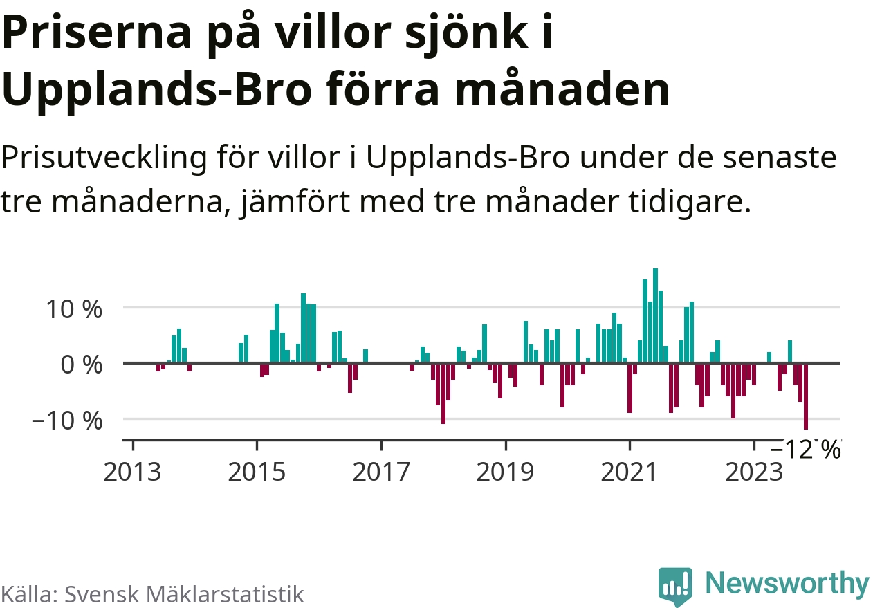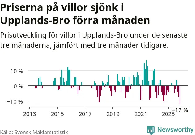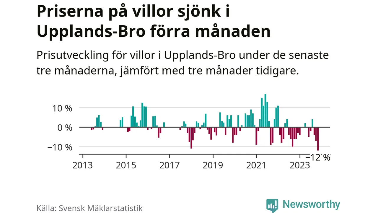 Villapriserna sjönk med tolv procent i Upplands-Bro kommun under de senaste tre månaderna. Det är den svagaste prisutvecklingen sedan 2013.
