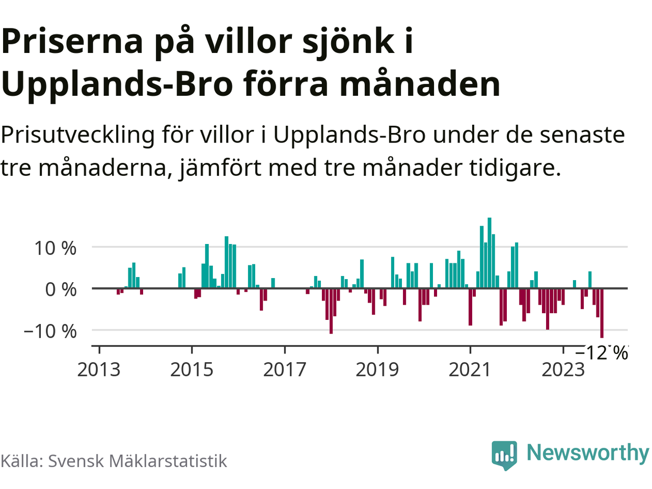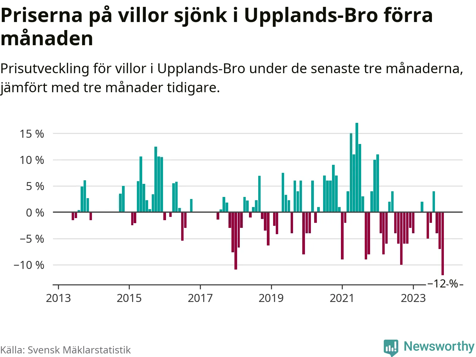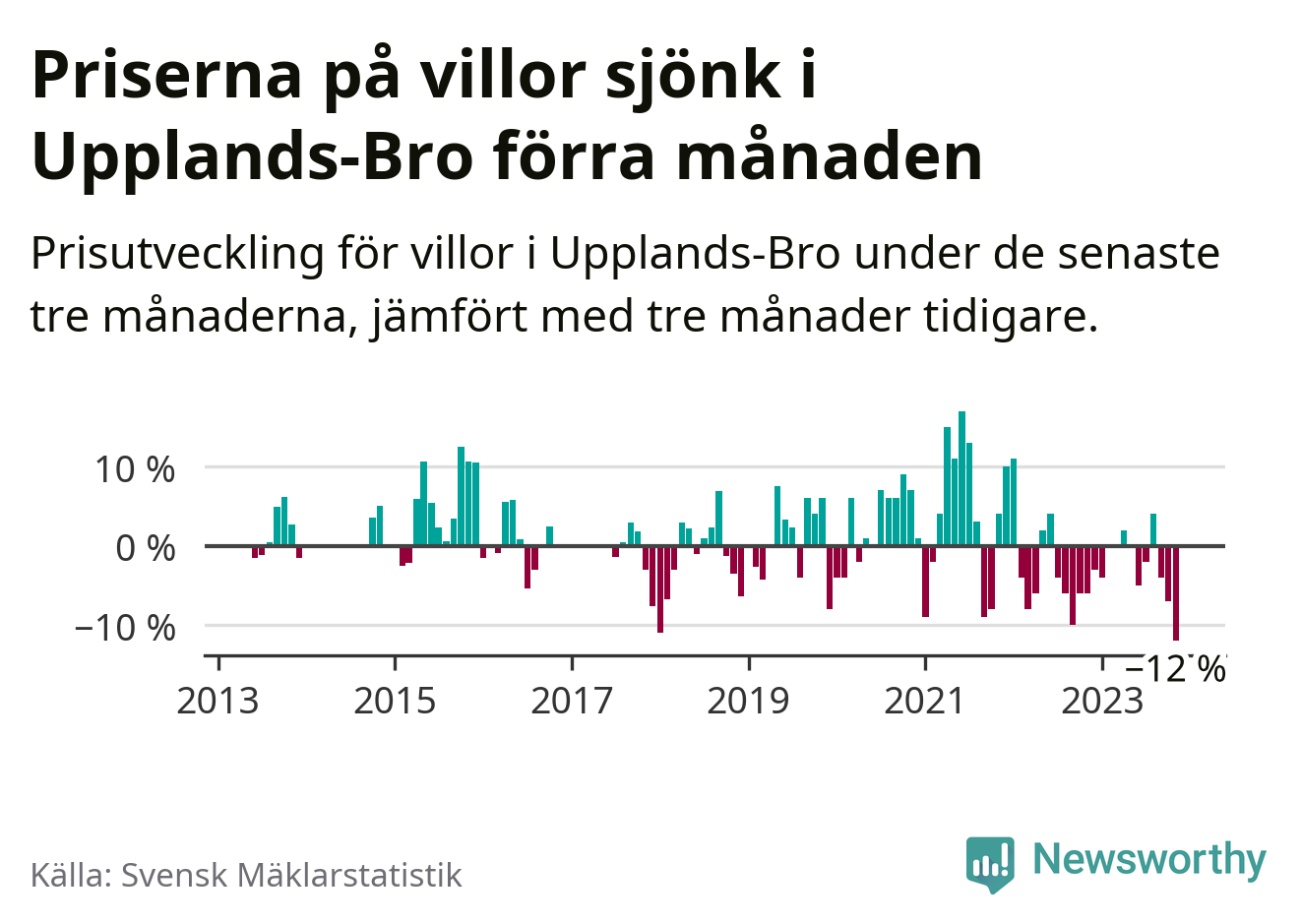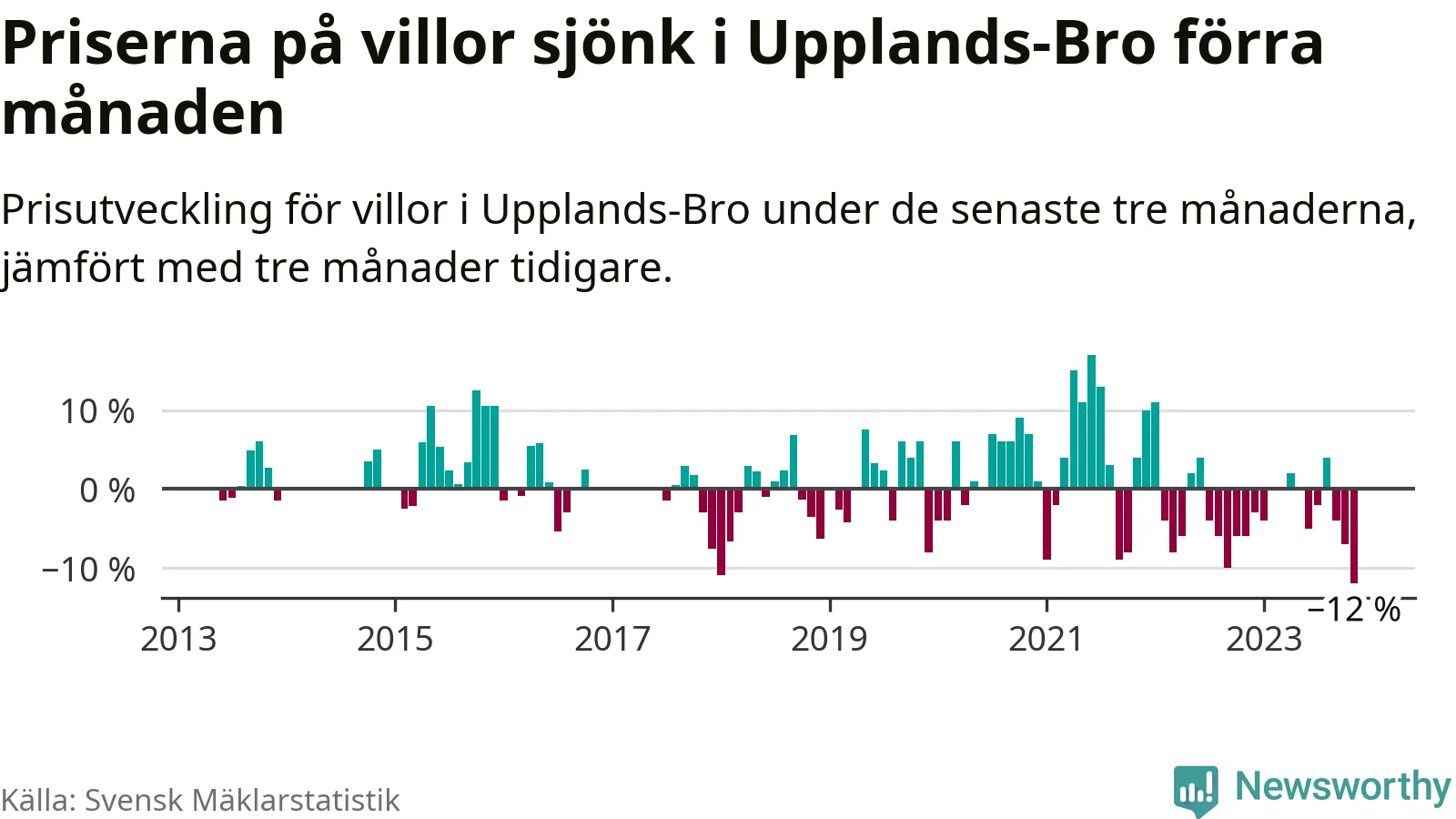 Villapriserna sjönk med tolv procent i Upplands-Bro kommun under de senaste tre månaderna. Det är den svagaste prisutvecklingen sedan 2013.