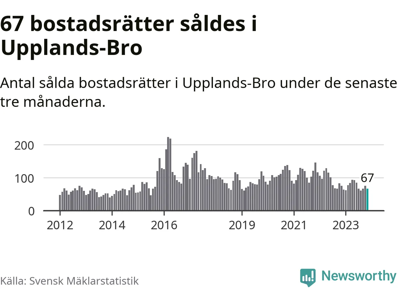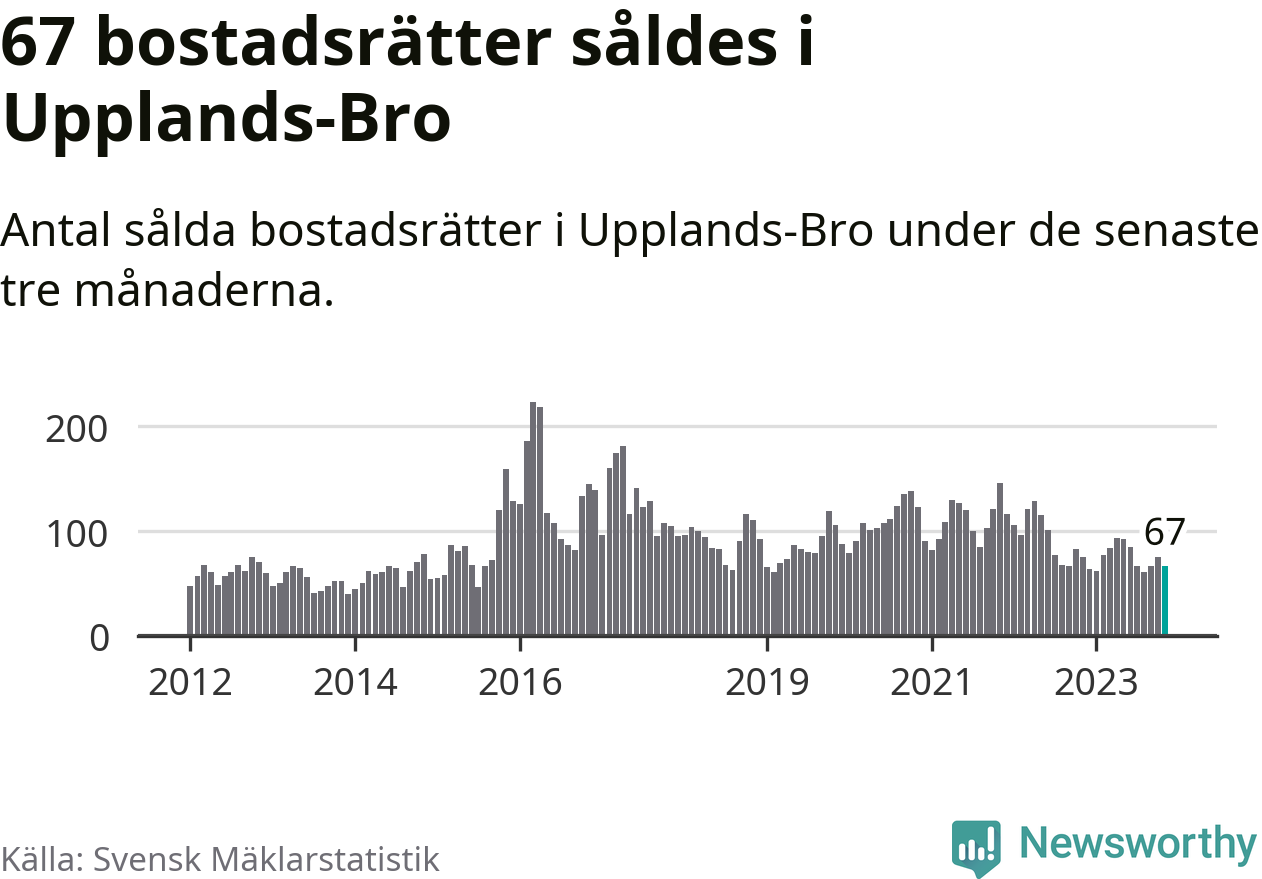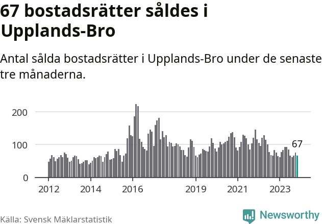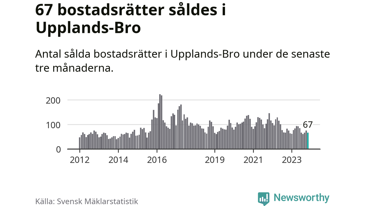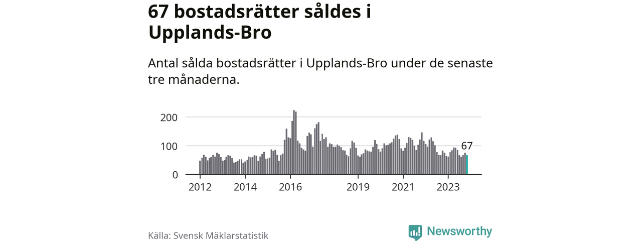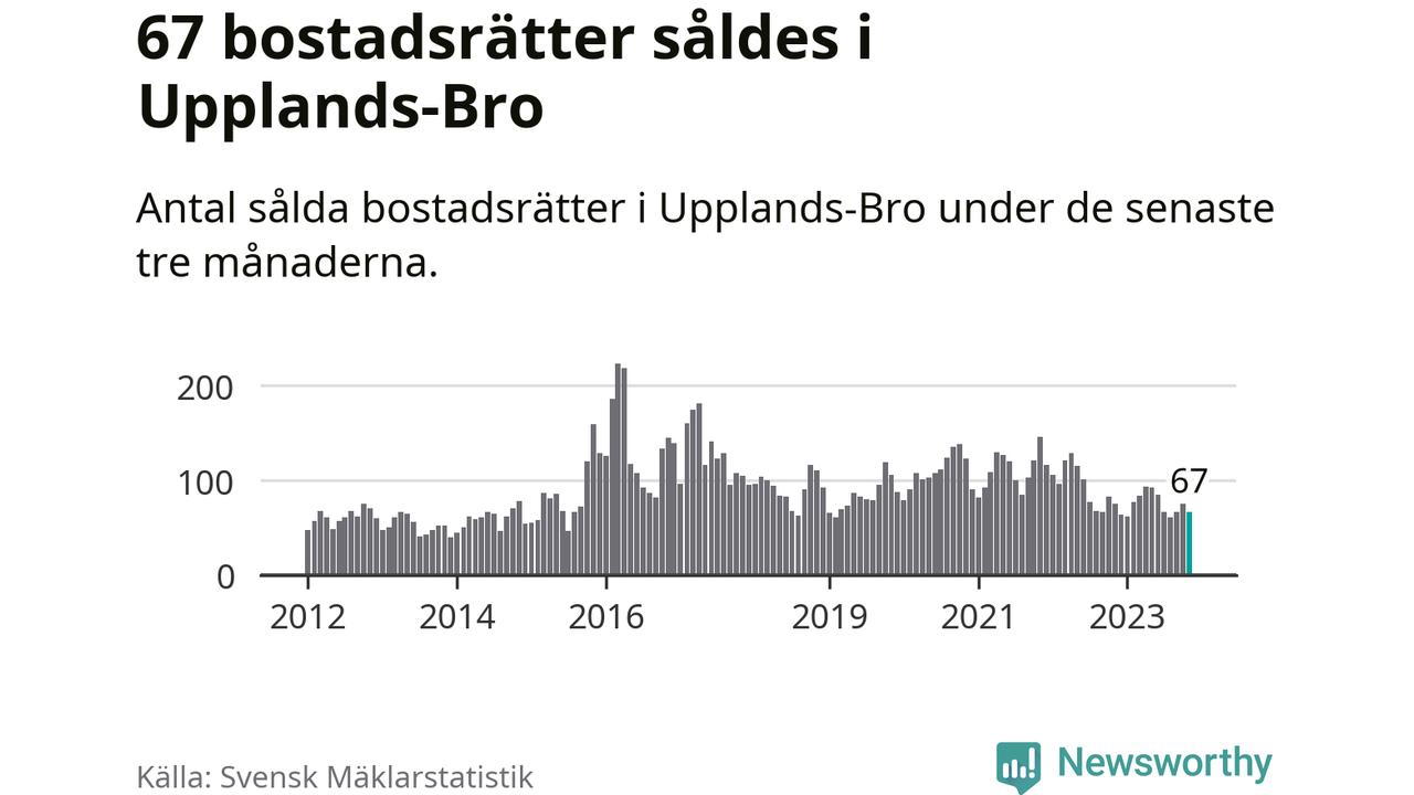 Sammanlagt såldes 67 bostadsrätter i Upplands-Bro kommun mellan september och november till ett genomsnittligt pris på 2,1 miljoner kronor. I fjol gjordes 75 affärer vid den här tiden på året.