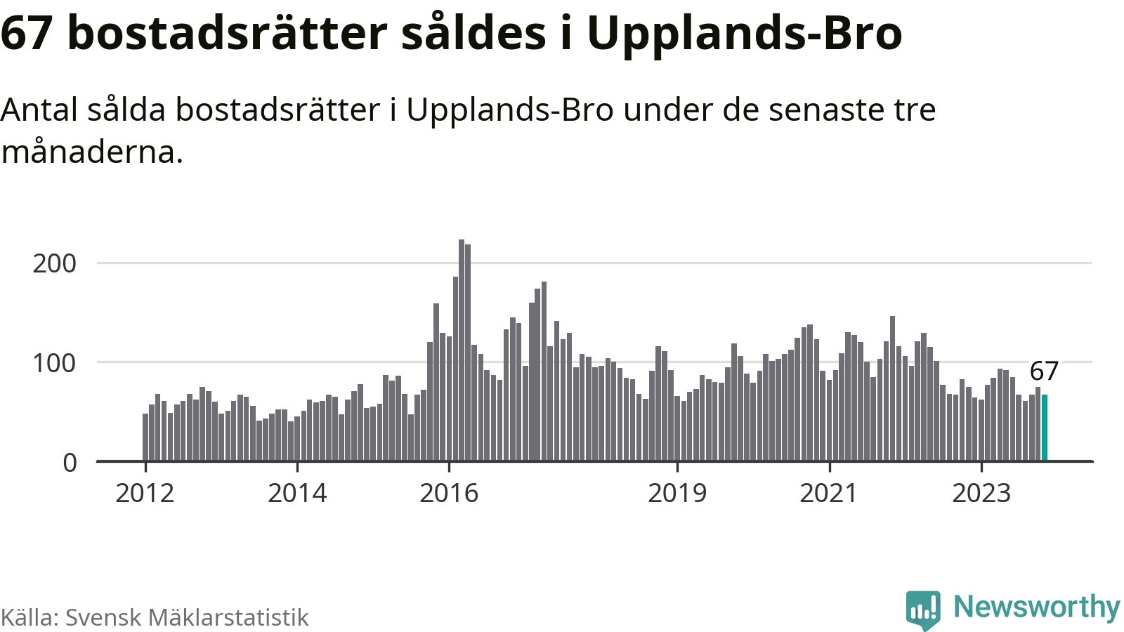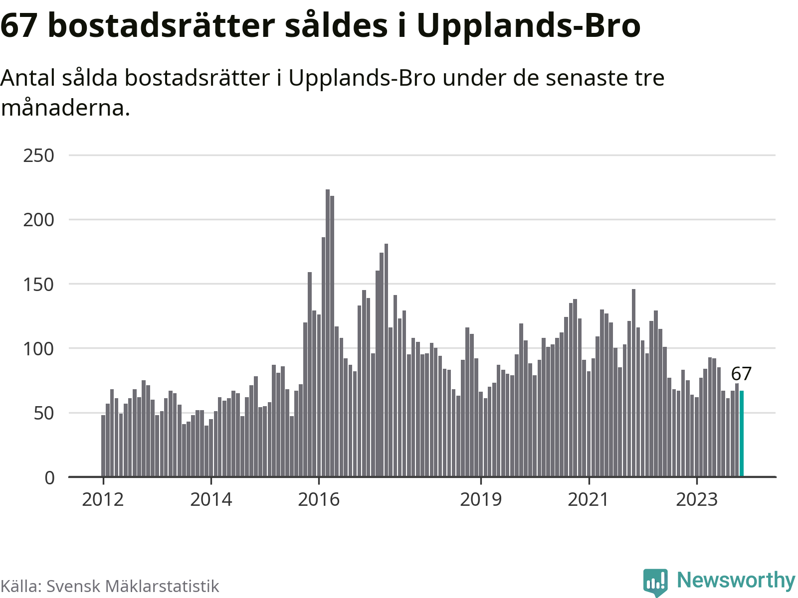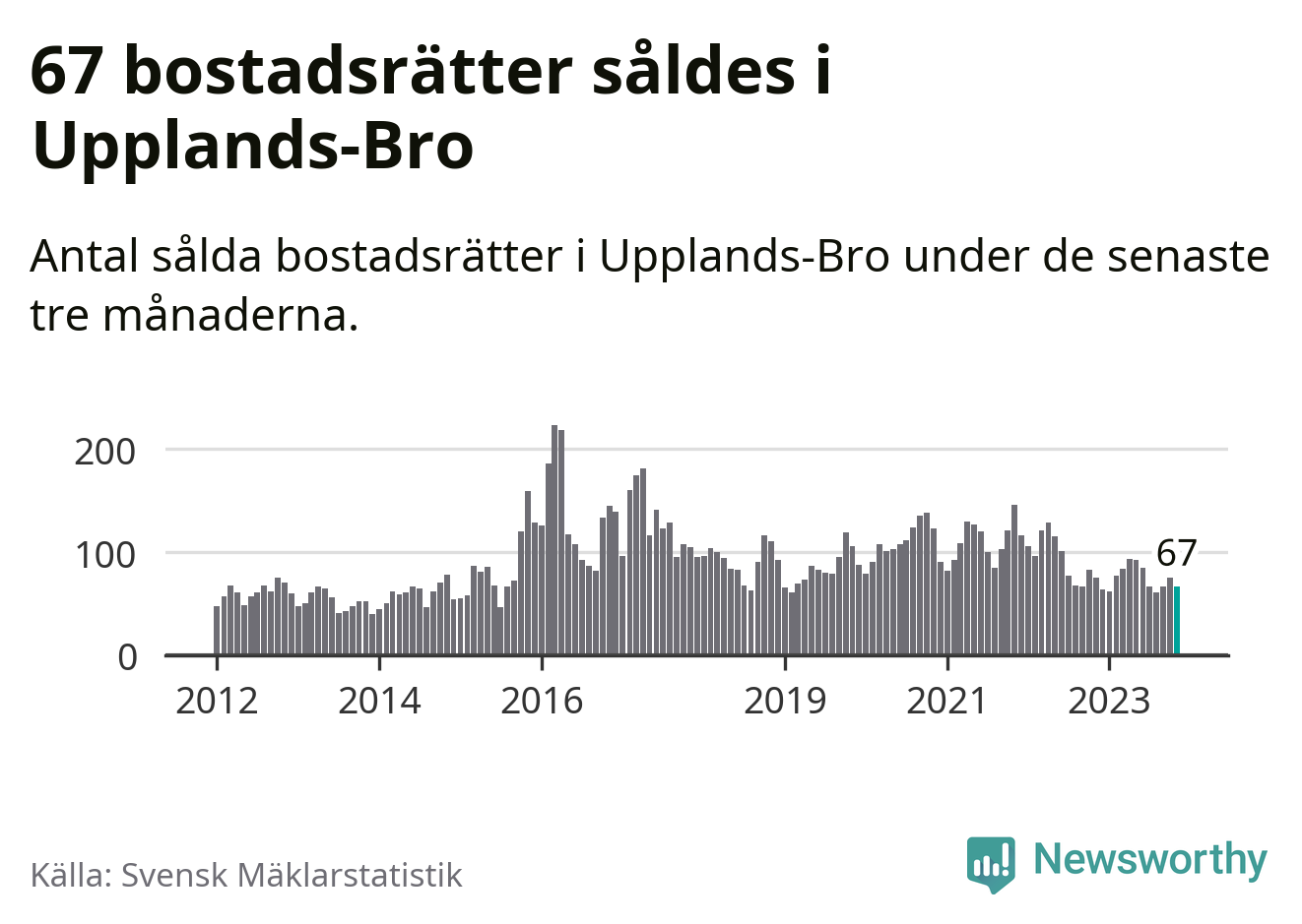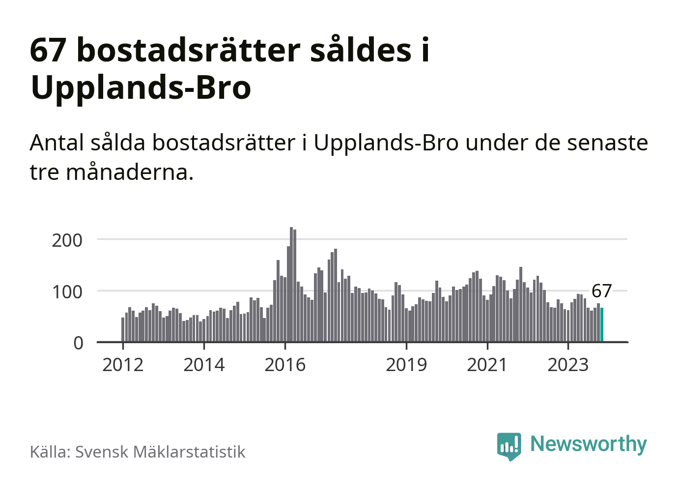 Sammanlagt såldes 67 bostadsrätter i Upplands-Bro kommun mellan september och november till ett genomsnittligt pris på 2,1 miljoner kronor. I fjol gjordes 75 affärer vid den här tiden på året.