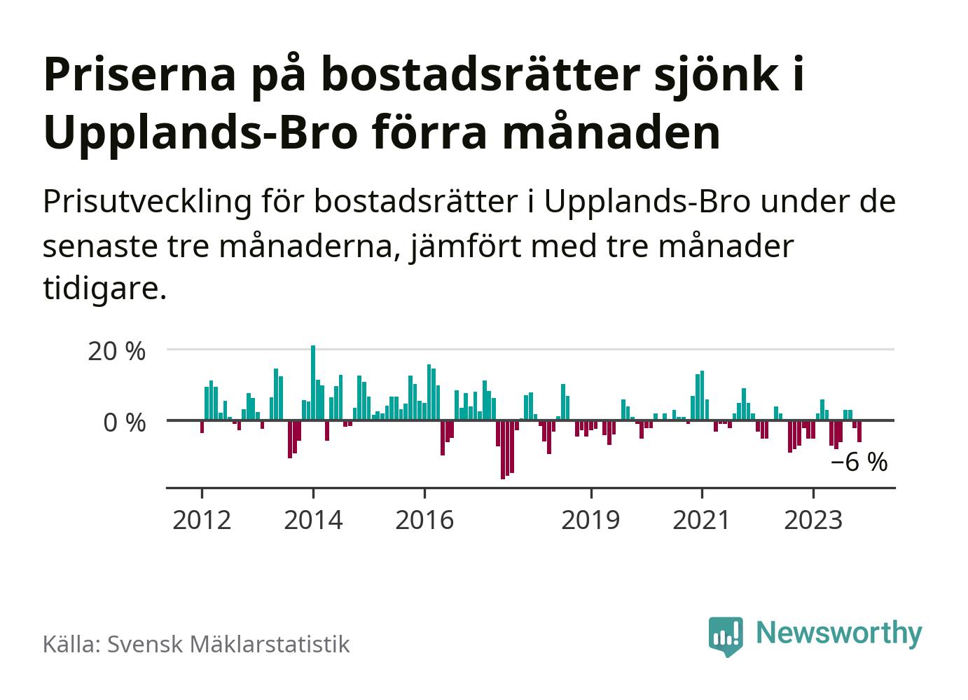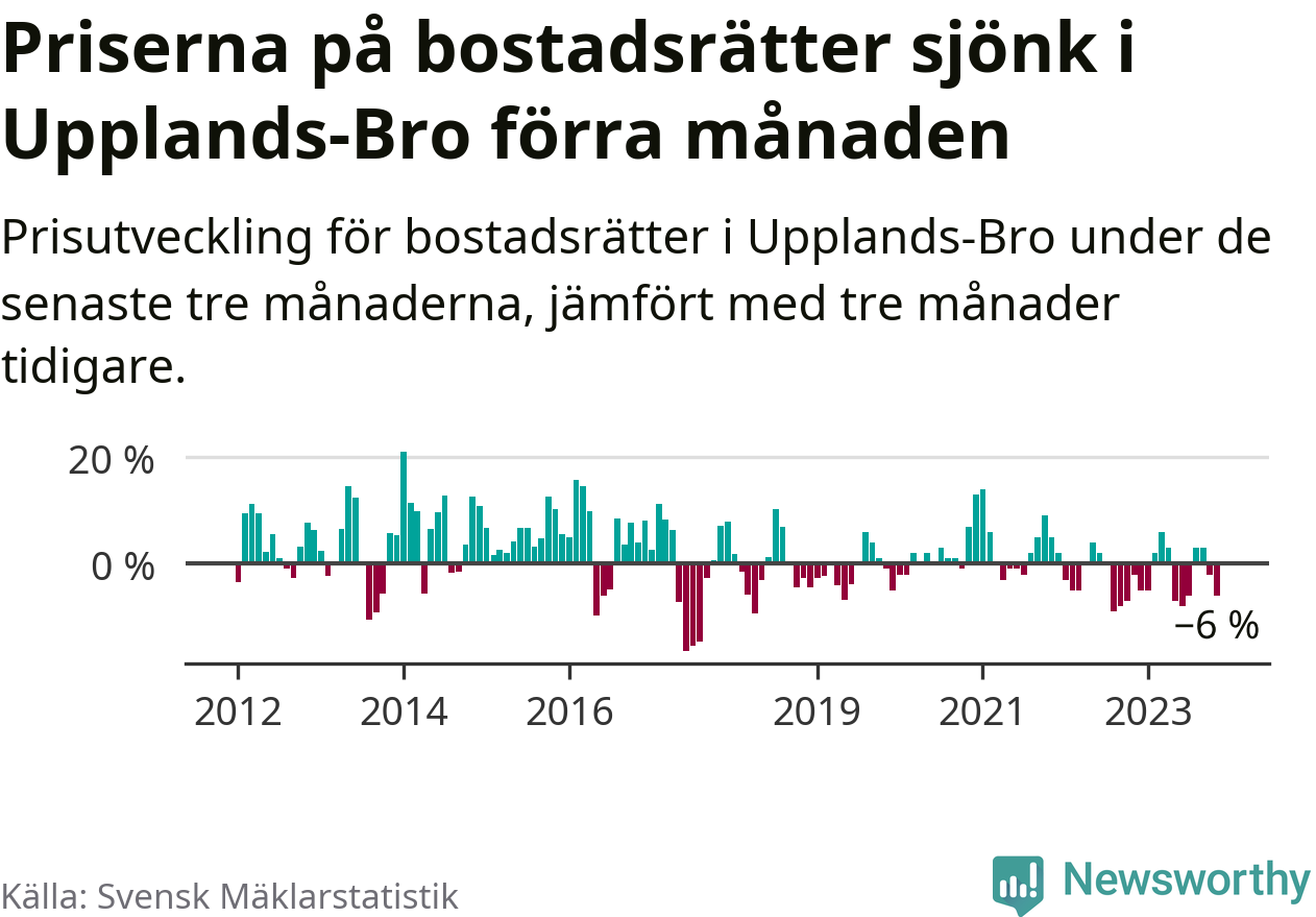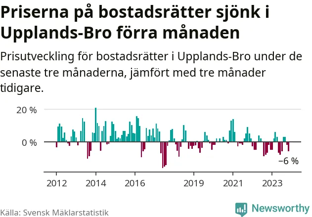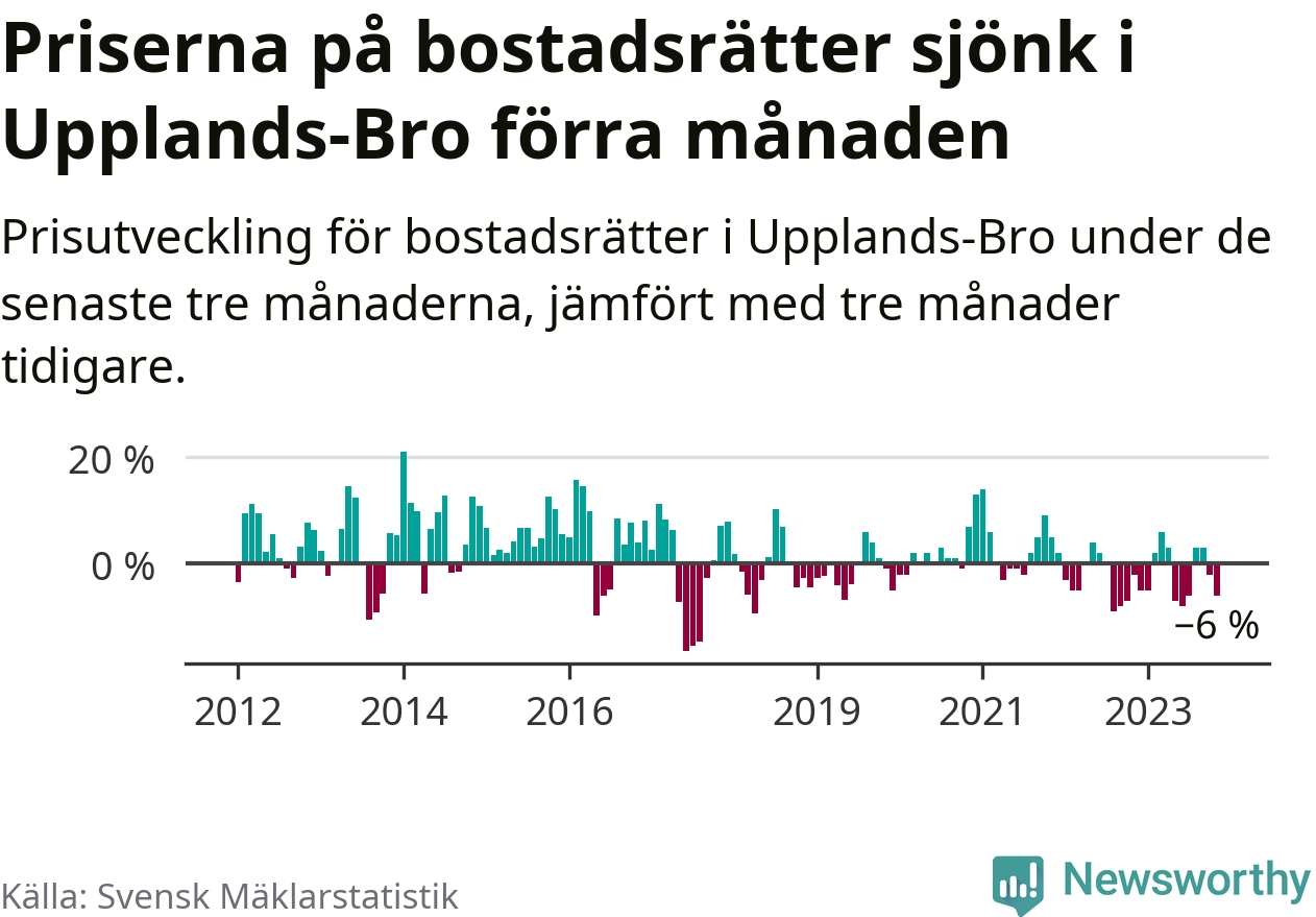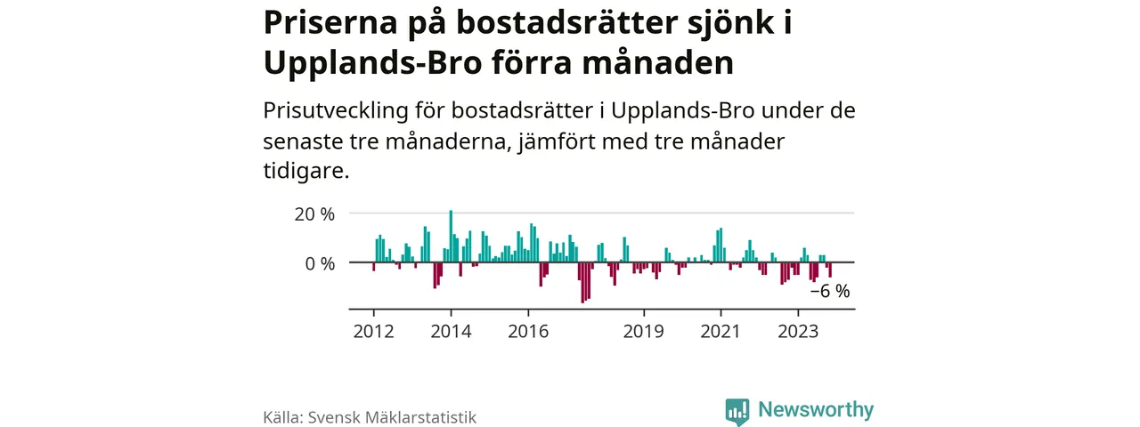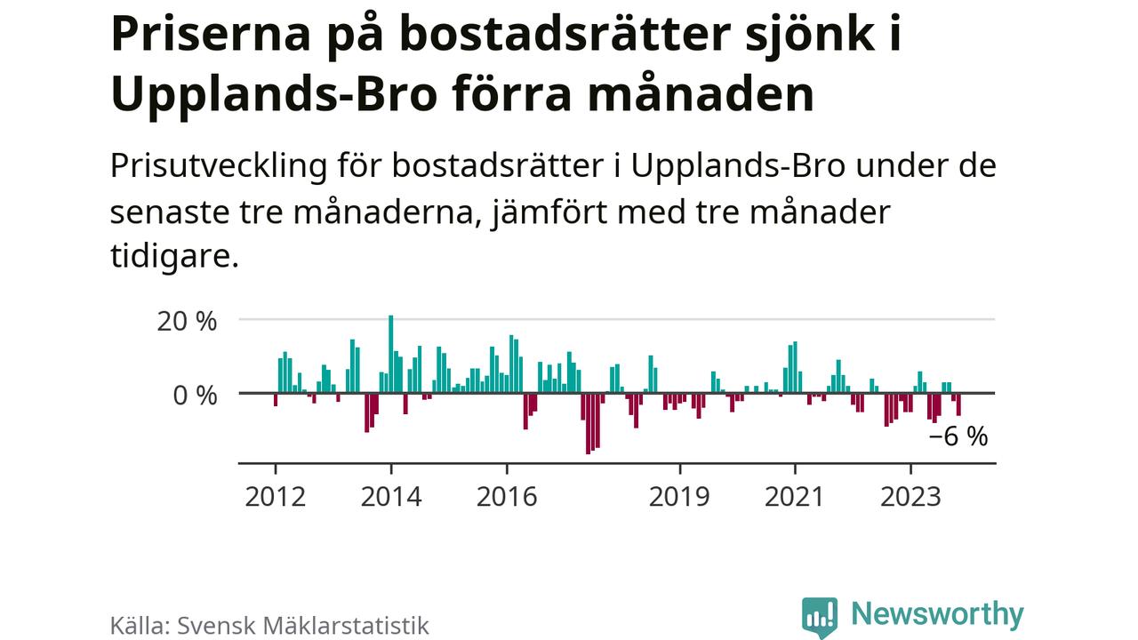 Priserna på bostadsrätter har gått ner i Upplands-Bro kommun. Medelpriset på försäljningarna under de senaste tre månaderna visar på en nedgång med 6 procent.