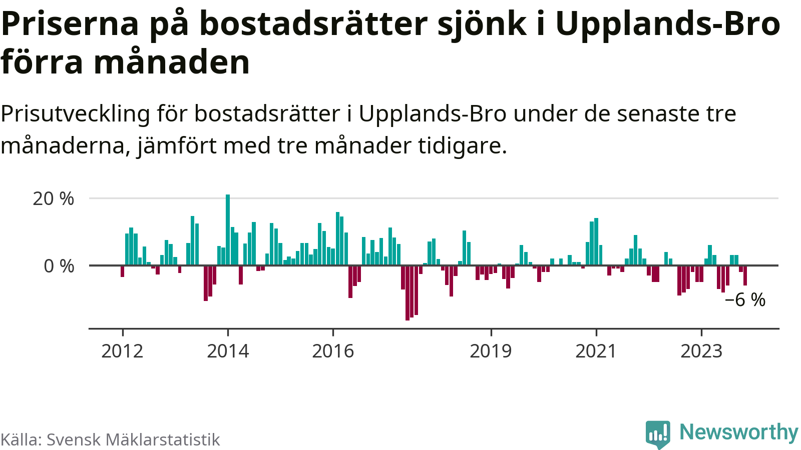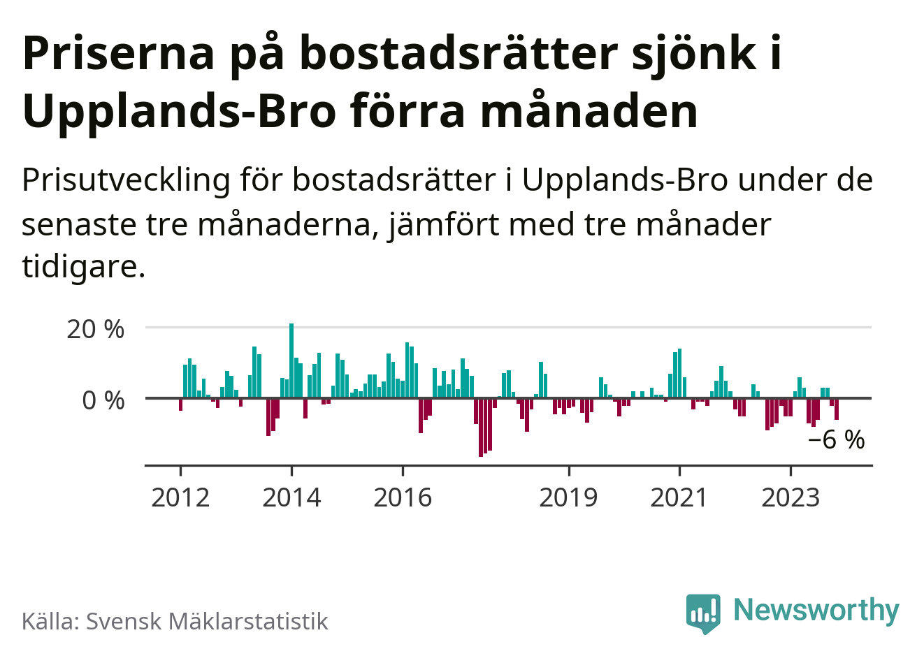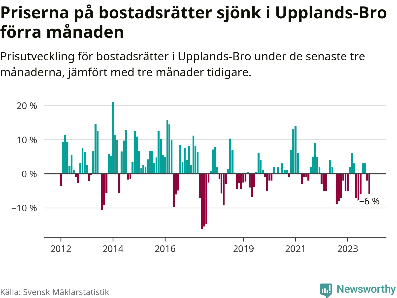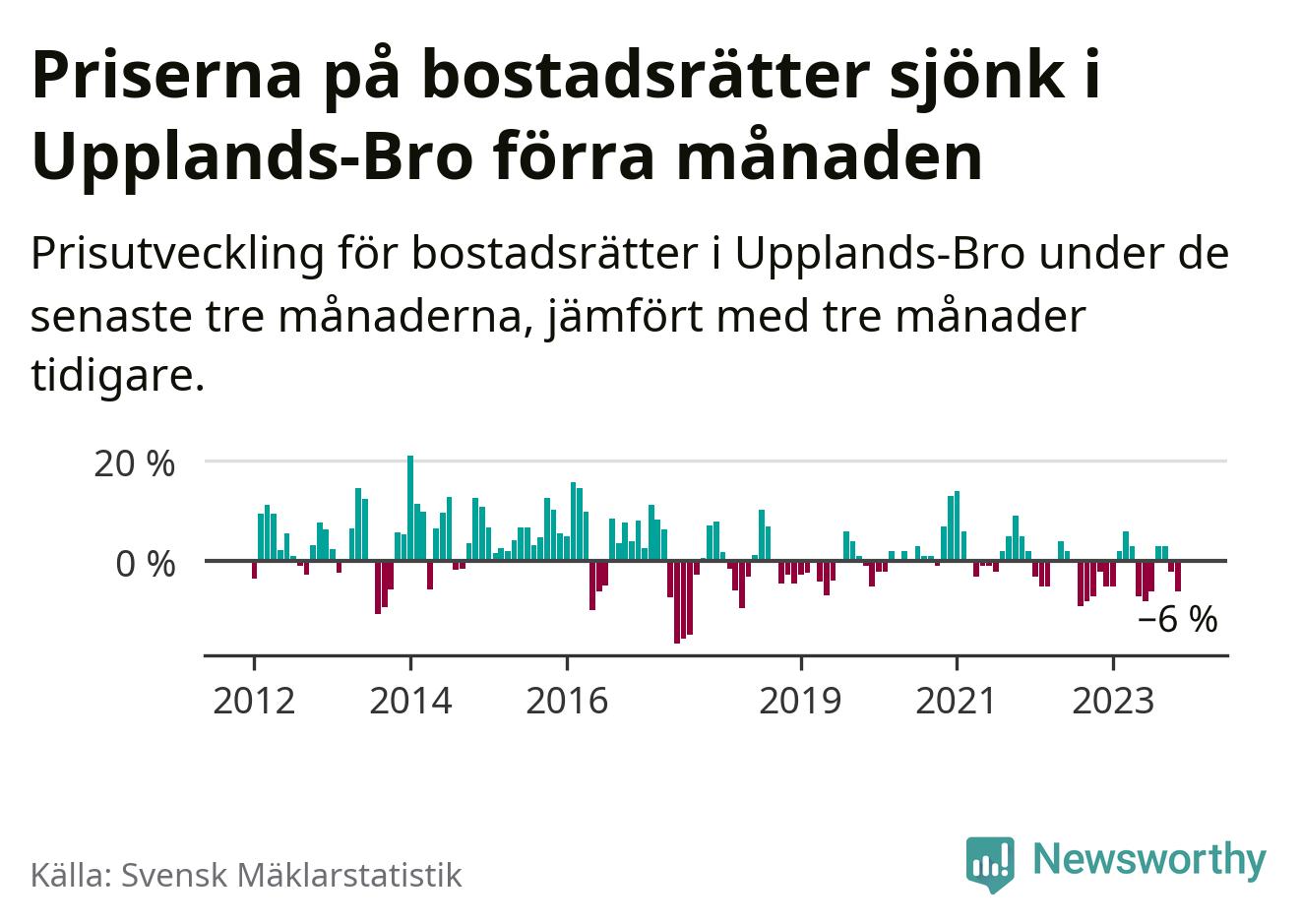 Priserna på bostadsrätter har gått ner i Upplands-Bro kommun. Medelpriset på försäljningarna under de senaste tre månaderna visar på en nedgång med 6 procent.