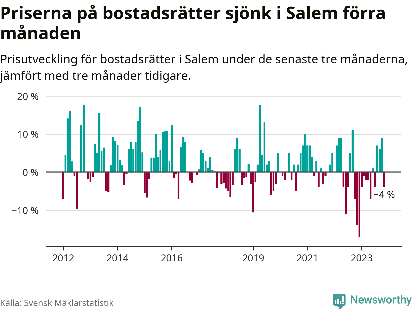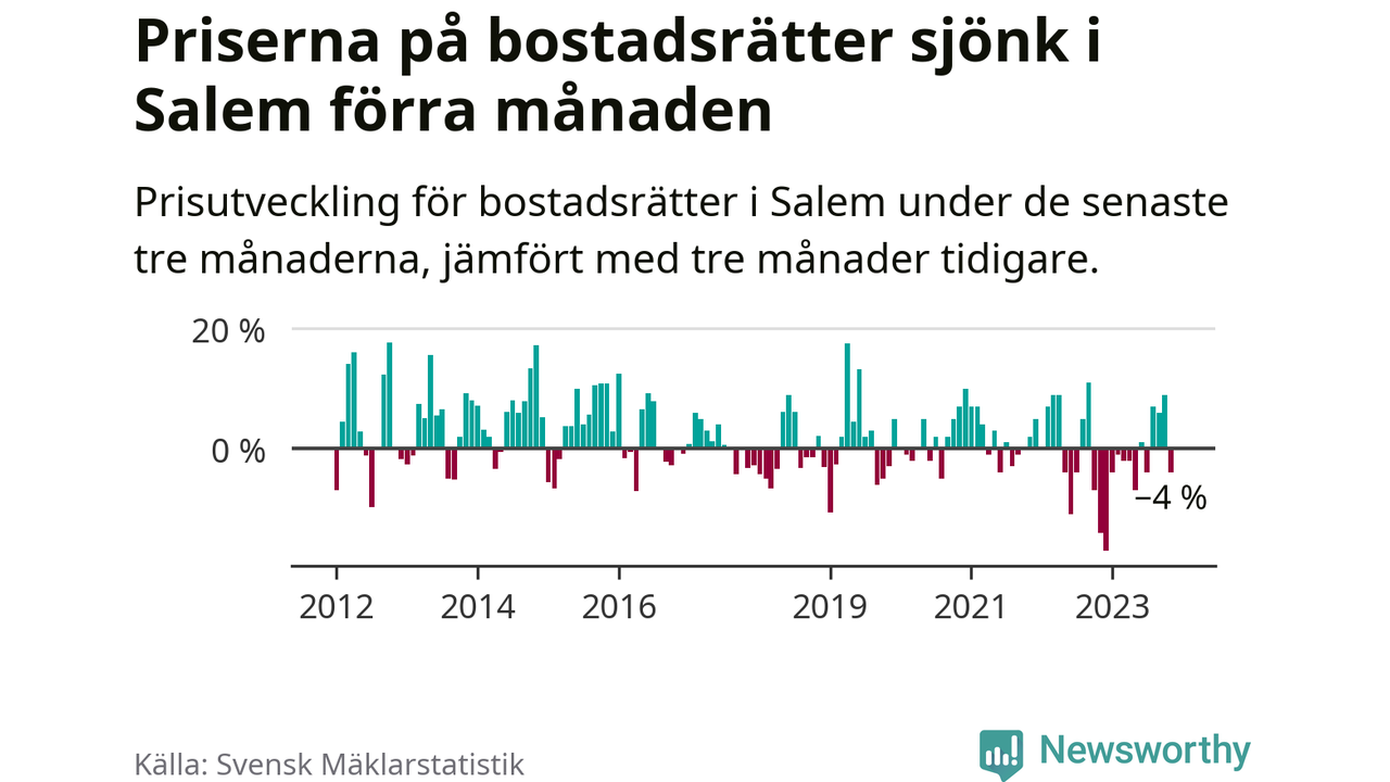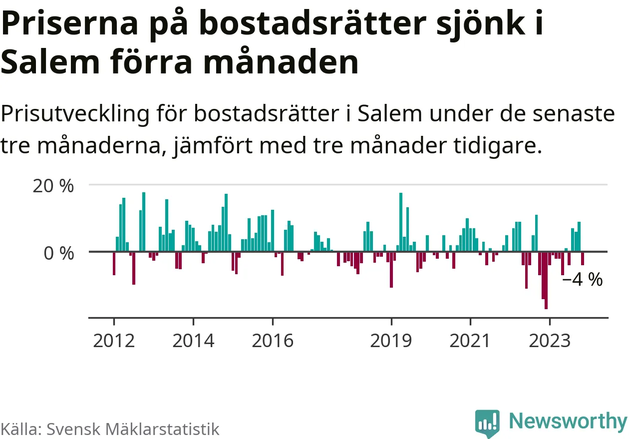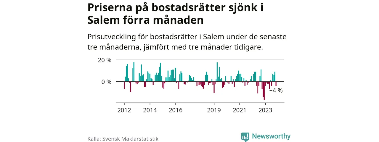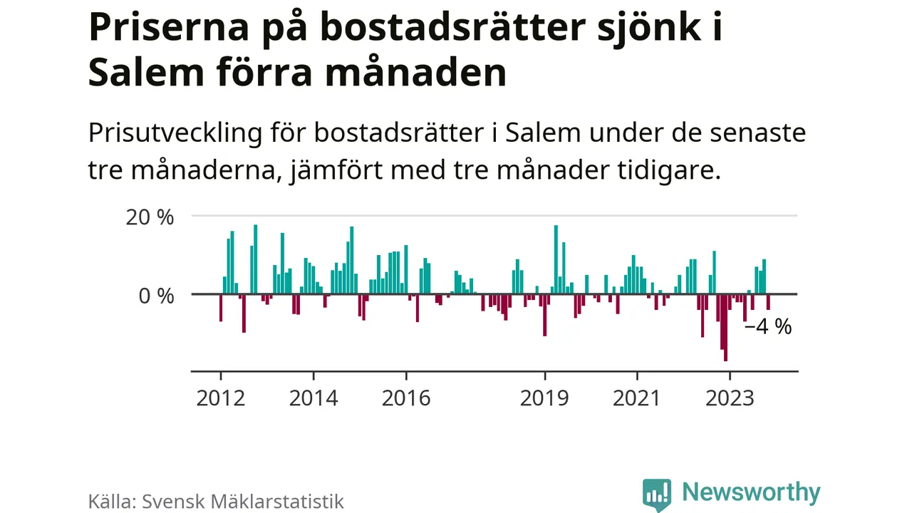 Priserna på bostadsrätter har gått ner i Salems kommun. Medelpriset på försäljningarna under de senaste tre månaderna visar på en nedgång med 4 procent.