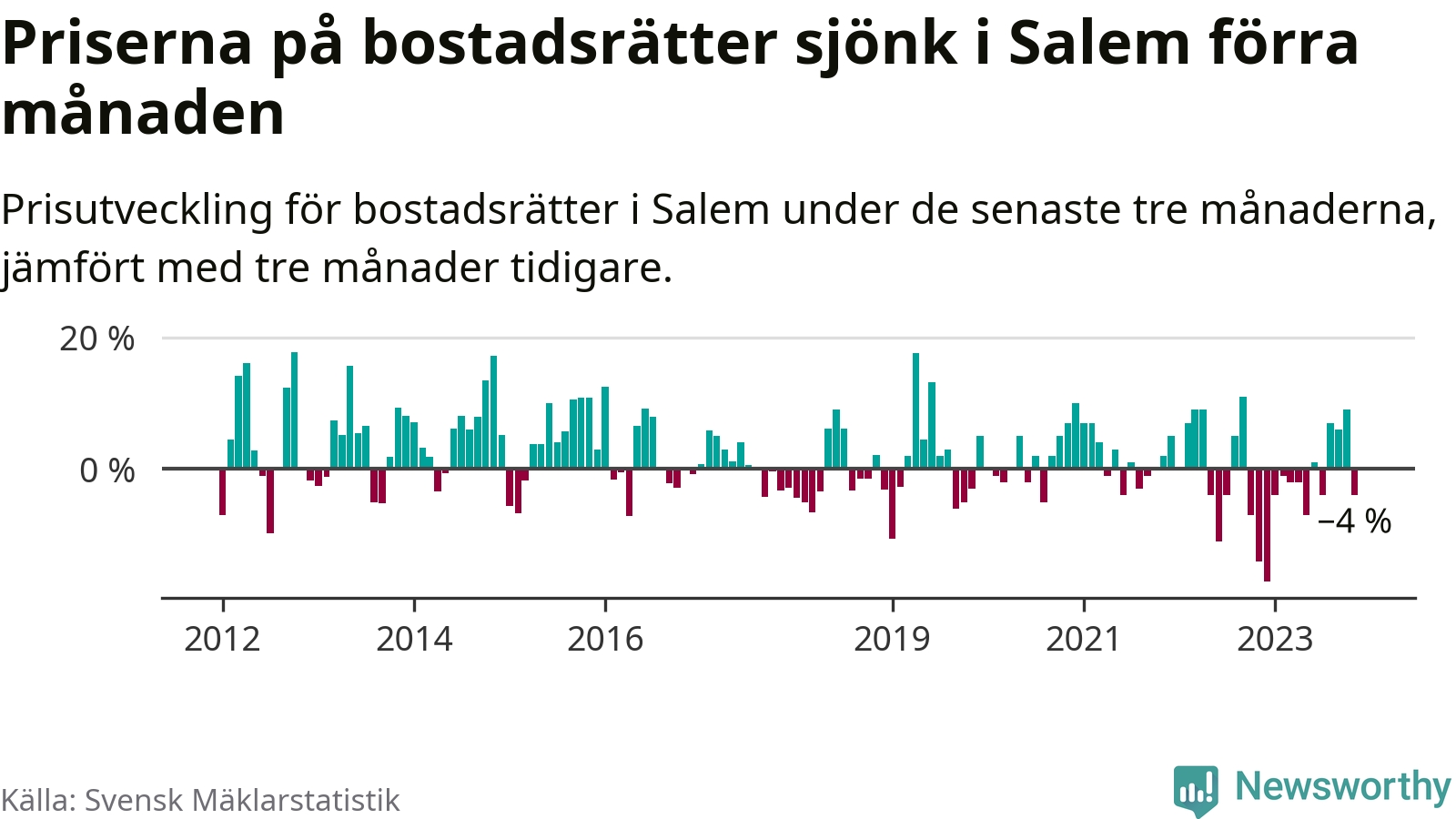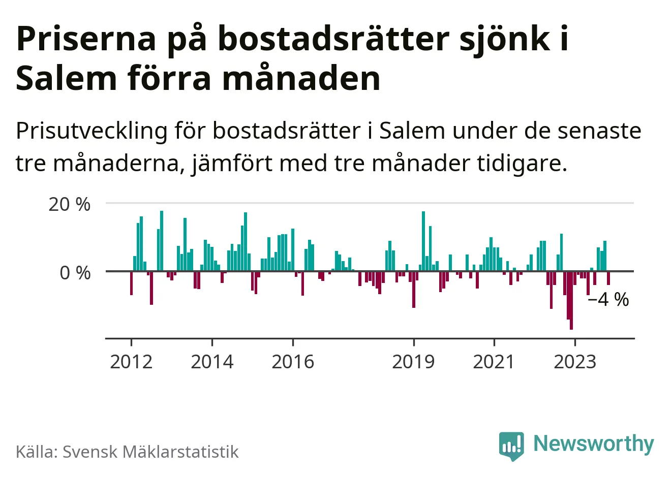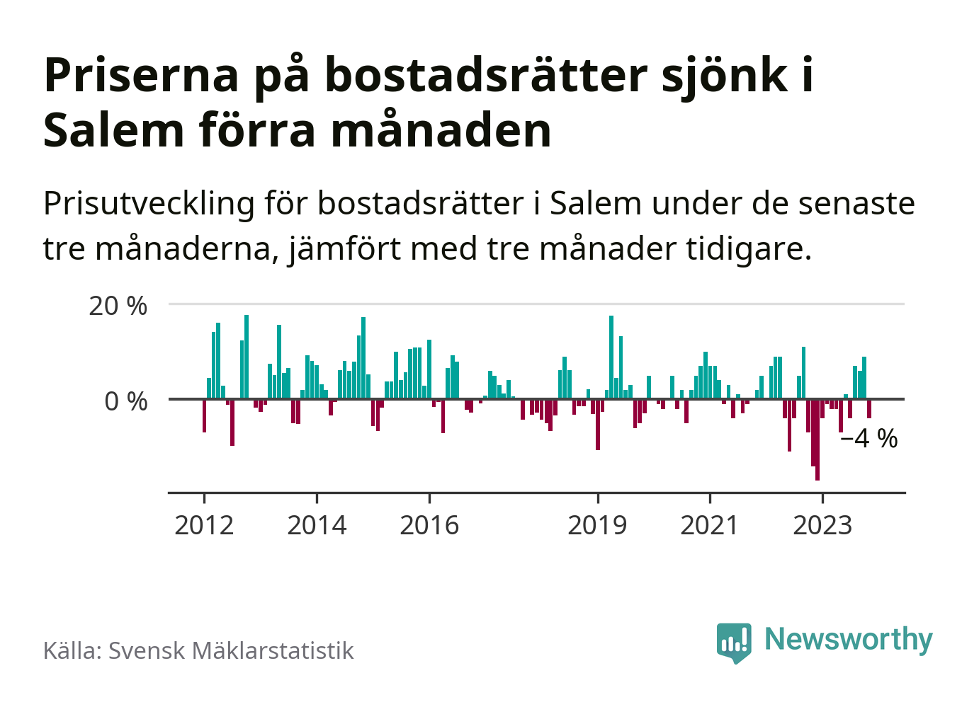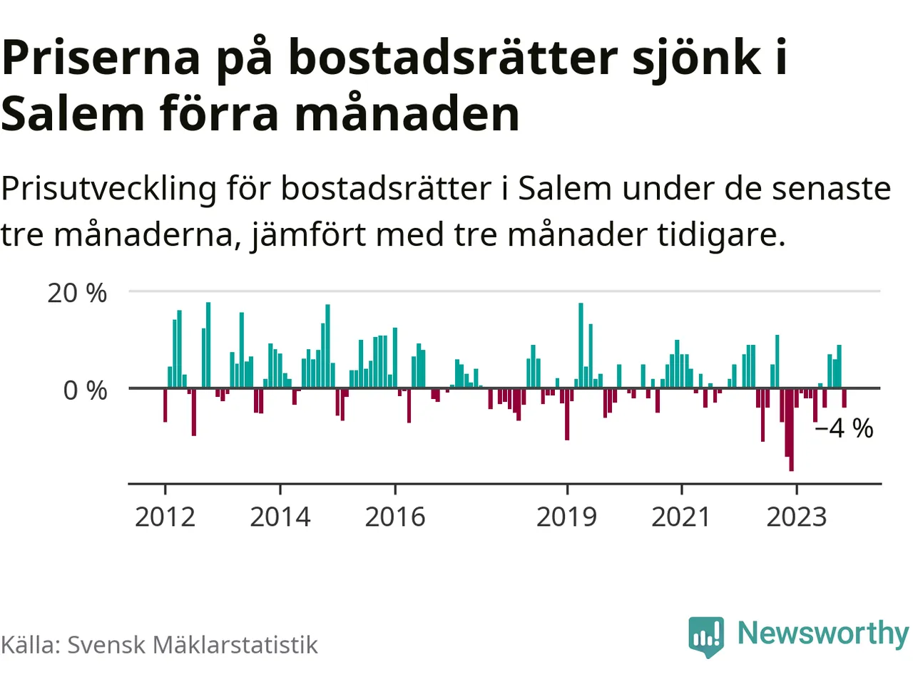 Priserna på bostadsrätter har gått ner i Salems kommun. Medelpriset på försäljningarna under de senaste tre månaderna visar på en nedgång med 4 procent.