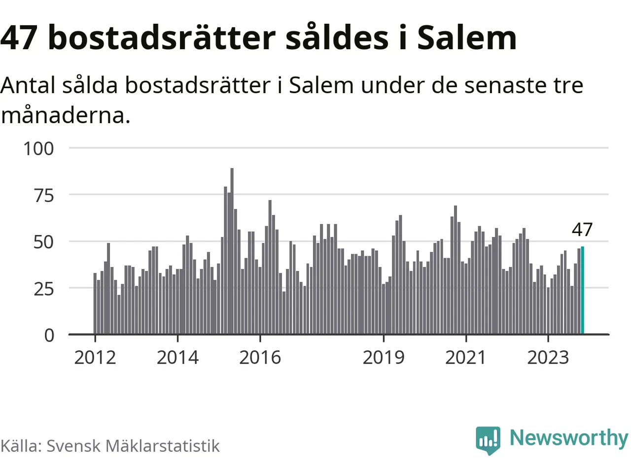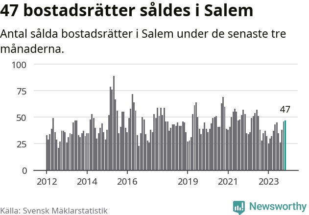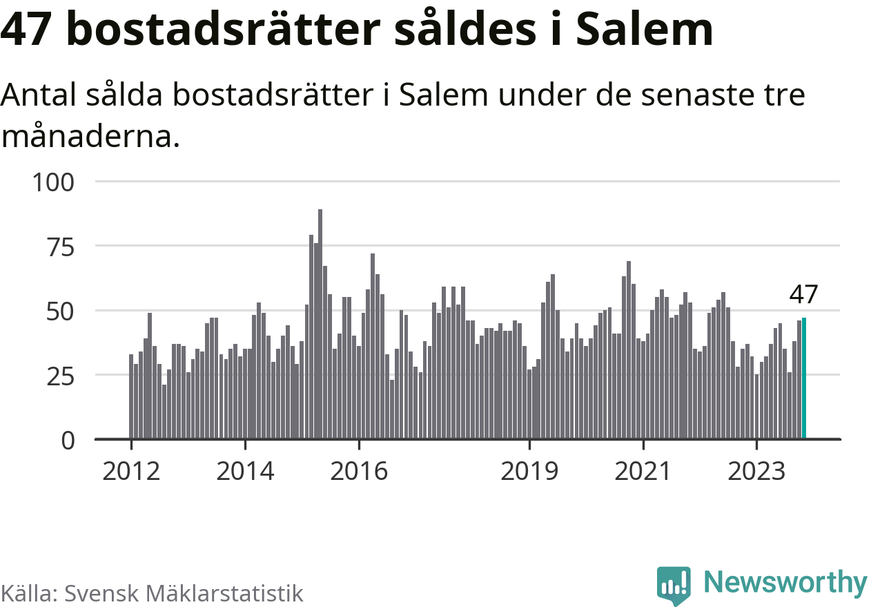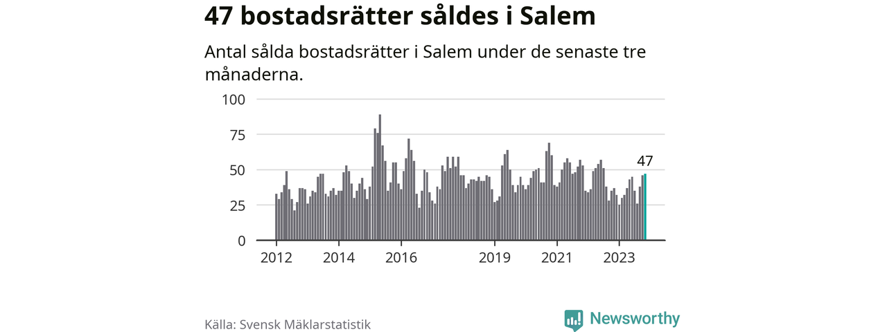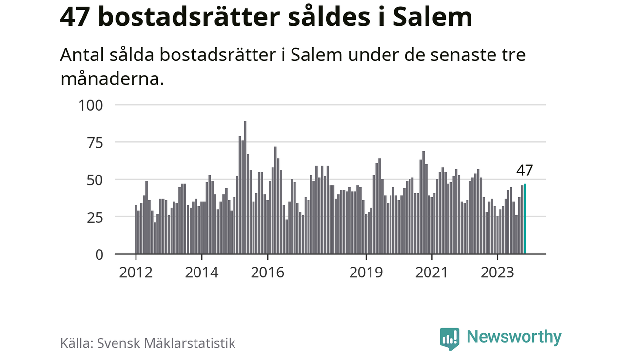 Sammanlagt såldes 47 bostadsrätter i Salems kommun mellan september och november till ett genomsnittligt pris på 2,4 miljoner kronor. I fjol gjordes 37 affärer vid den här tiden på året.