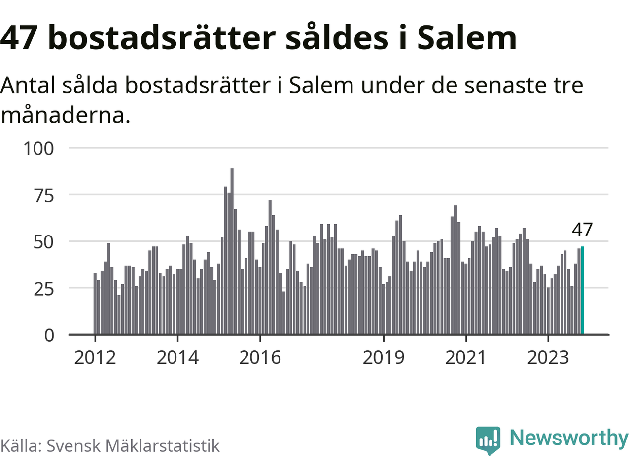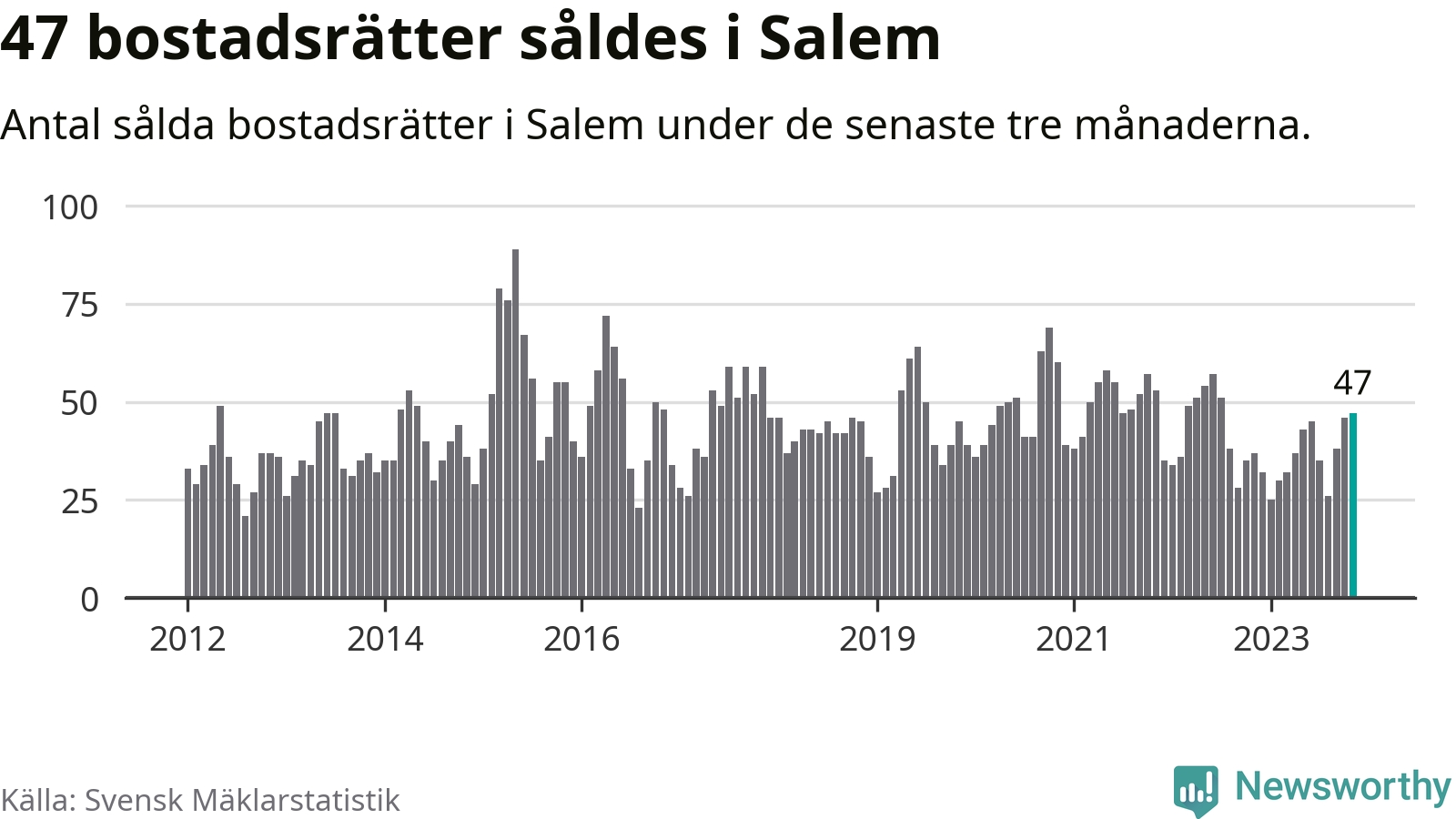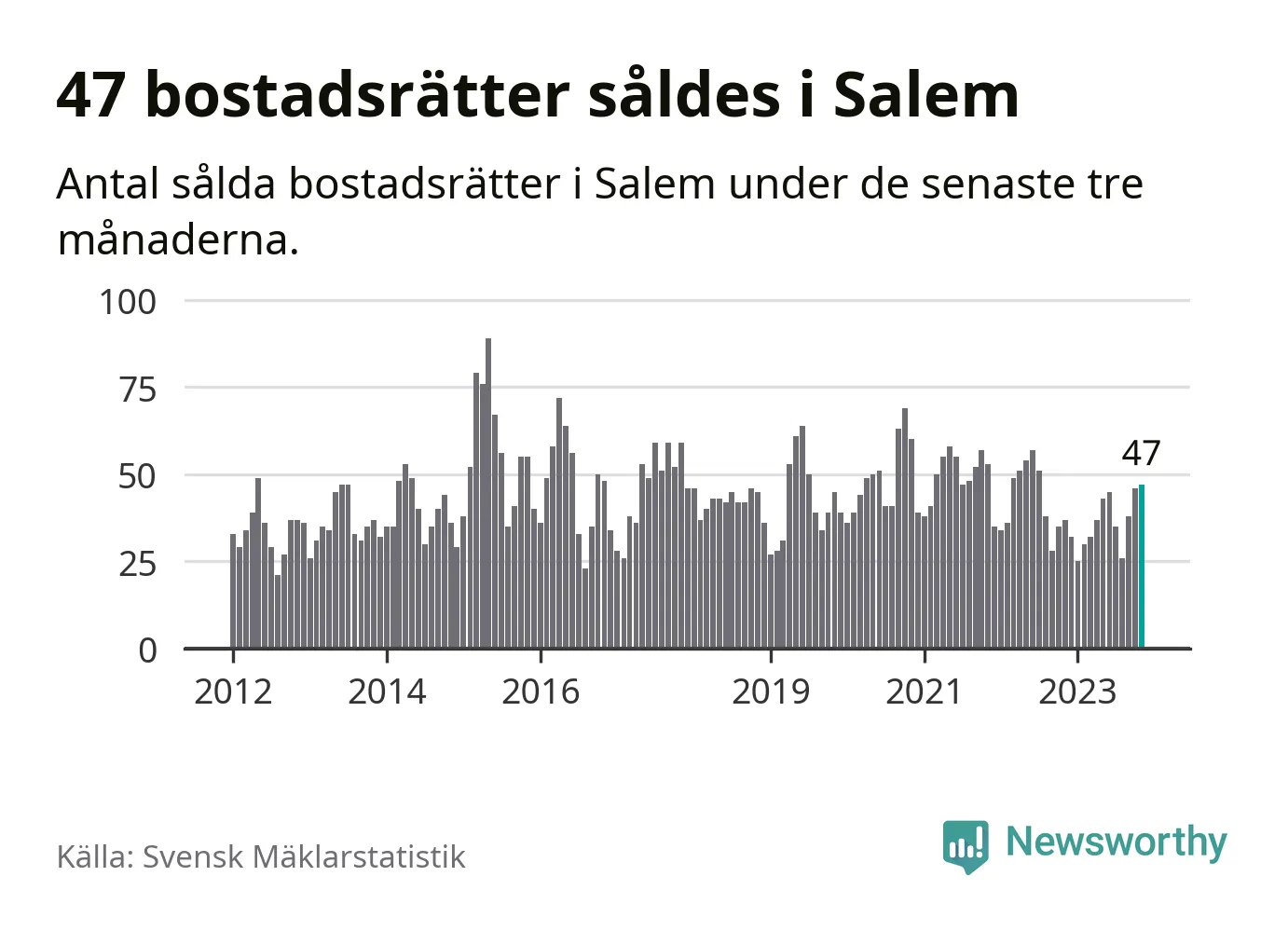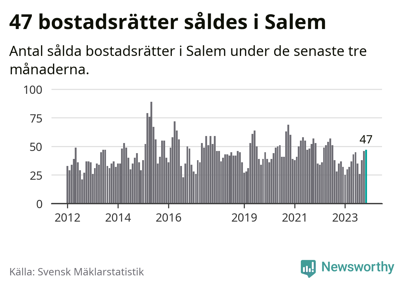 Sammanlagt såldes 47 bostadsrätter i Salems kommun mellan september och november till ett genomsnittligt pris på 2,4 miljoner kronor. I fjol gjordes 37 affärer vid den här tiden på året.