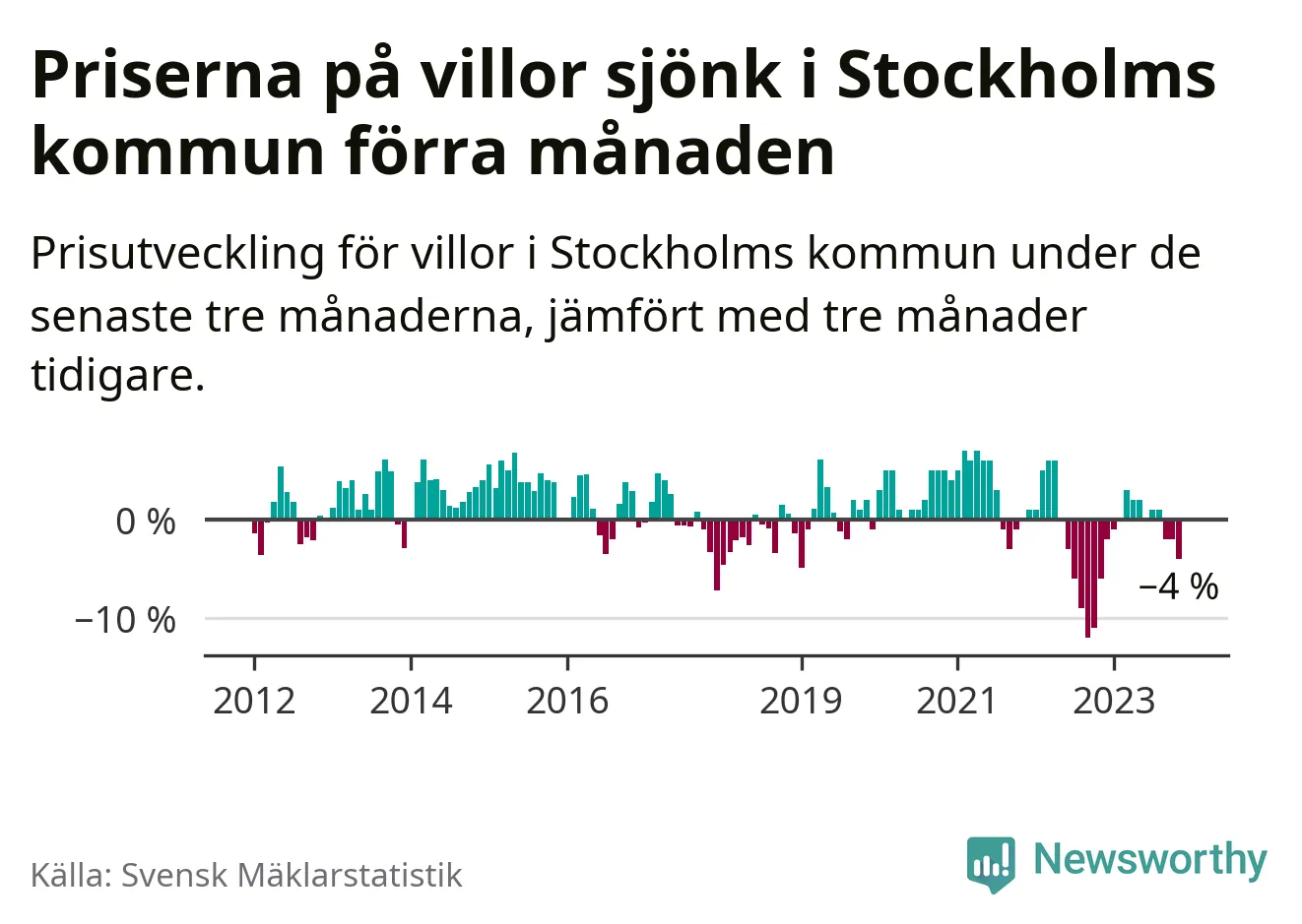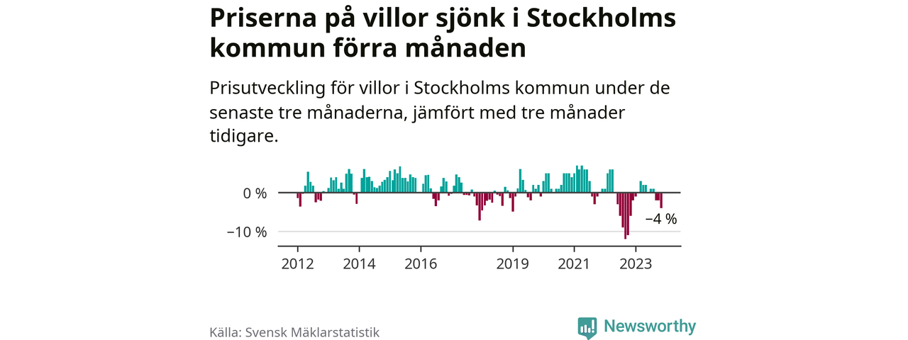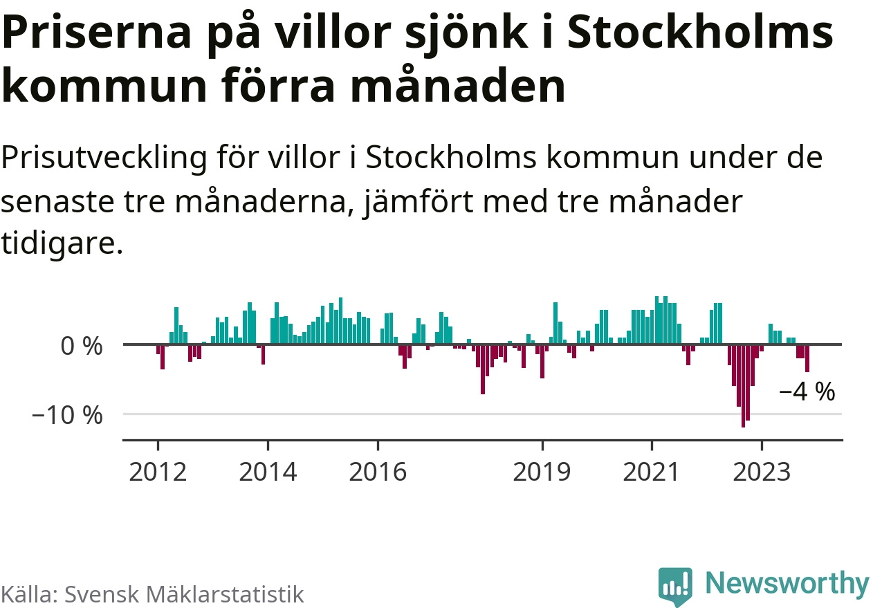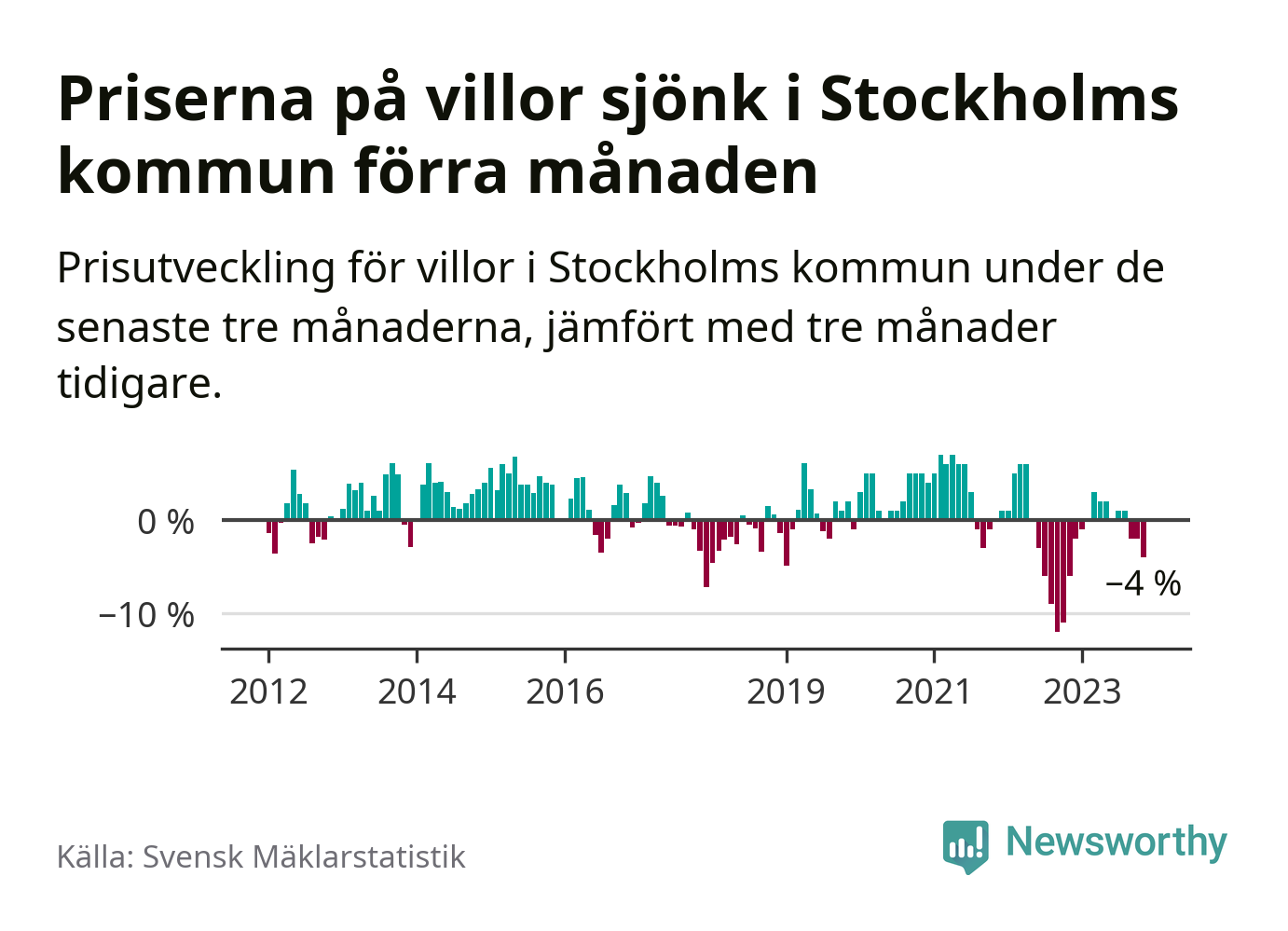 Villapriserna har gått ner i Stockholms kommun. Medelpriset på försäljningarna under de senaste tre månaderna visar på en nedgång med 4 procent.