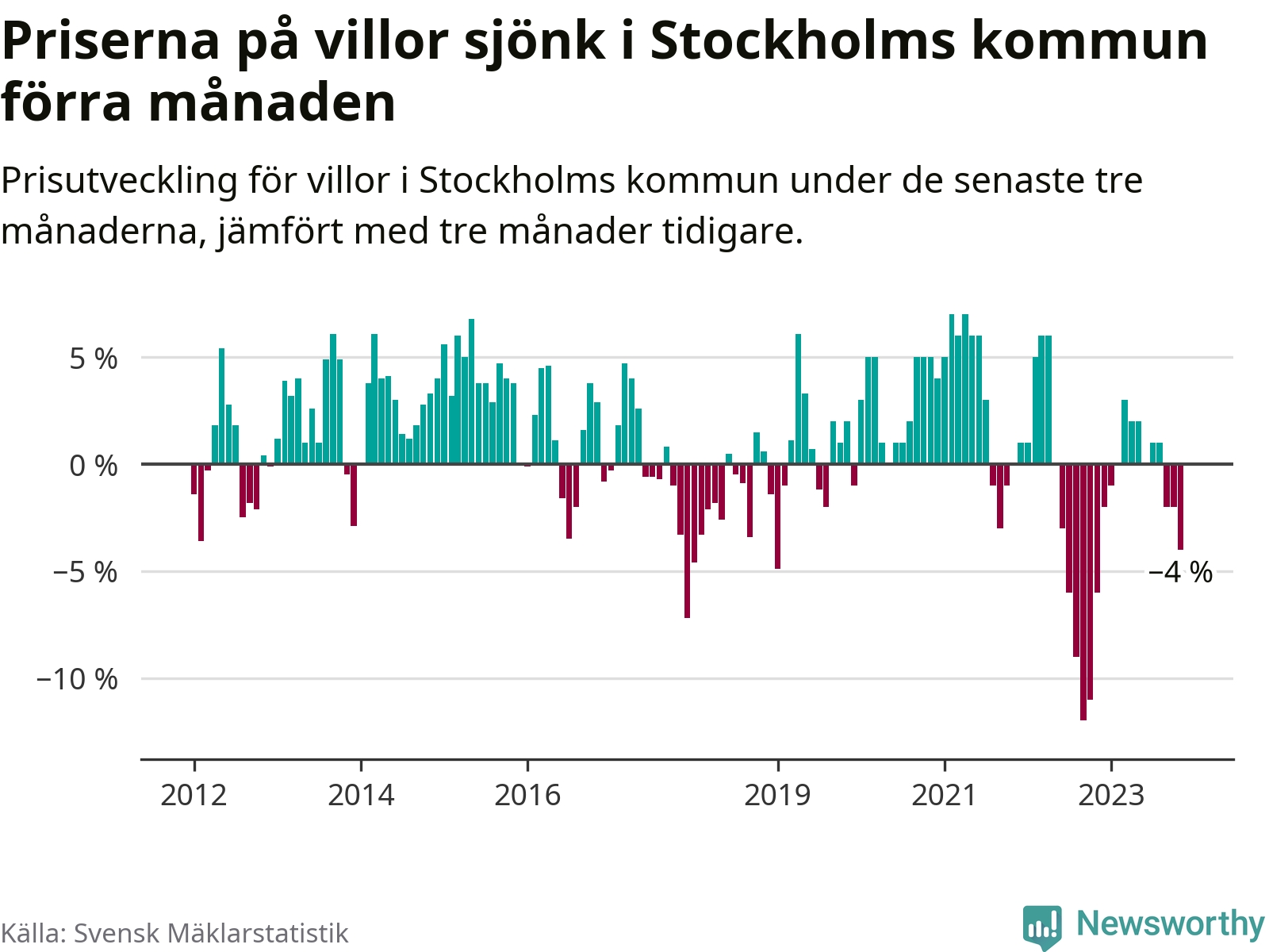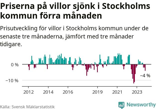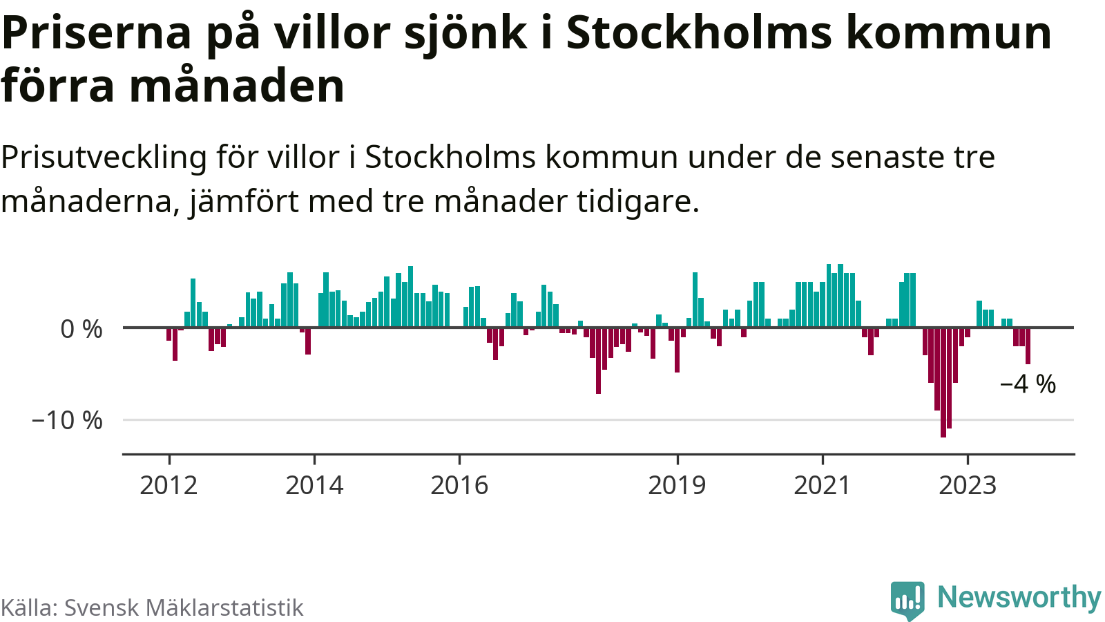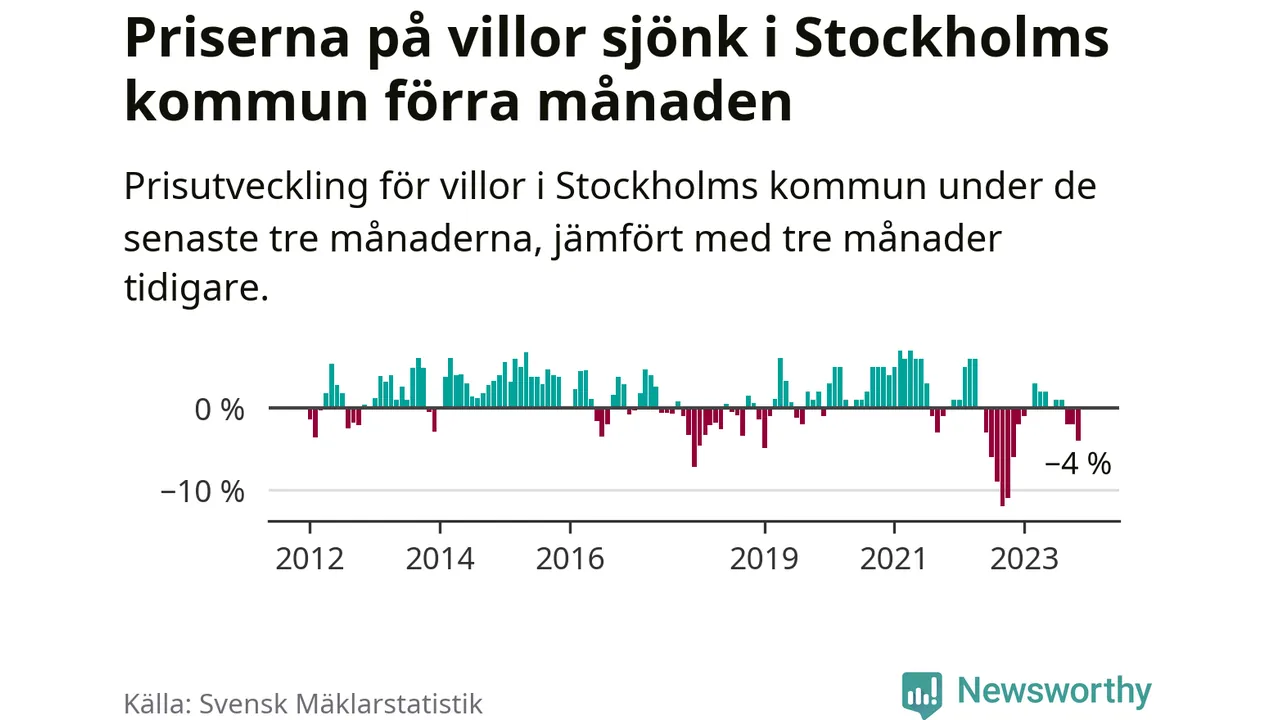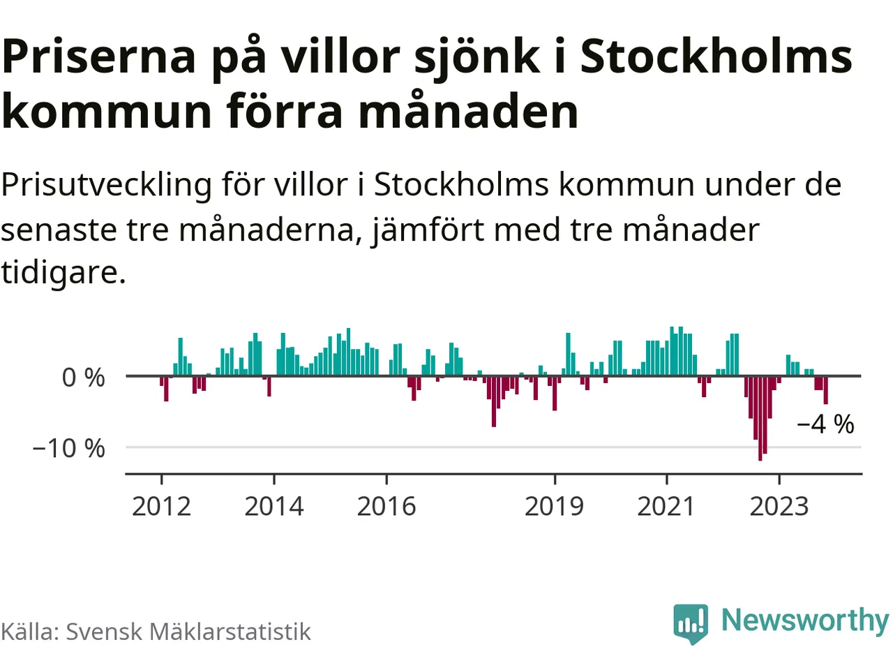 Villapriserna har gått ner i Stockholms kommun. Medelpriset på försäljningarna under de senaste tre månaderna visar på en nedgång med 4 procent.