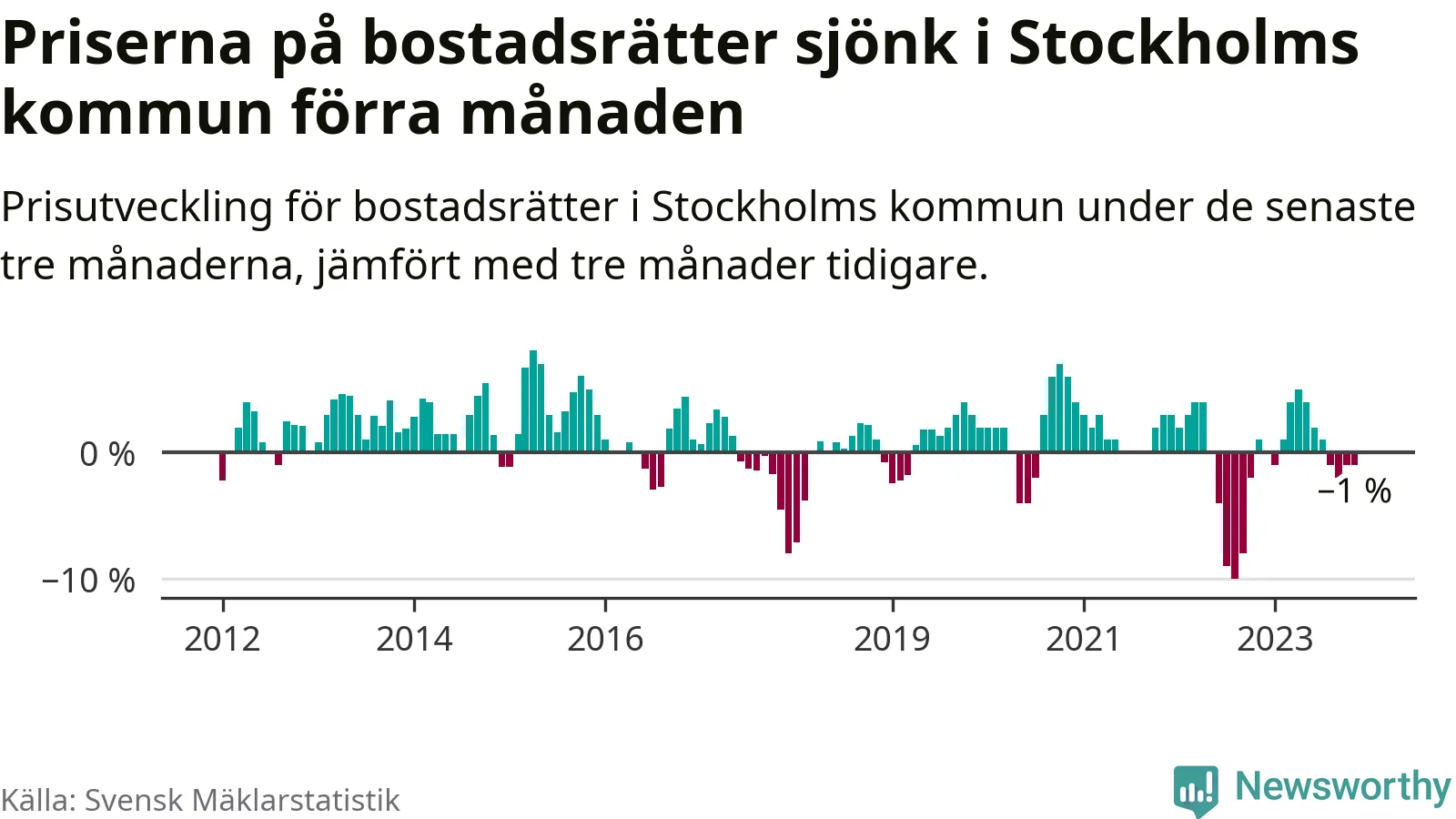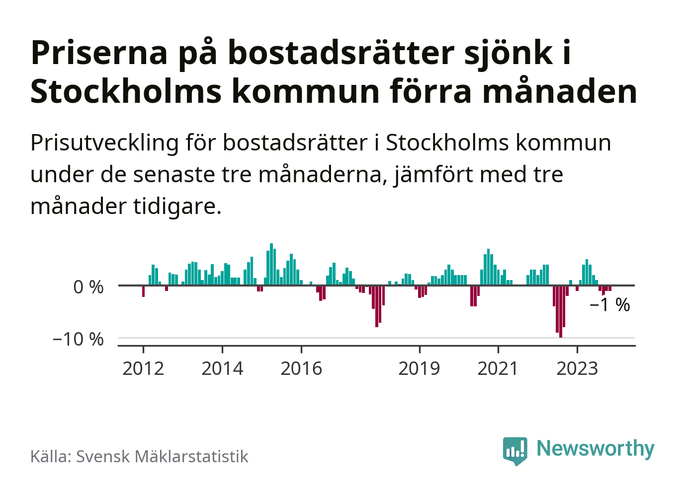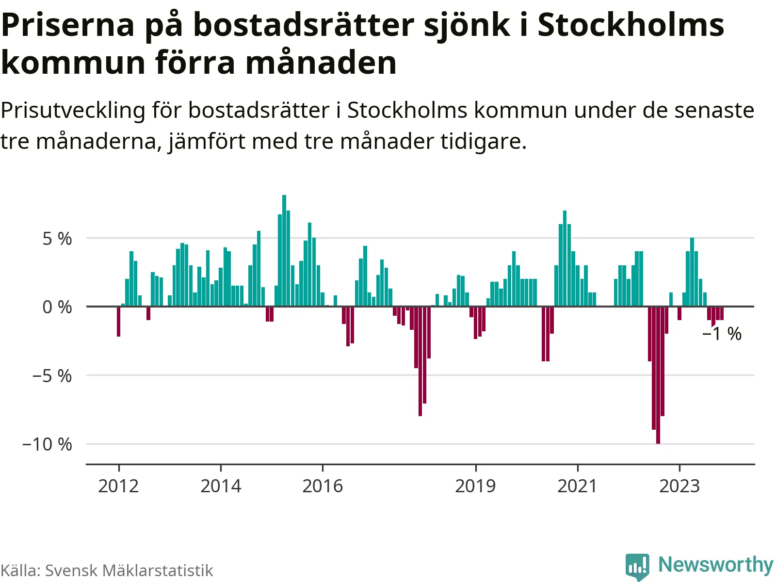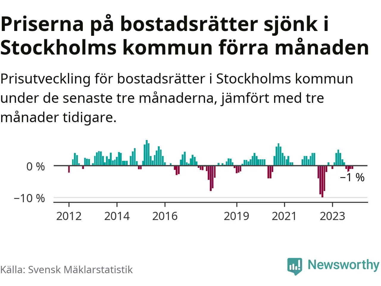 Priserna på bostadsrätter har gått ner i Stockholms kommun. Medelpriset på försäljningarna under de senaste tre månaderna visar på en nedgång med 1 procent.