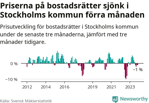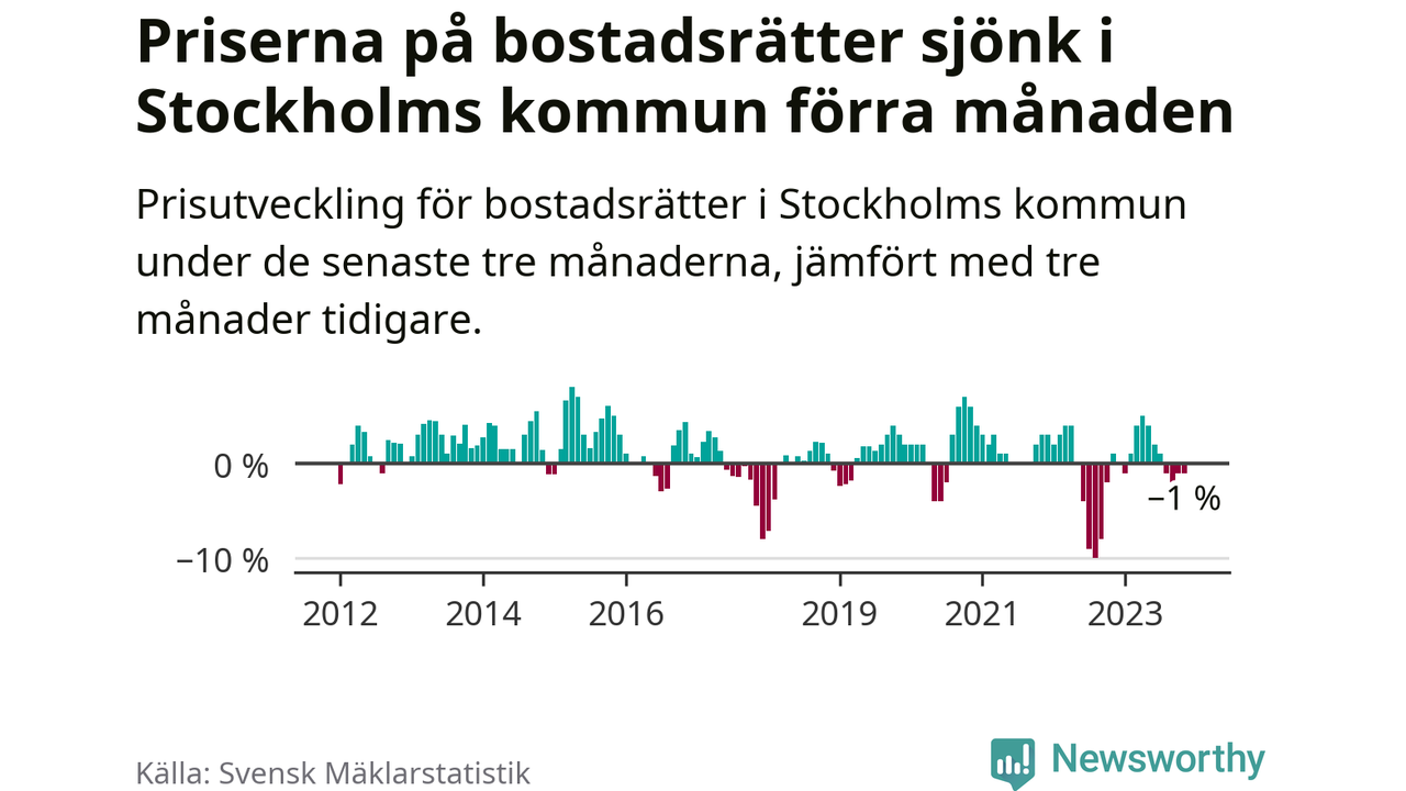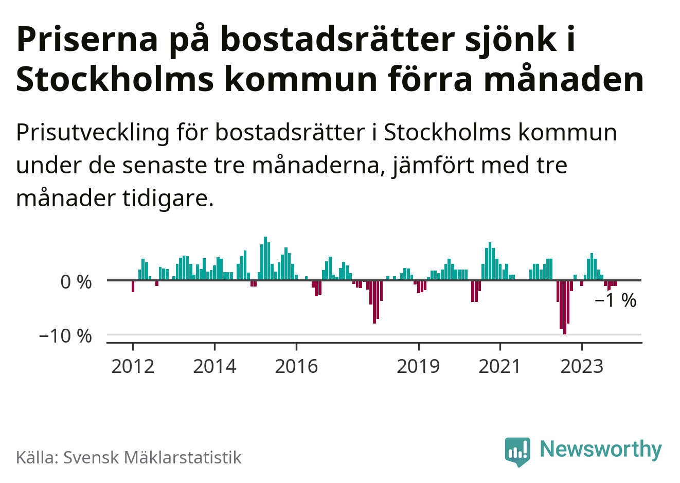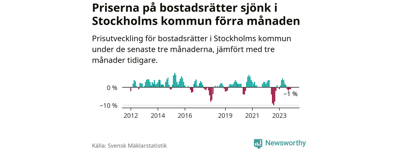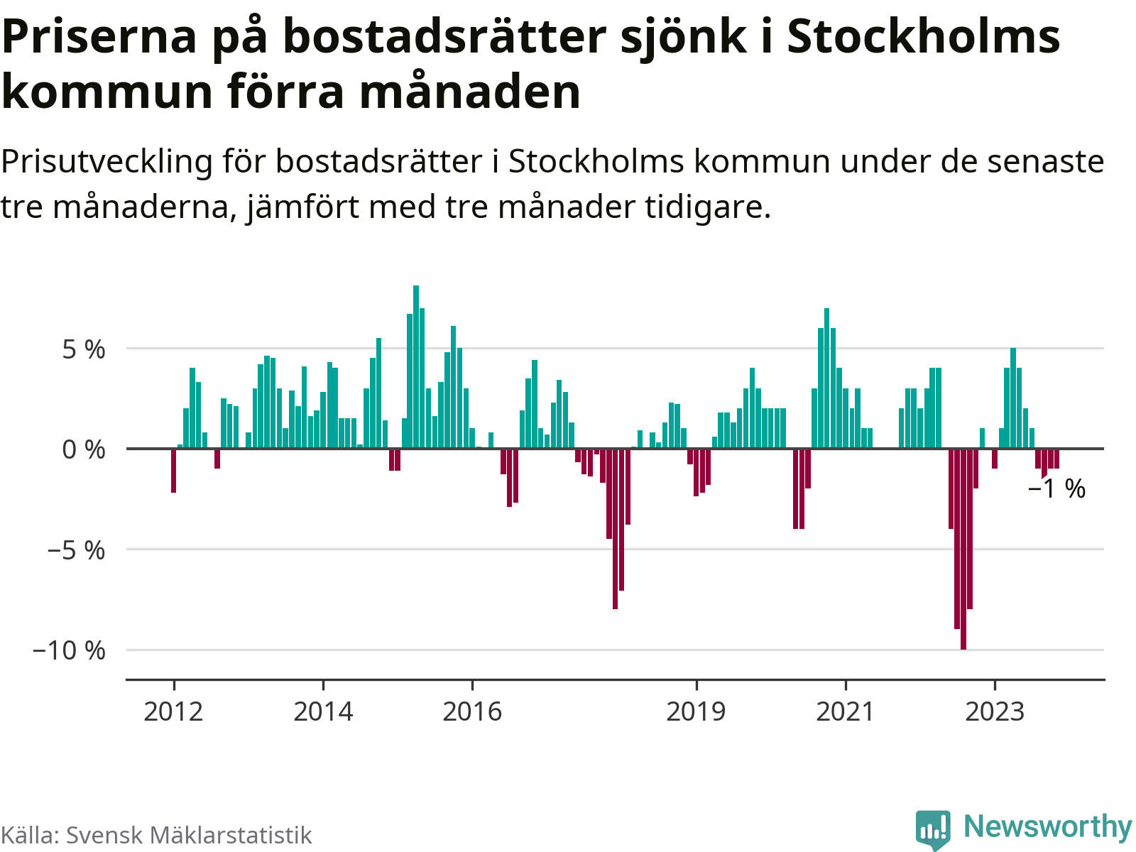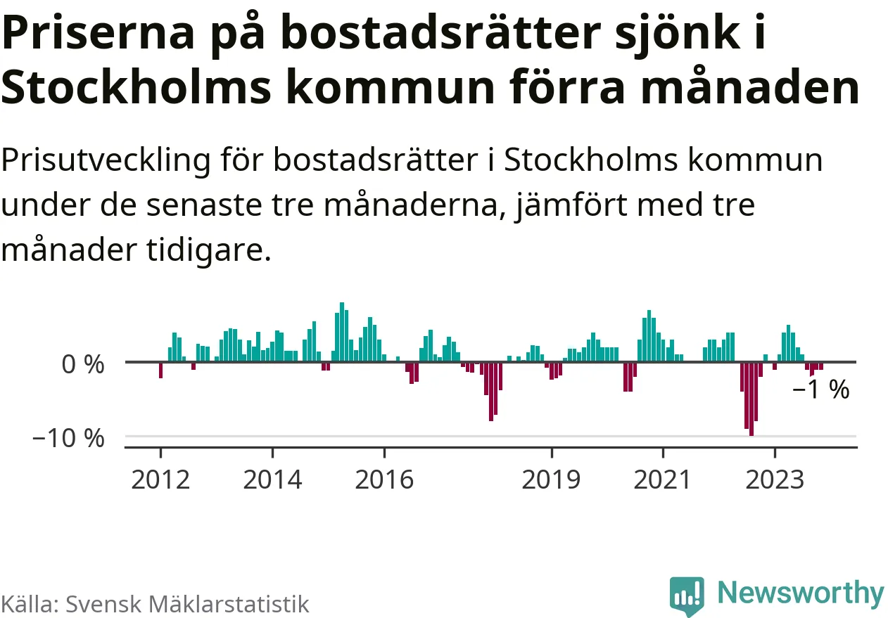 Priserna på bostadsrätter har gått ner i Stockholms kommun. Medelpriset på försäljningarna under de senaste tre månaderna visar på en nedgång med 1 procent.