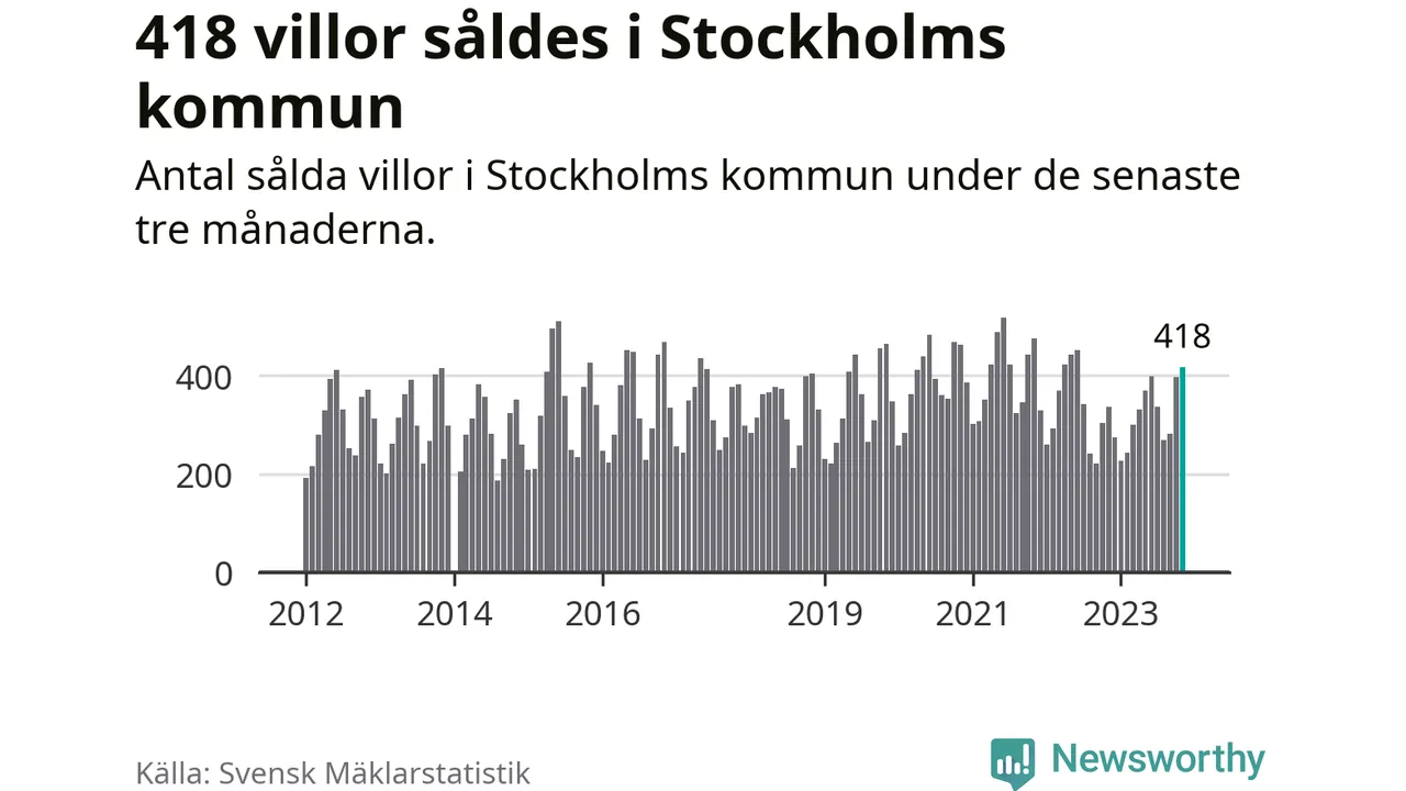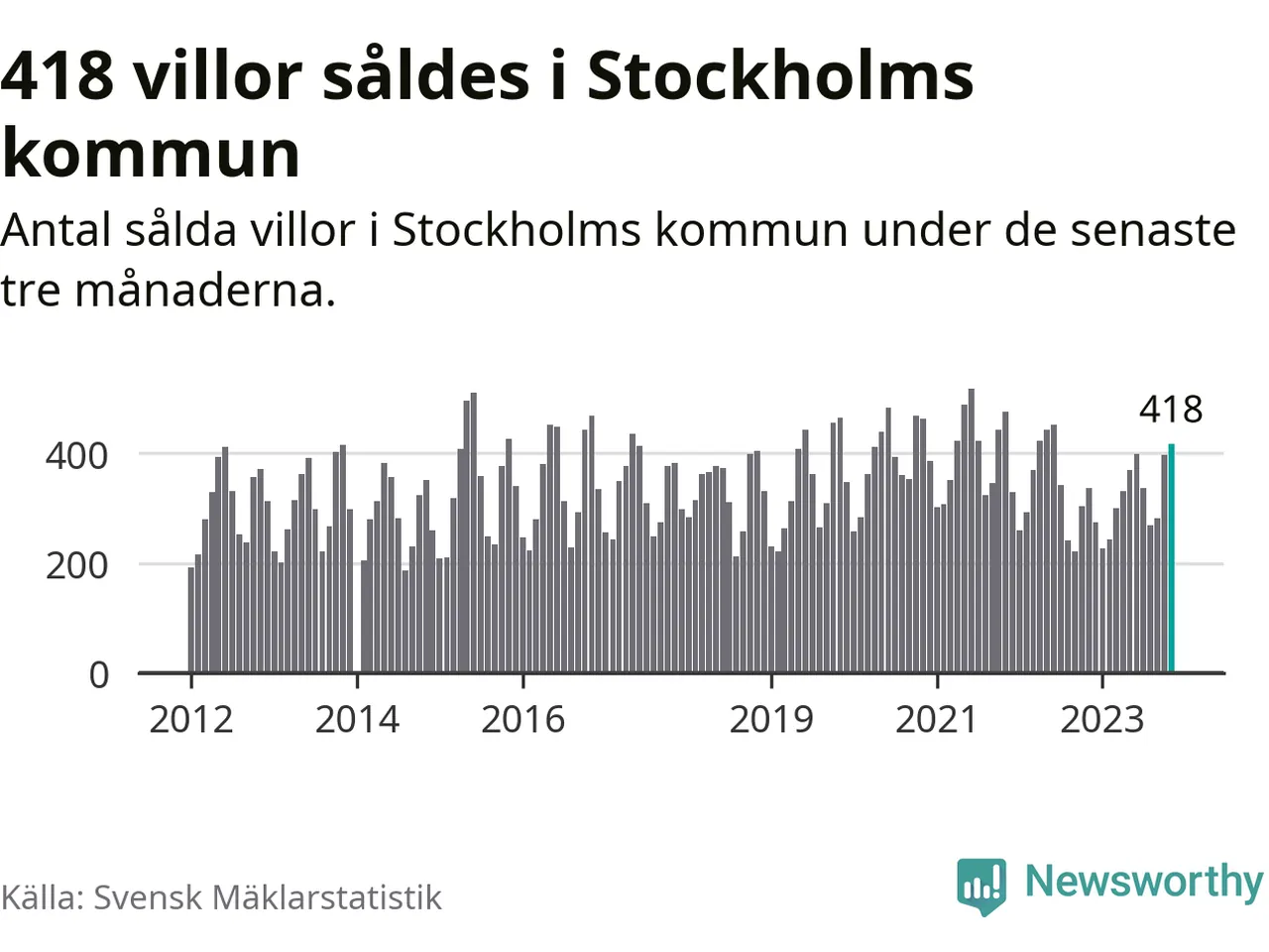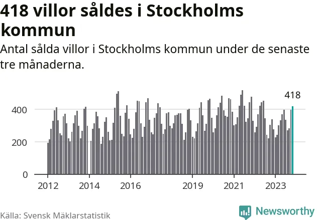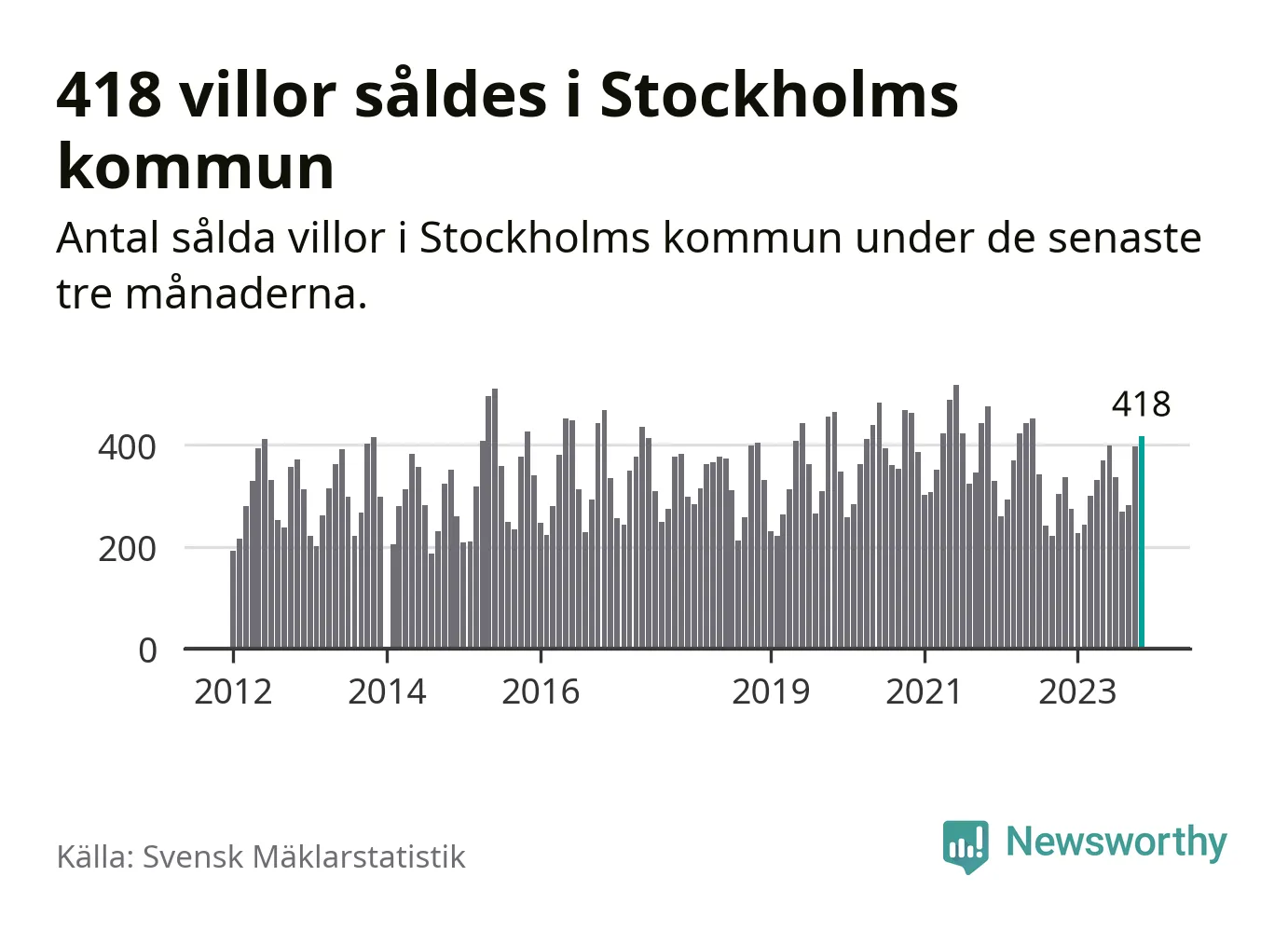 Sammanlagt såldes 418 villor i Stockholms kommun mellan september och november till ett genomsnittligt pris på 8,4 miljoner kronor. I fjol gjordes 337 affärer vid den här tiden på året.