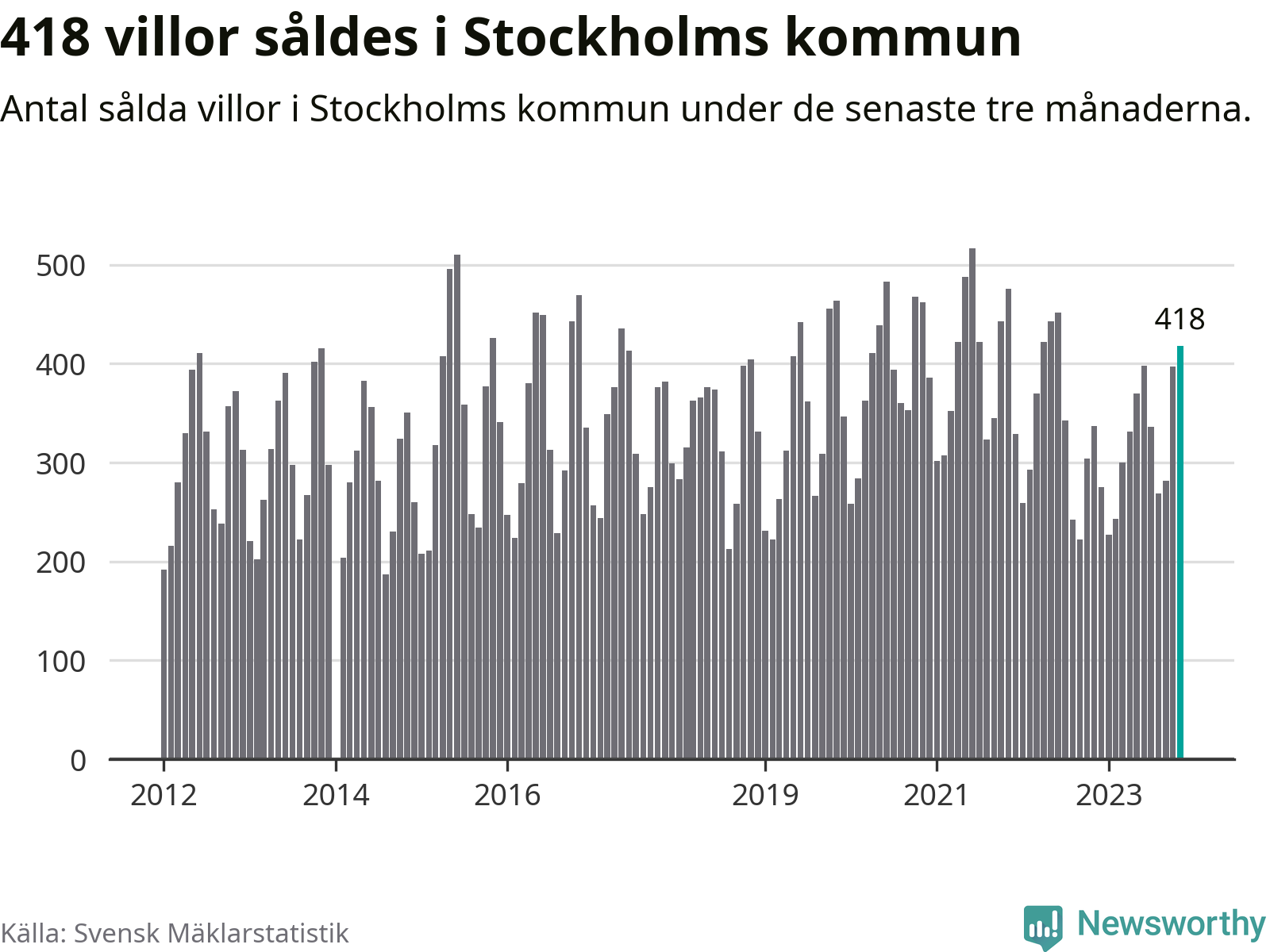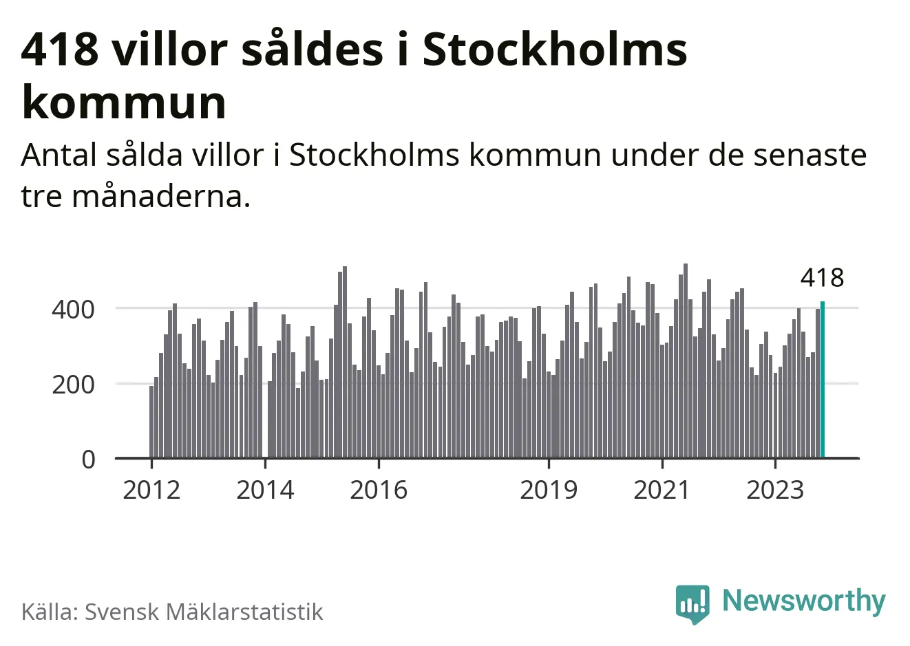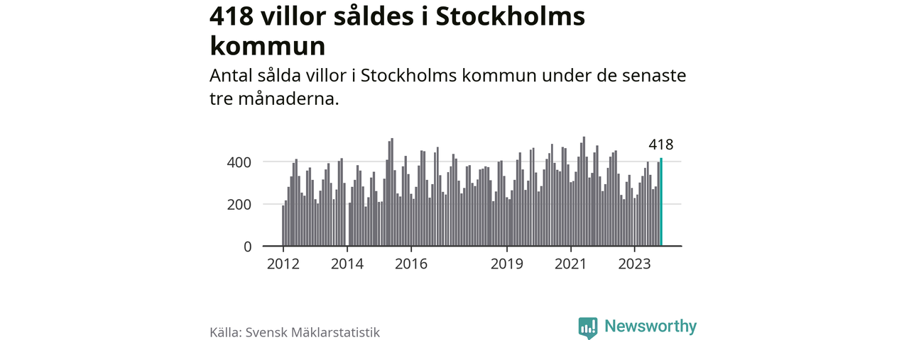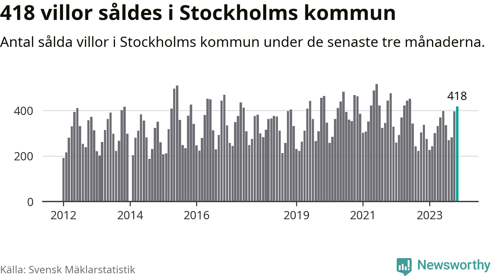 Sammanlagt såldes 418 villor i Stockholms kommun mellan september och november till ett genomsnittligt pris på 8,4 miljoner kronor. I fjol gjordes 337 affärer vid den här tiden på året.