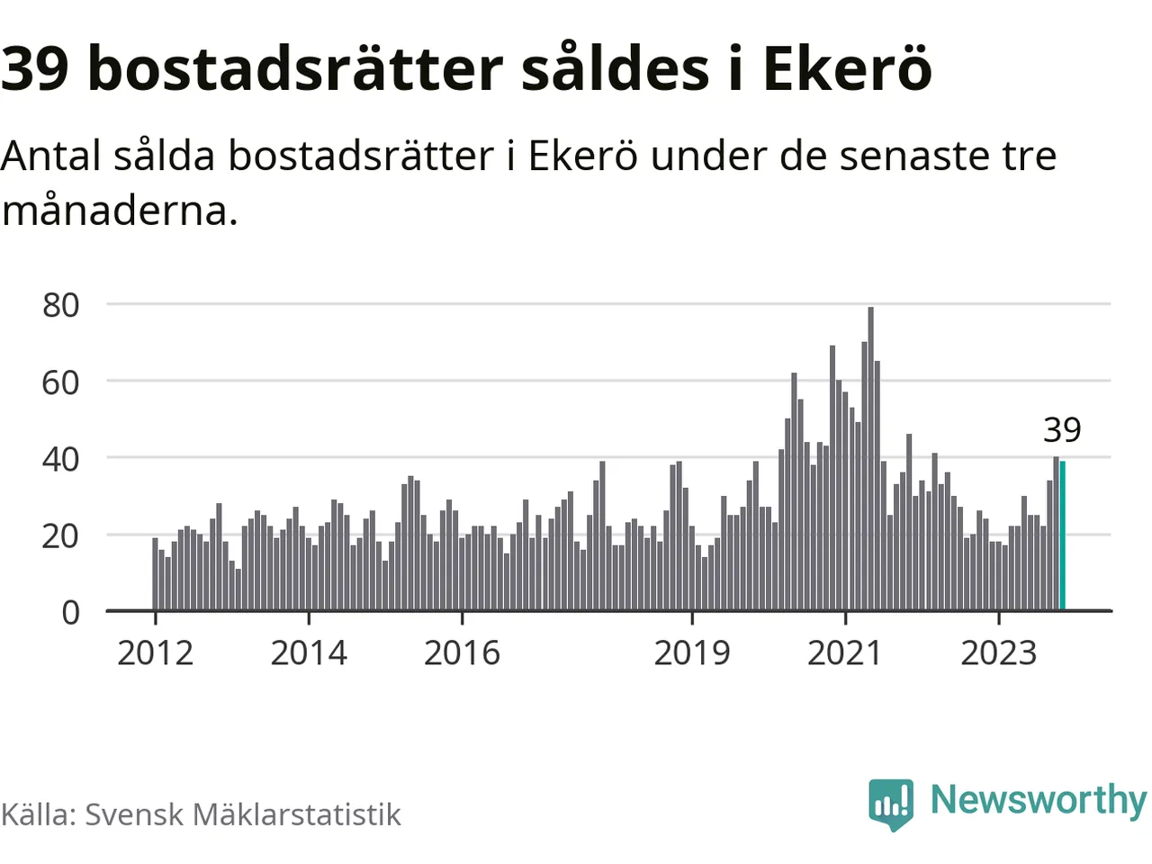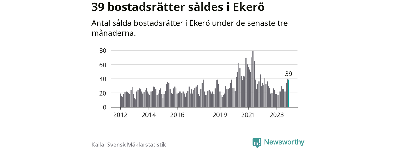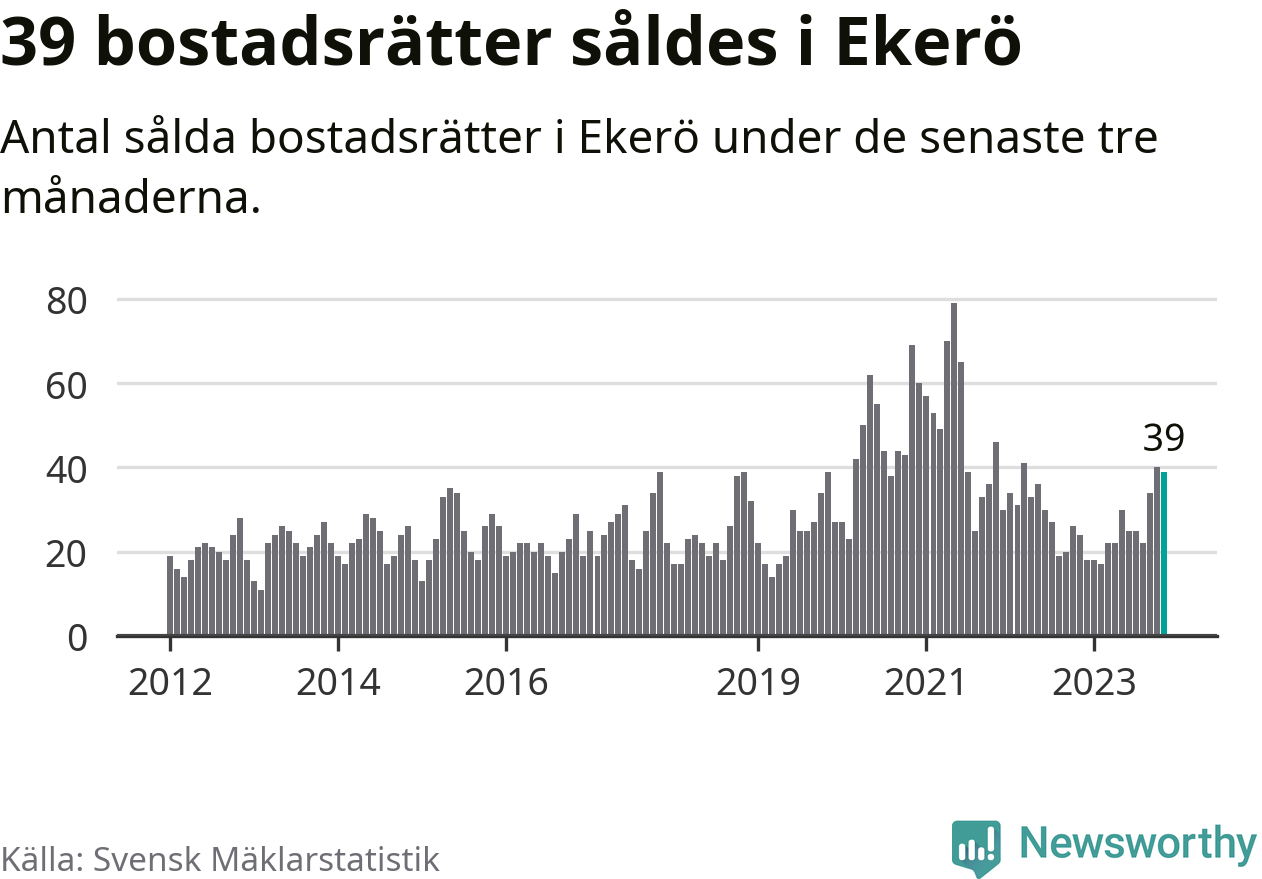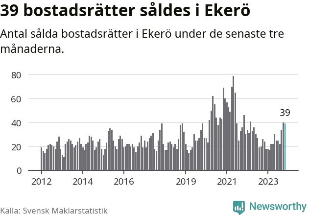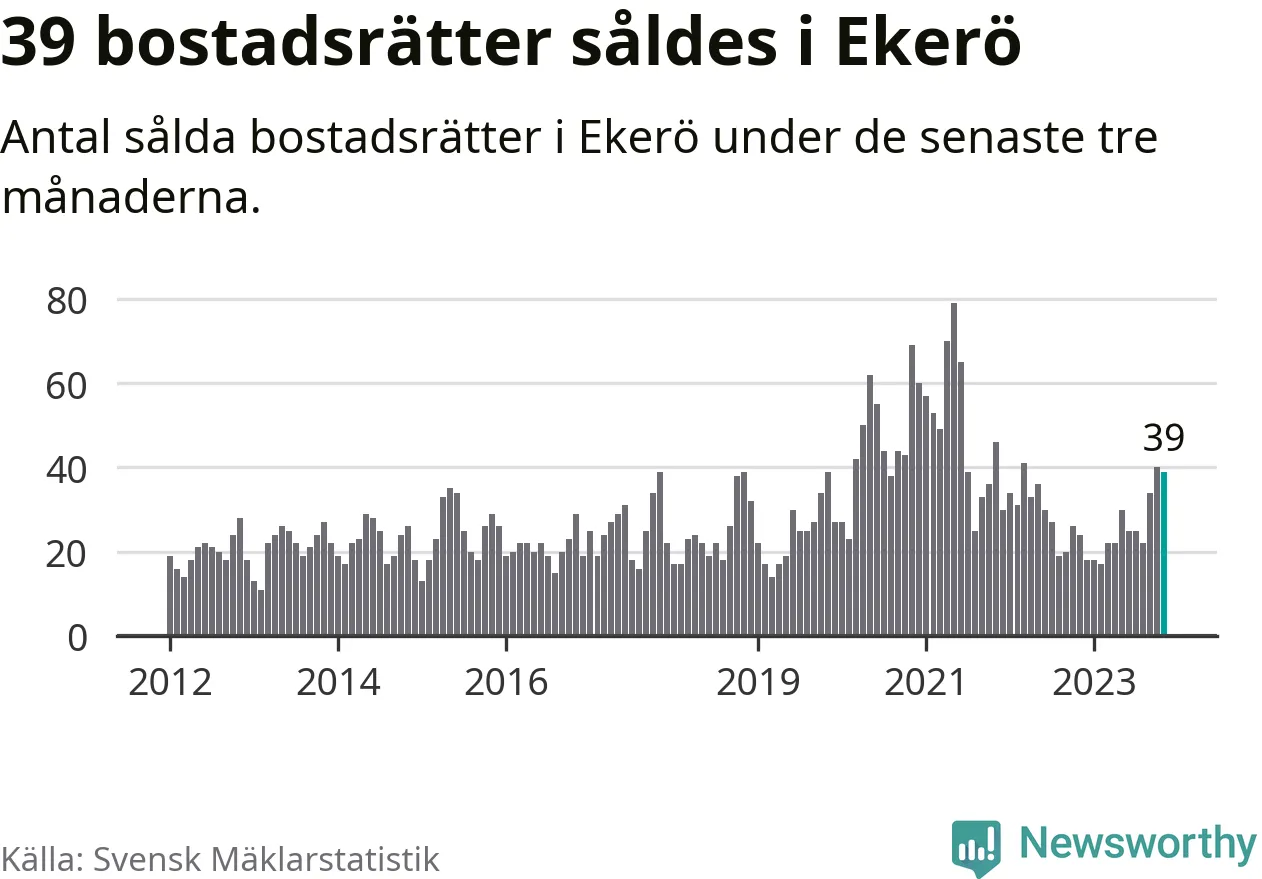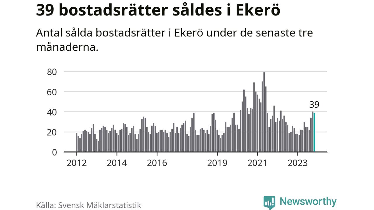Mellan september och november gjordes sammanlagt 39 affärer med bostadsrätter i Ekerö kommun. Det kan jämföras med 24 vid motsvarande tid i fjol.