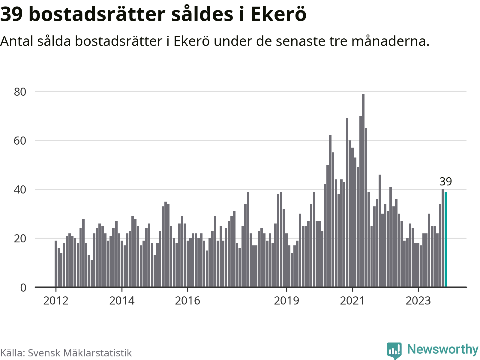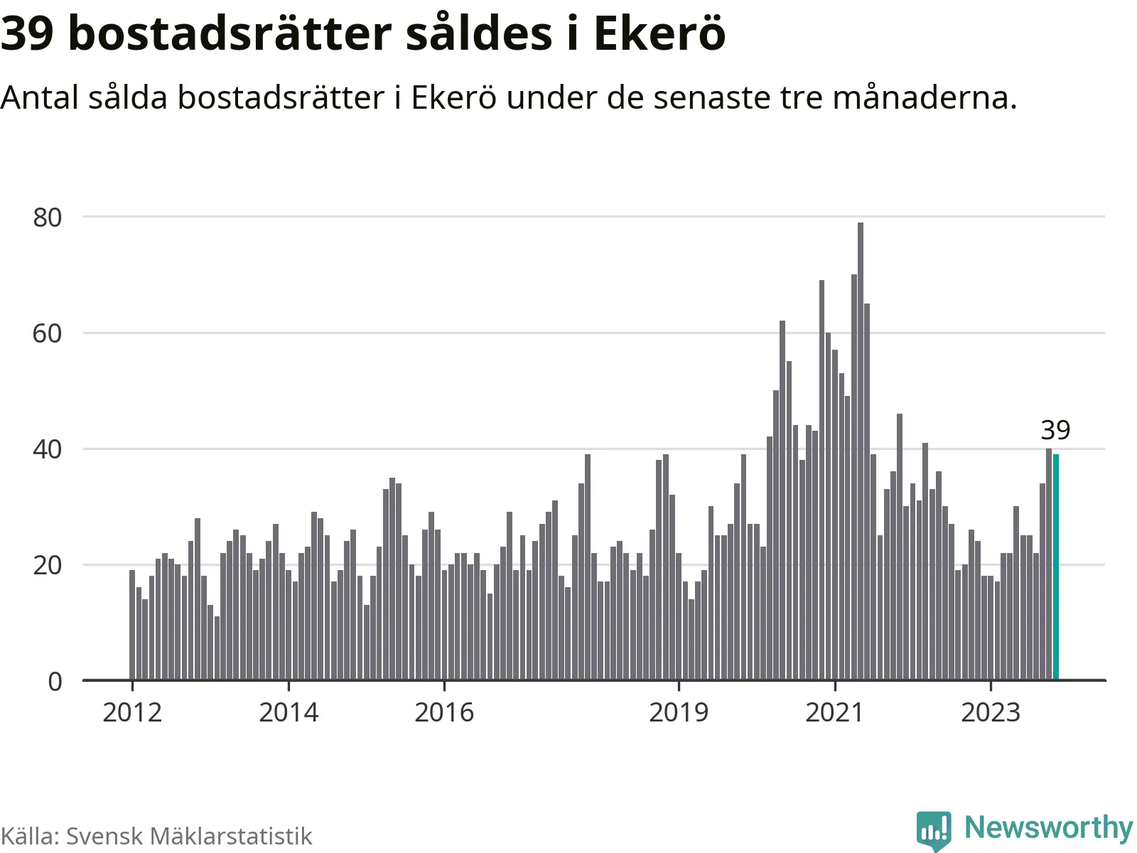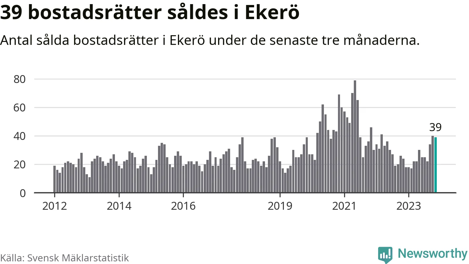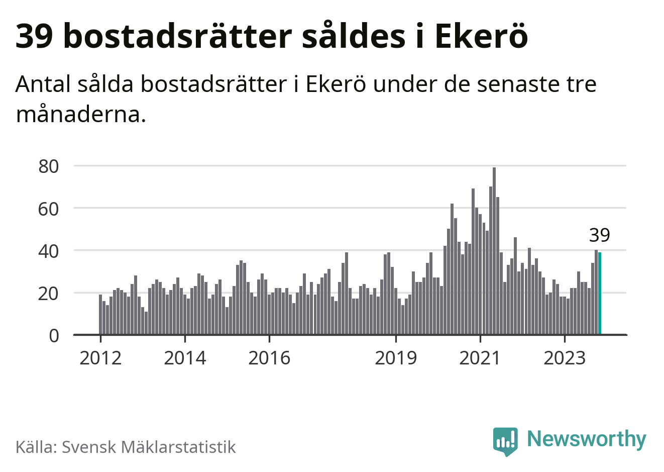 Mellan september och november gjordes sammanlagt 39 affärer med bostadsrätter i Ekerö kommun. Det kan jämföras med 24 vid motsvarande tid i fjol.