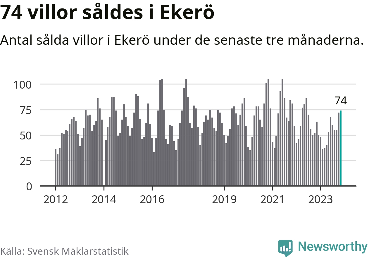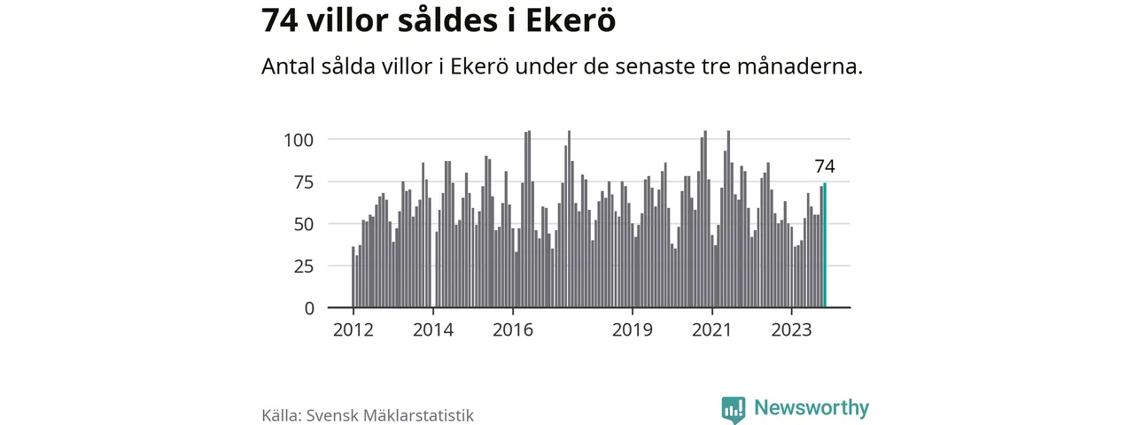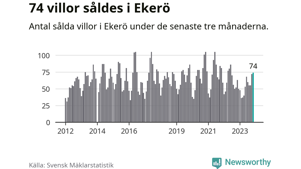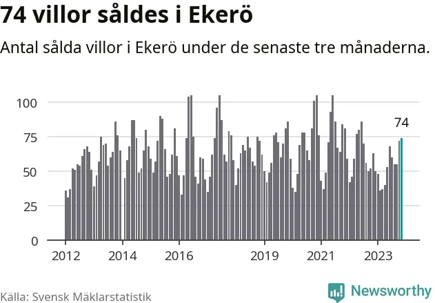 Sammanlagt såldes 74 villor i Ekerö kommun mellan september och november till ett genomsnittligt pris på 6,0 miljoner kronor. I fjol gjordes 63 affärer vid den här tiden på året.