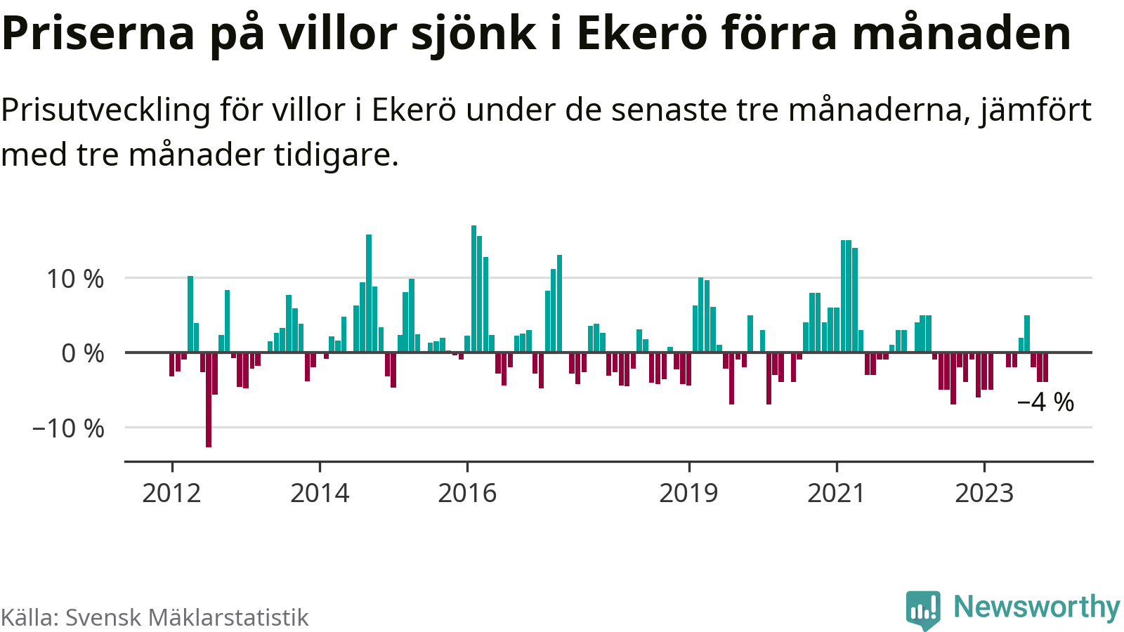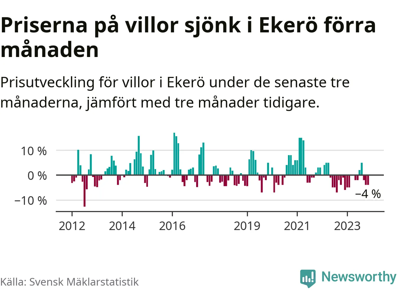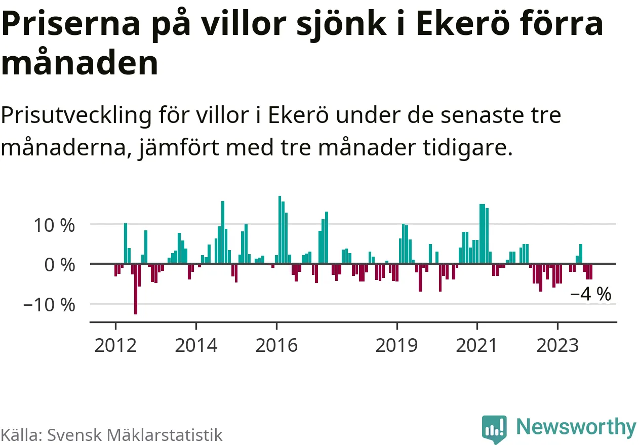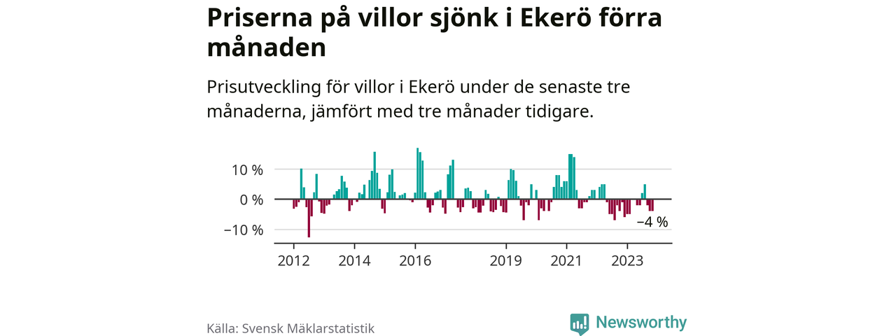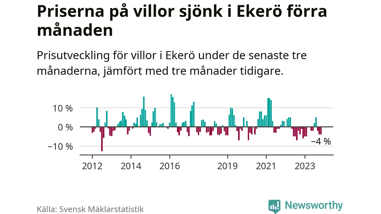 Villapriserna har gått ner i Ekerö kommun. Medelpriset på försäljningarna under de senaste tre månaderna visar på en nedgång med 4 procent.