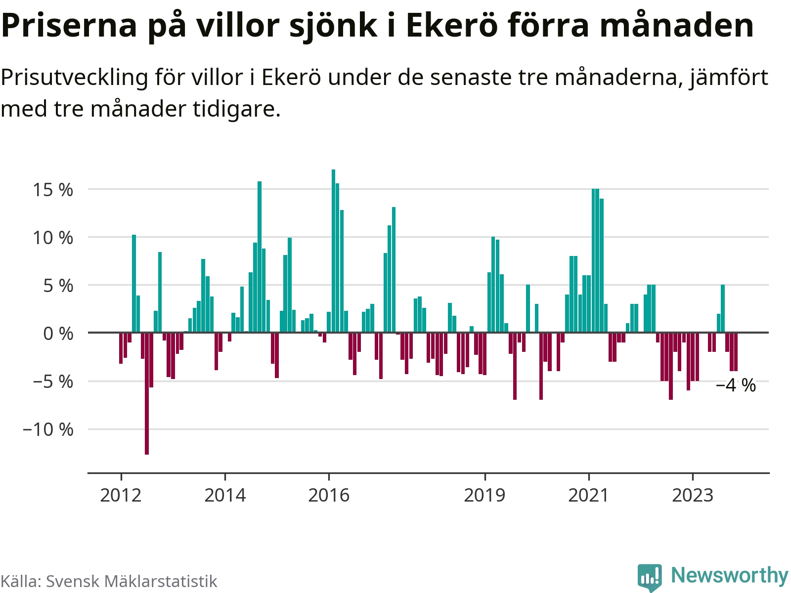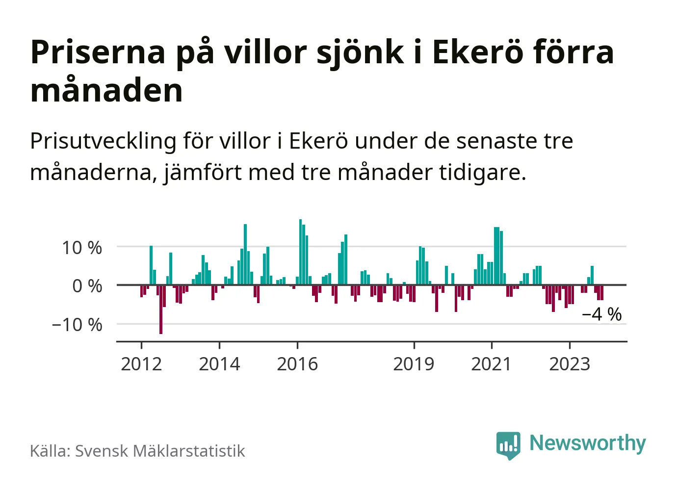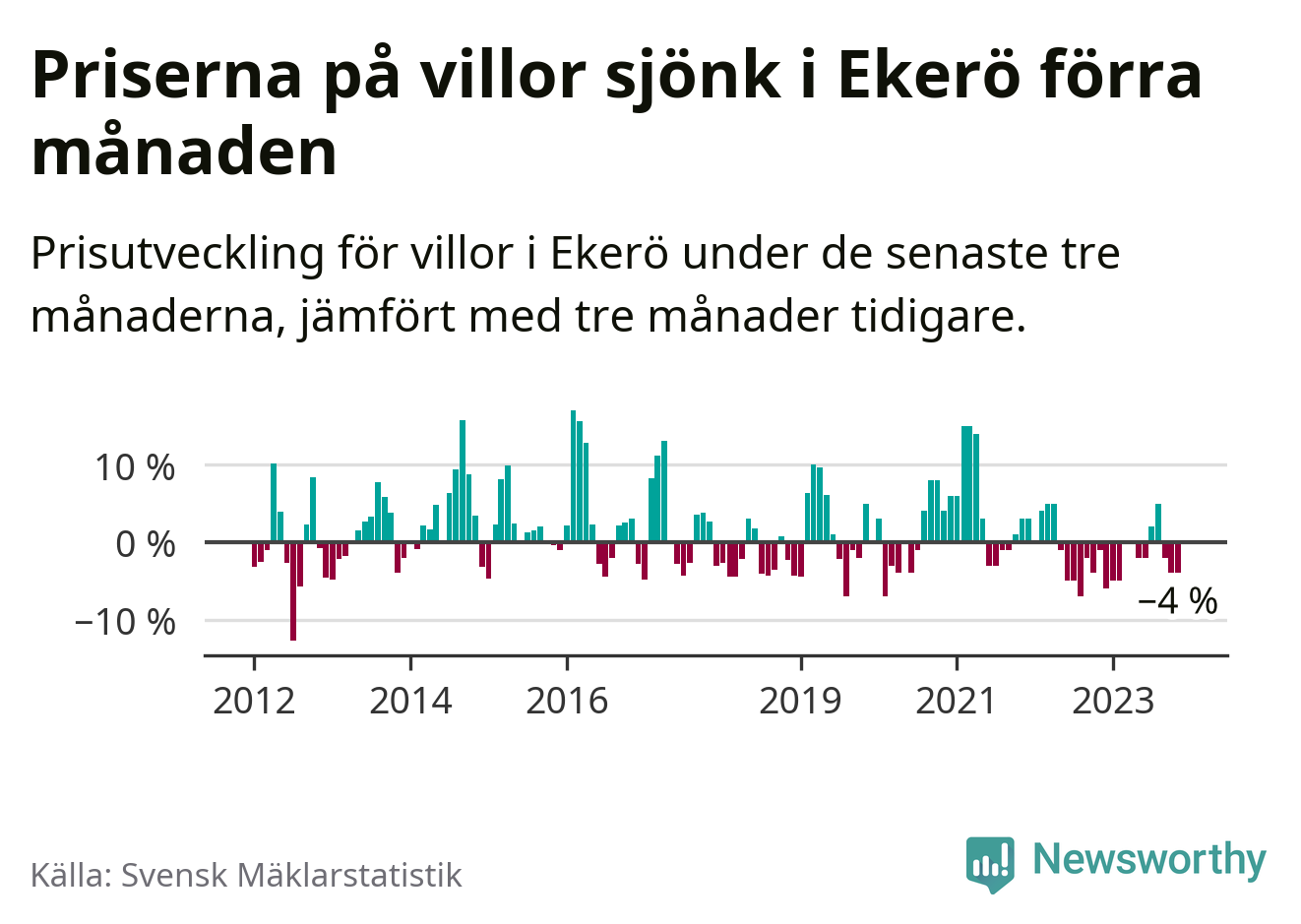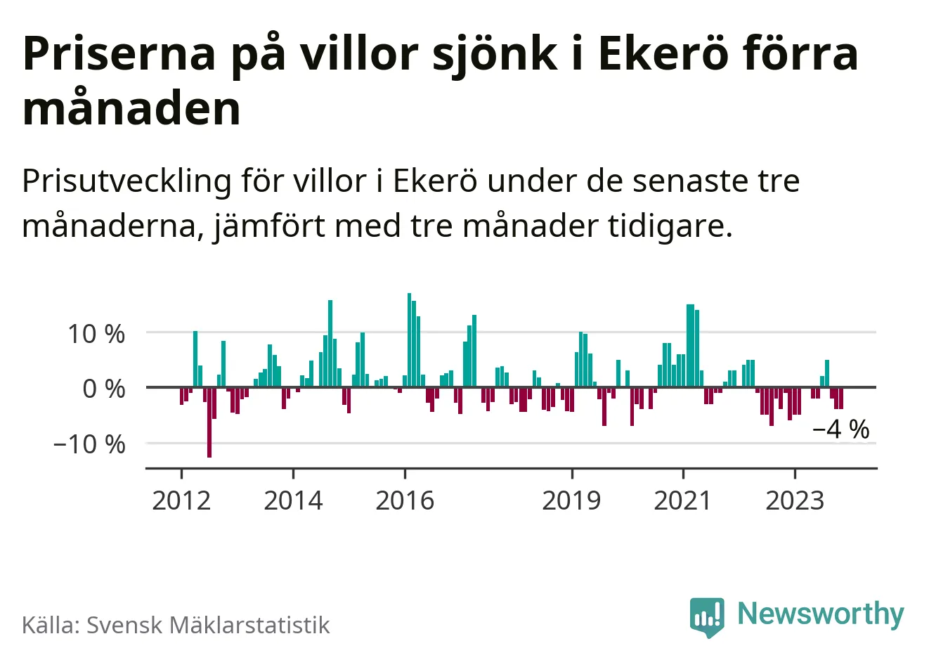 Villapriserna har gått ner i Ekerö kommun. Medelpriset på försäljningarna under de senaste tre månaderna visar på en nedgång med 4 procent.