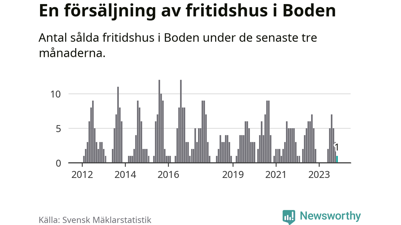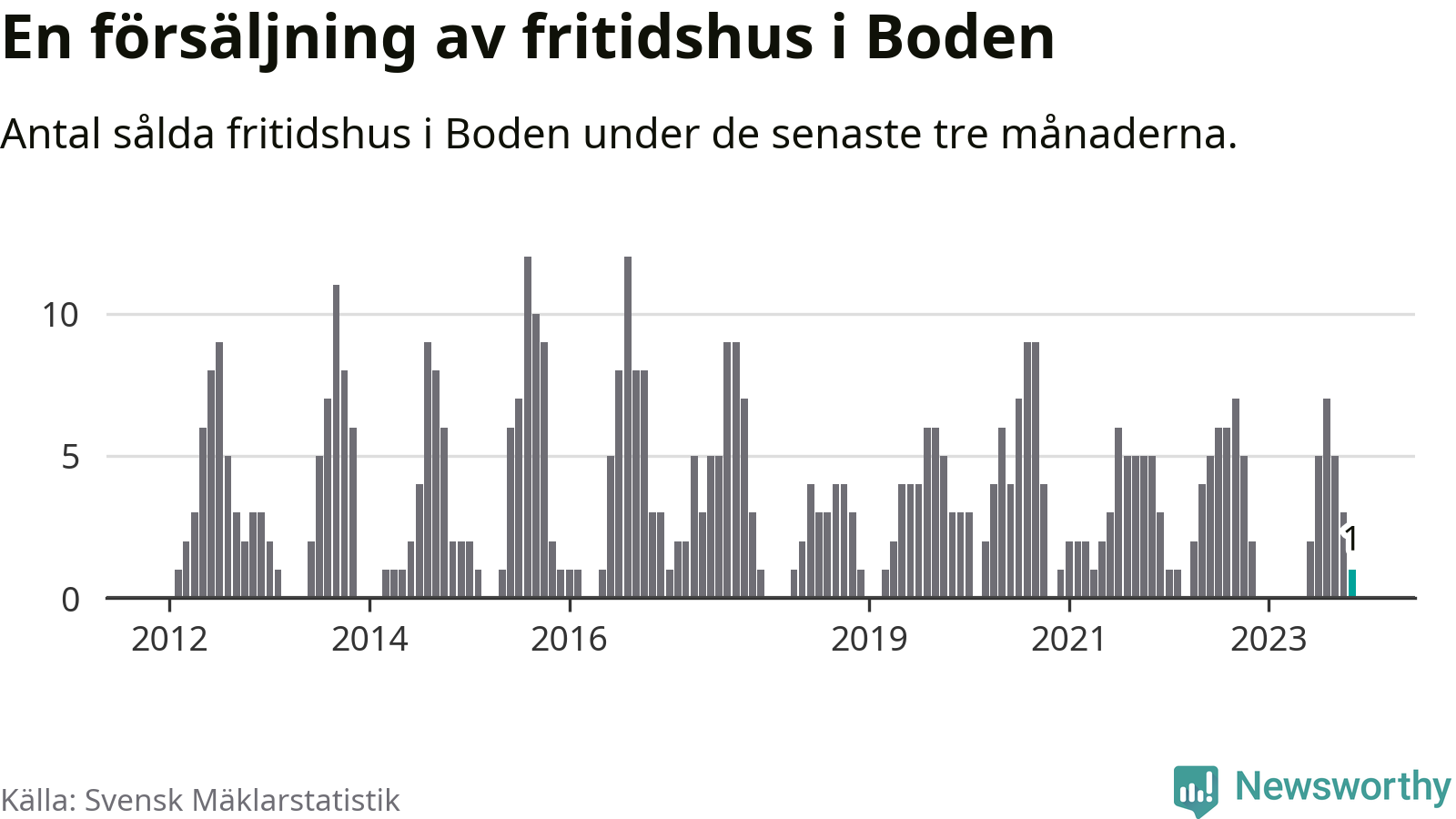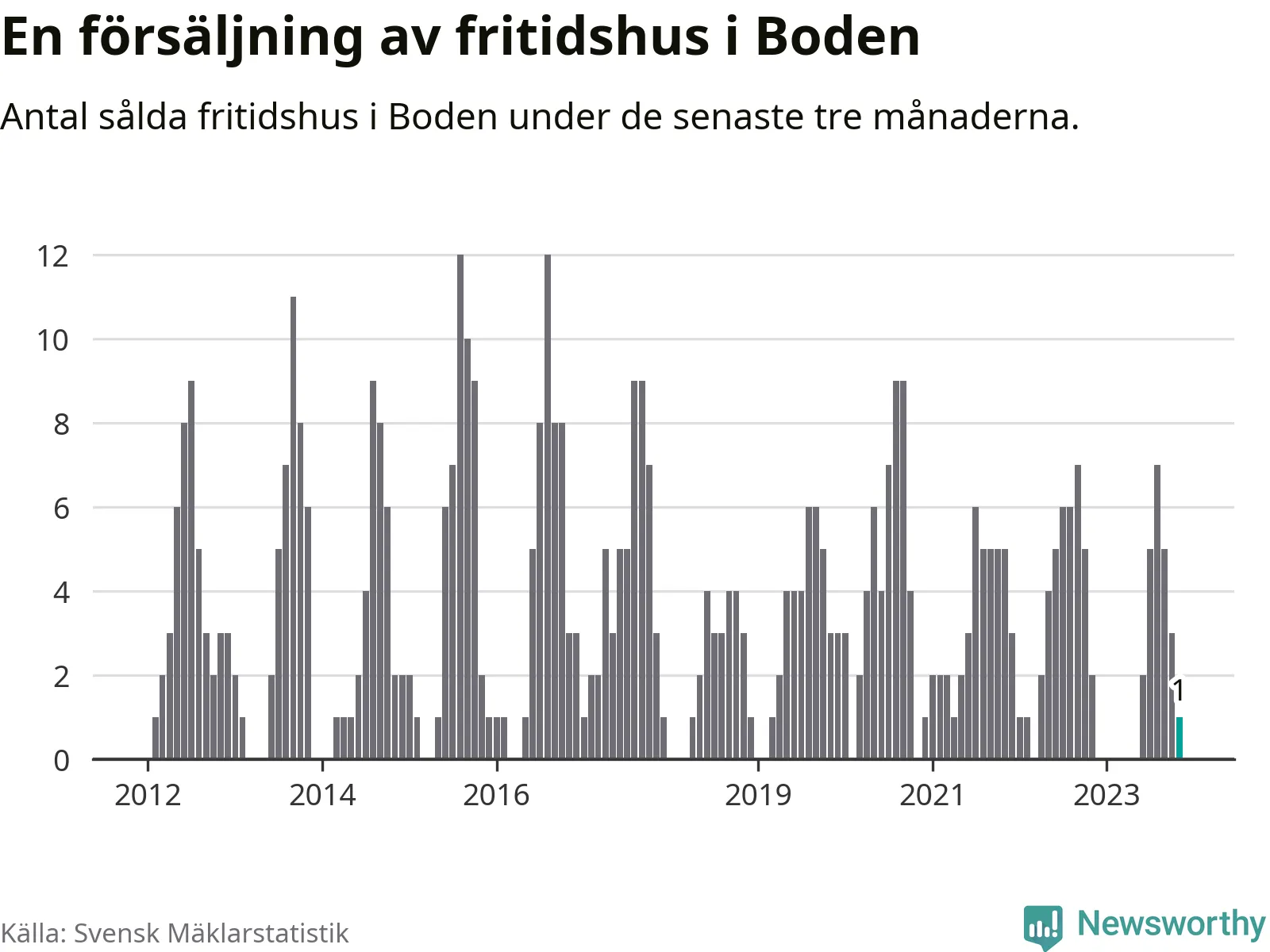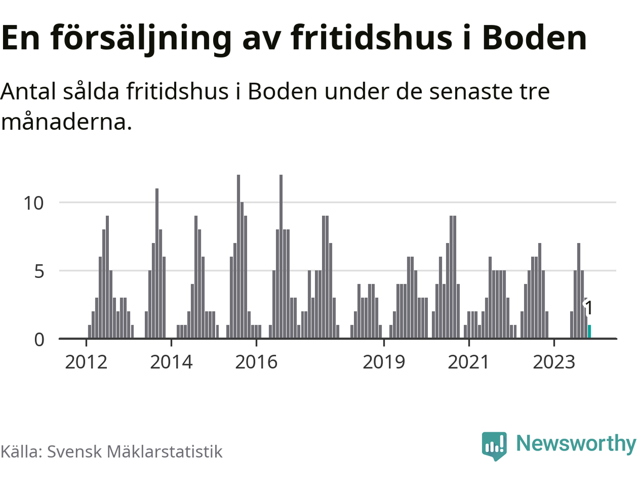 Mellan september och november gjordes sammanlagt en affär med fritidshus i Bodens kommun. Det kan jämföras med två vid motsvarande tid i fjol.