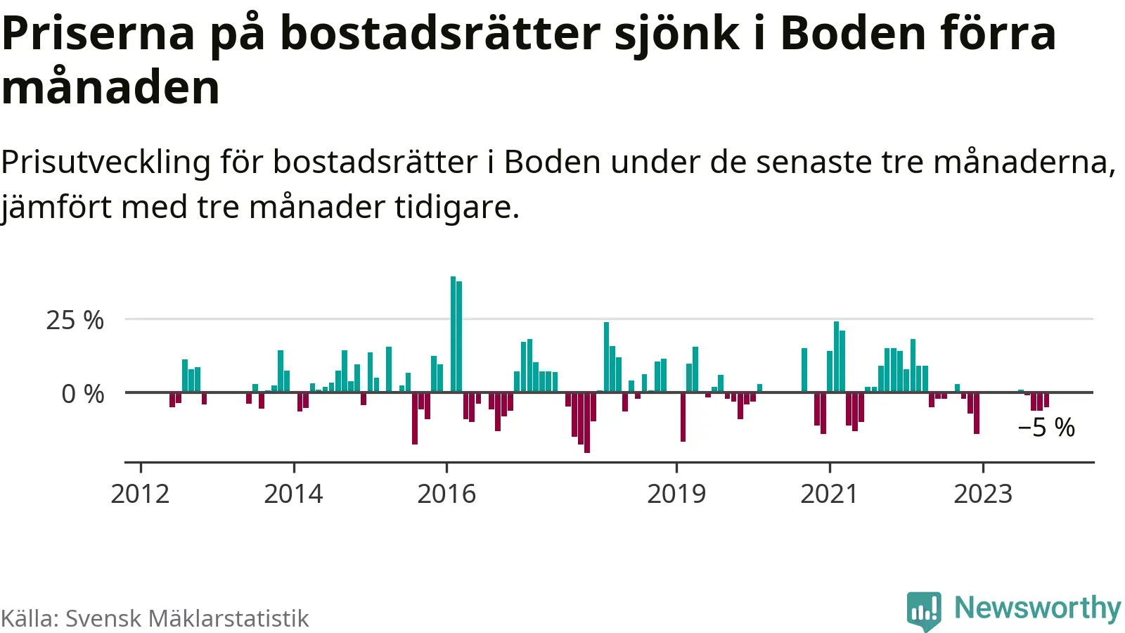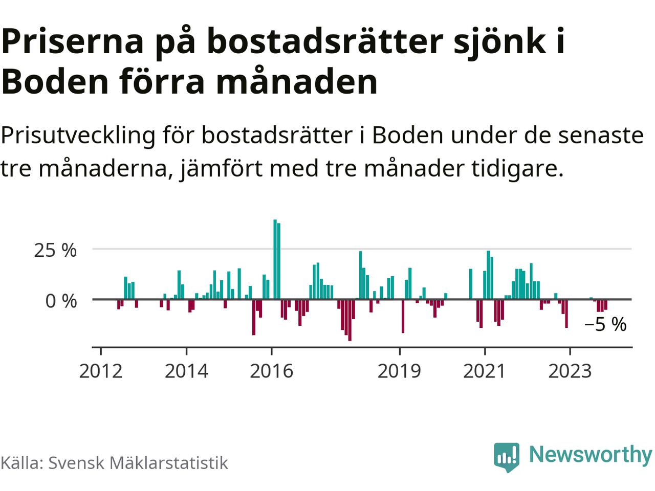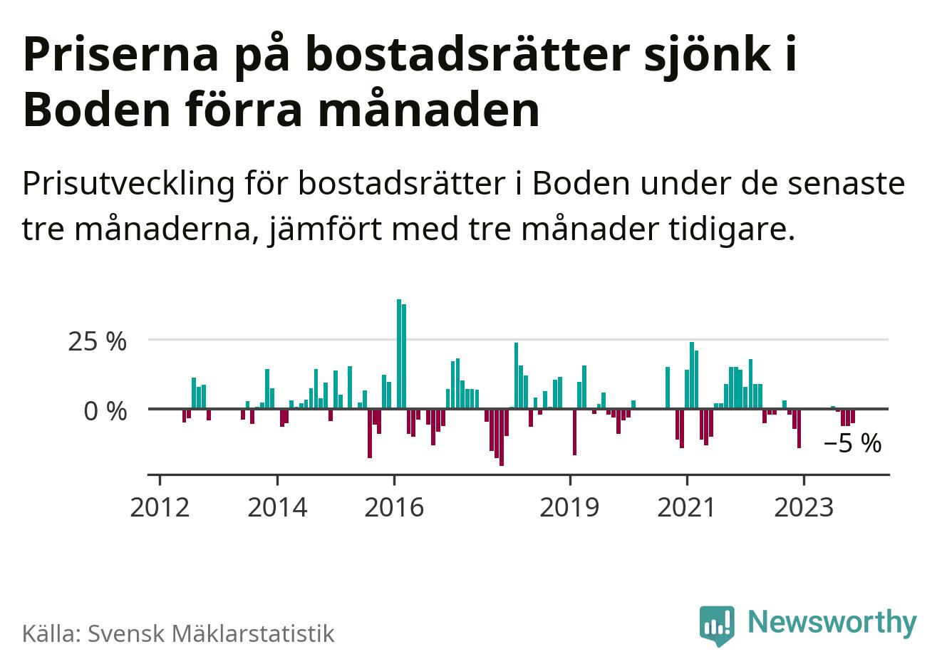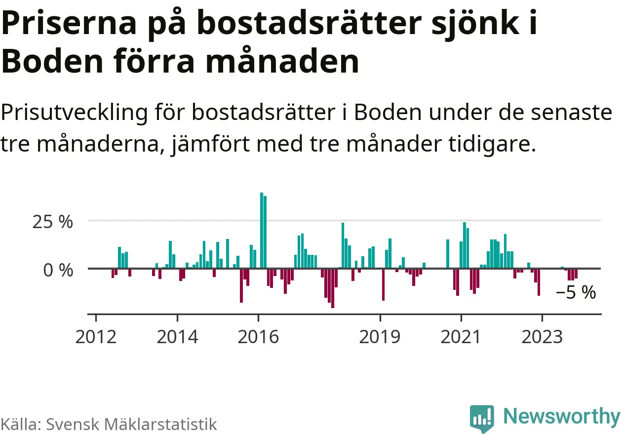 Priserna på bostadsrätter har gått ner i Bodens kommun. Medelpriset på försäljningarna under de senaste tre månaderna visar på en nedgång med 5 procent.
