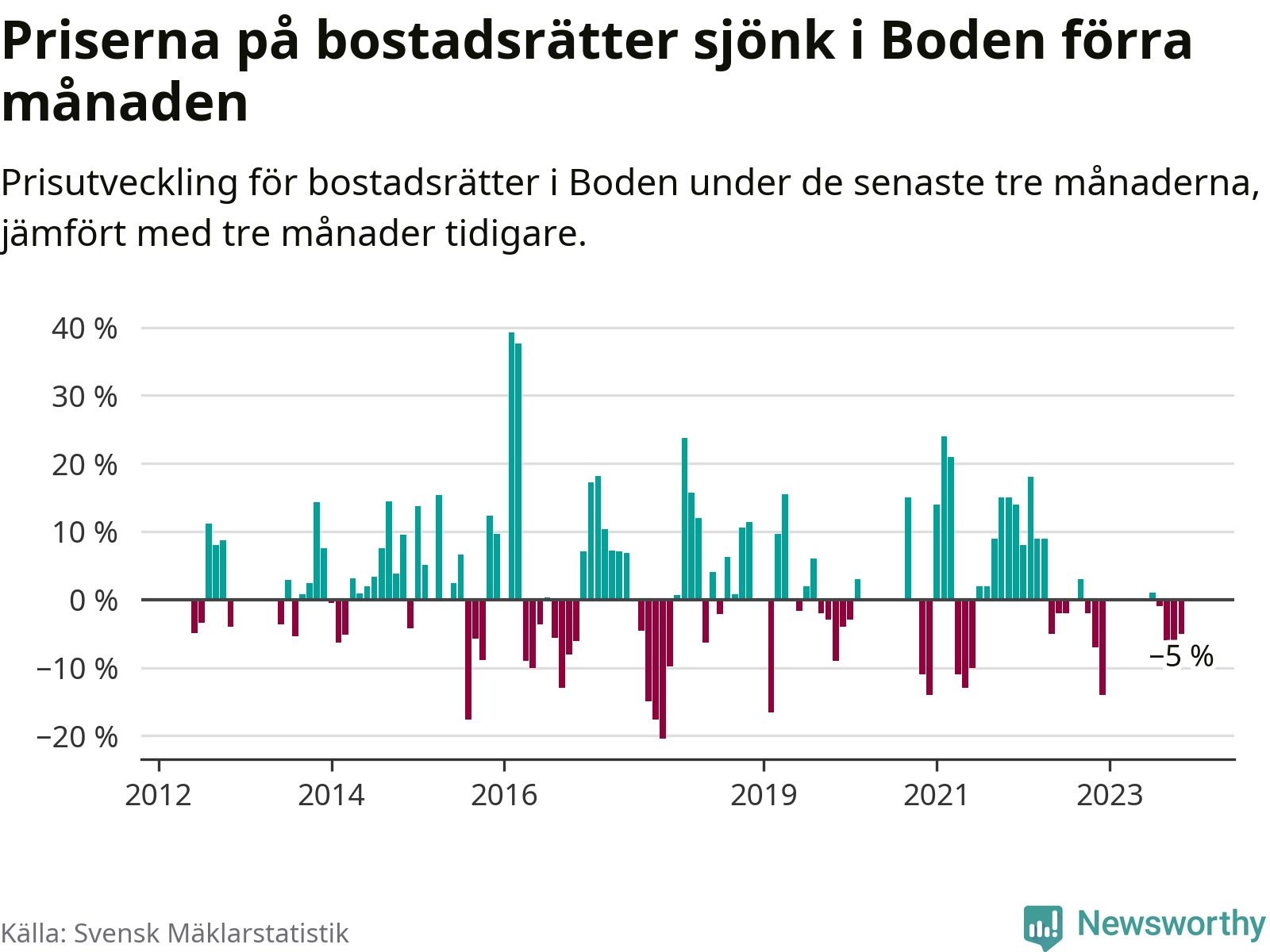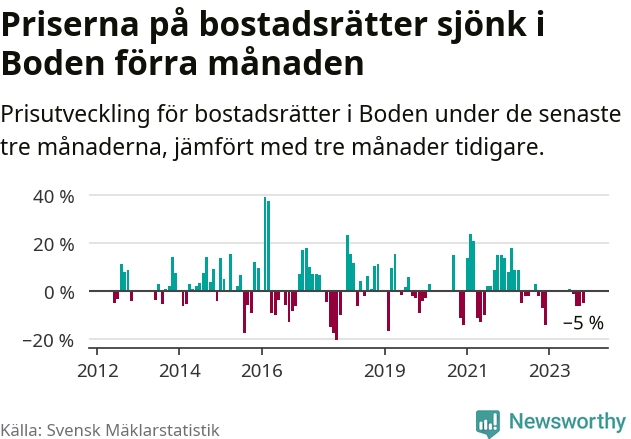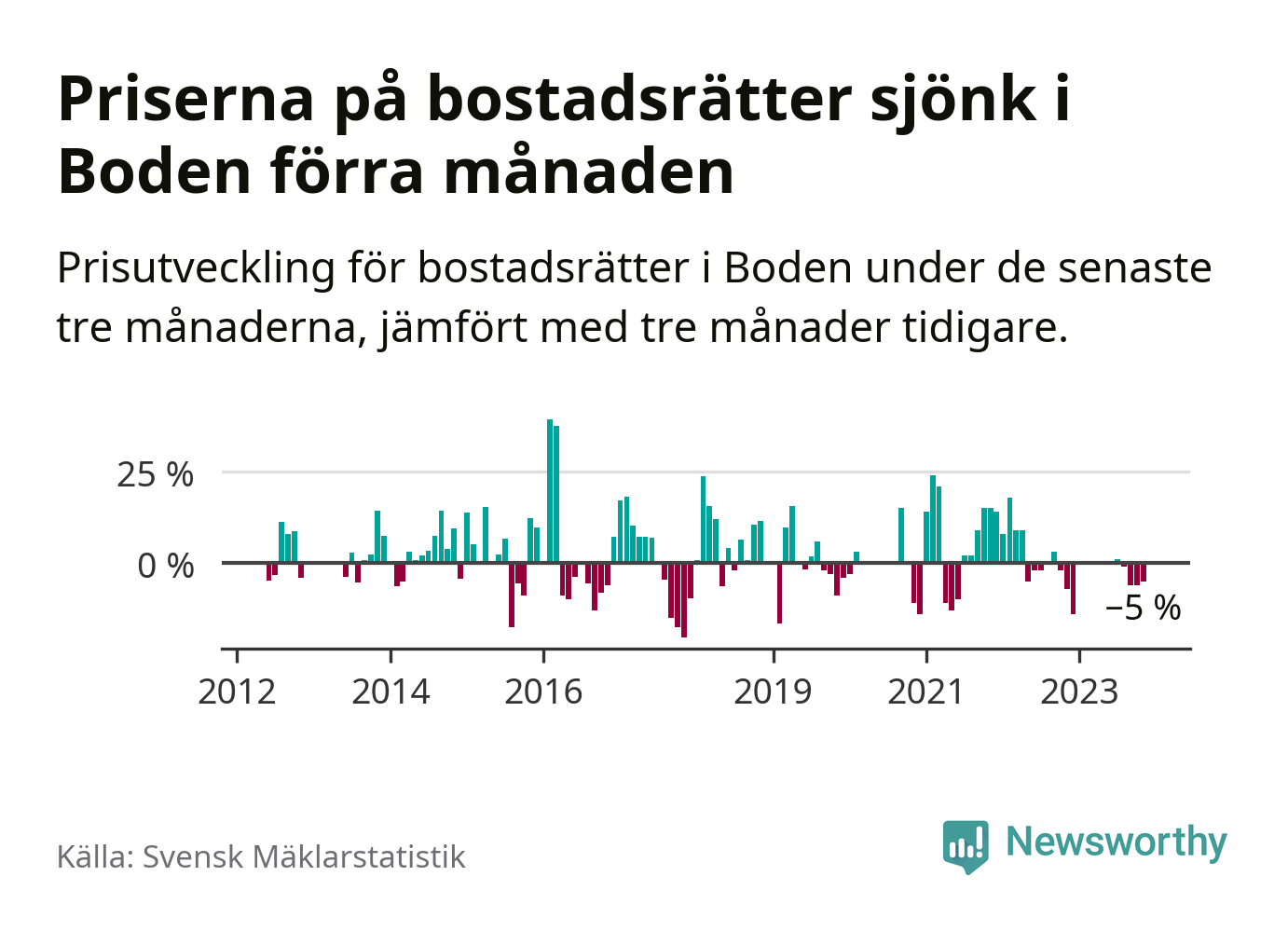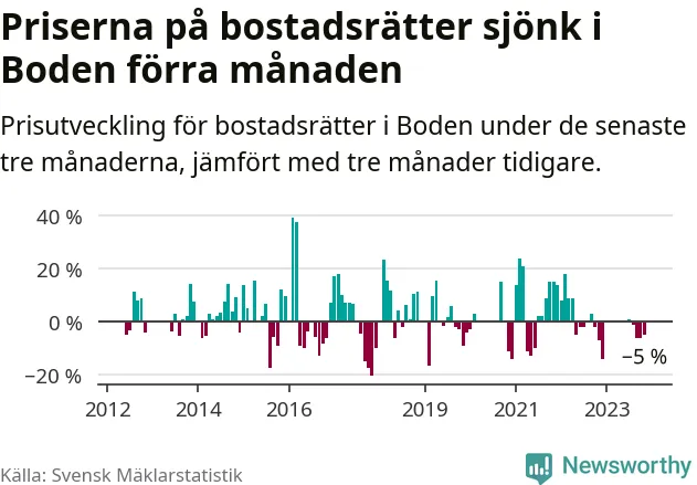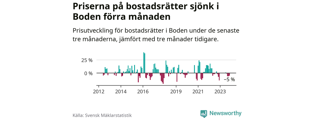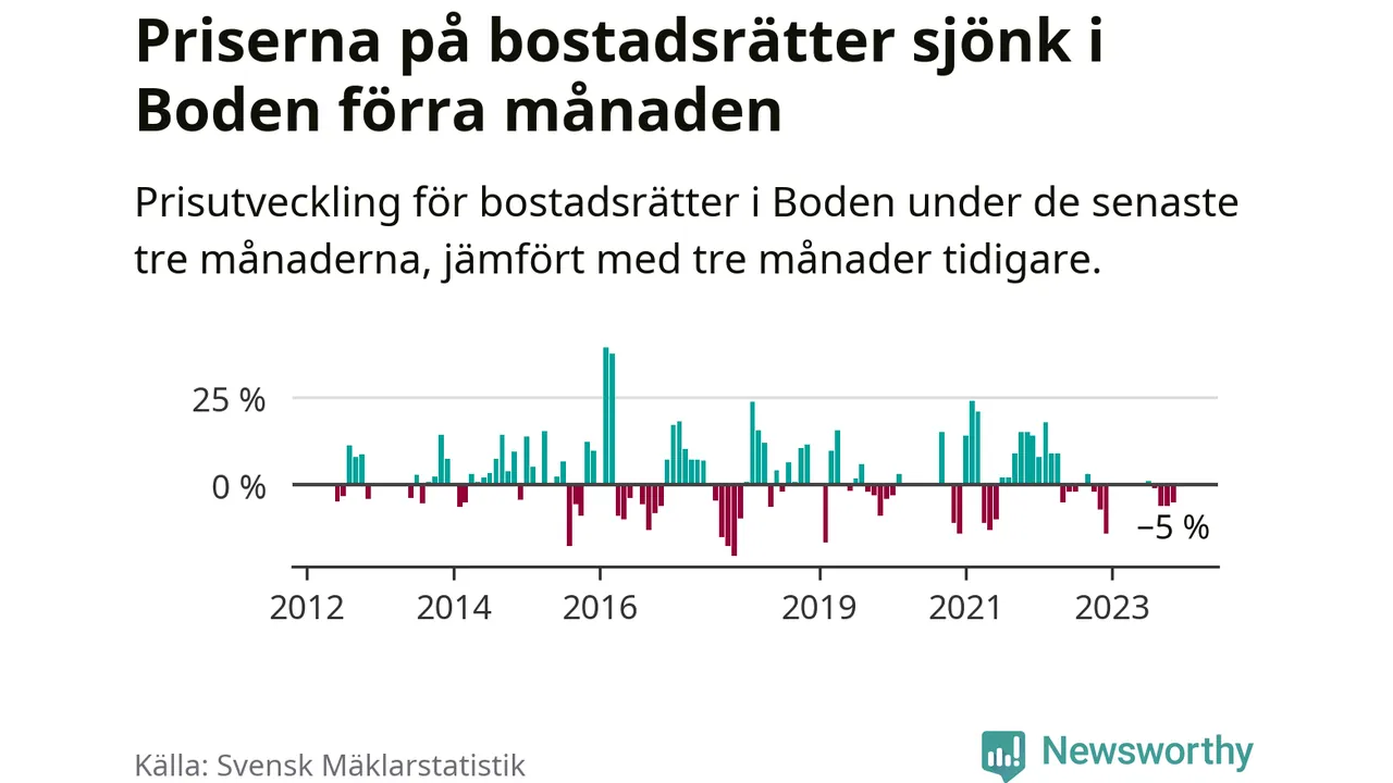 Priserna på bostadsrätter har gått ner i Bodens kommun. Medelpriset på försäljningarna under de senaste tre månaderna visar på en nedgång med 5 procent.