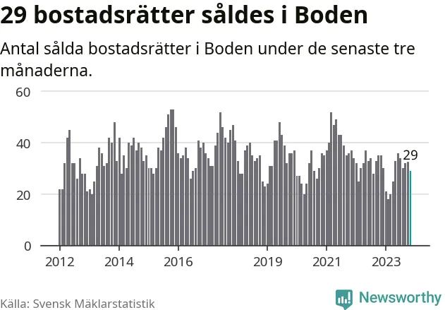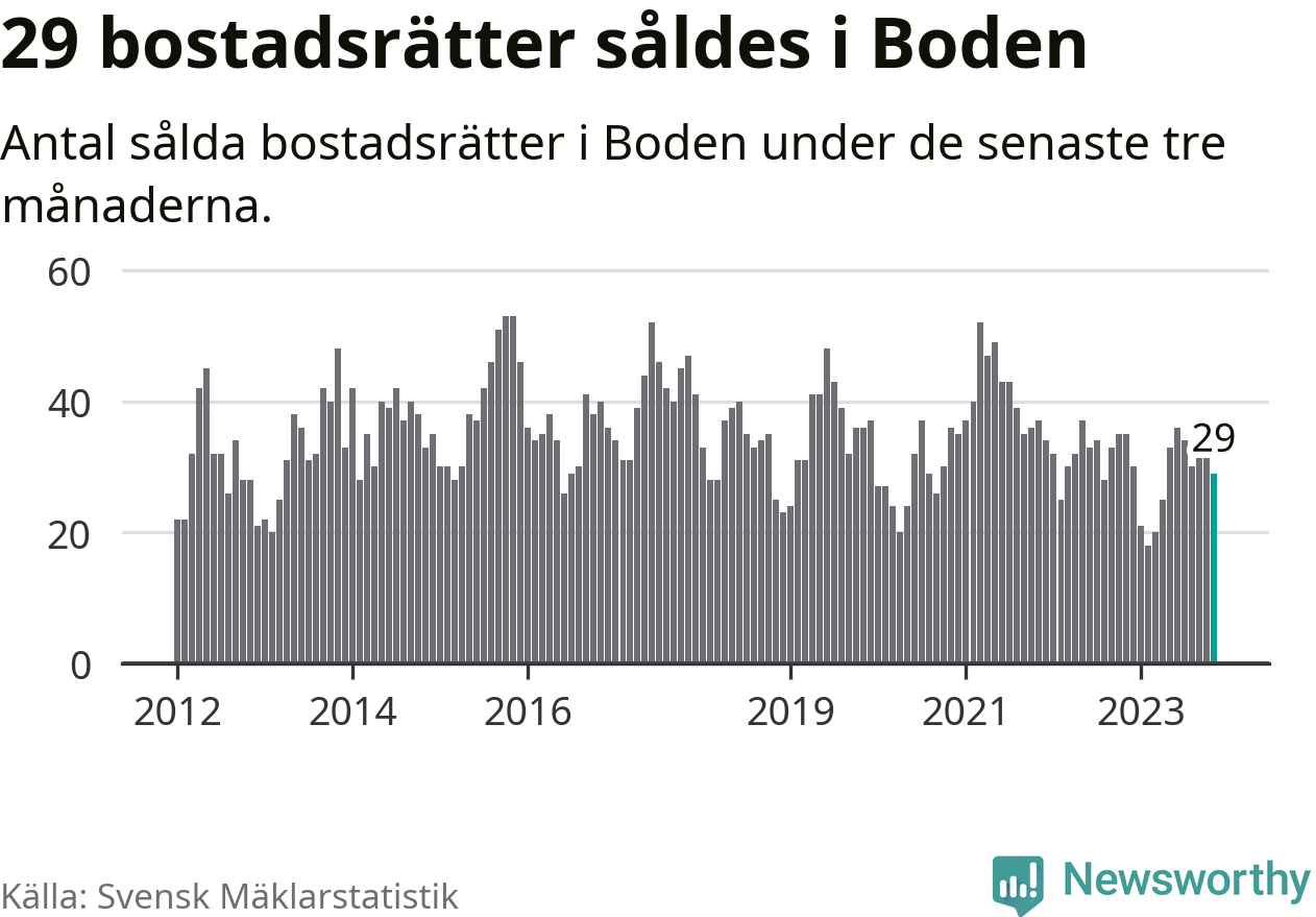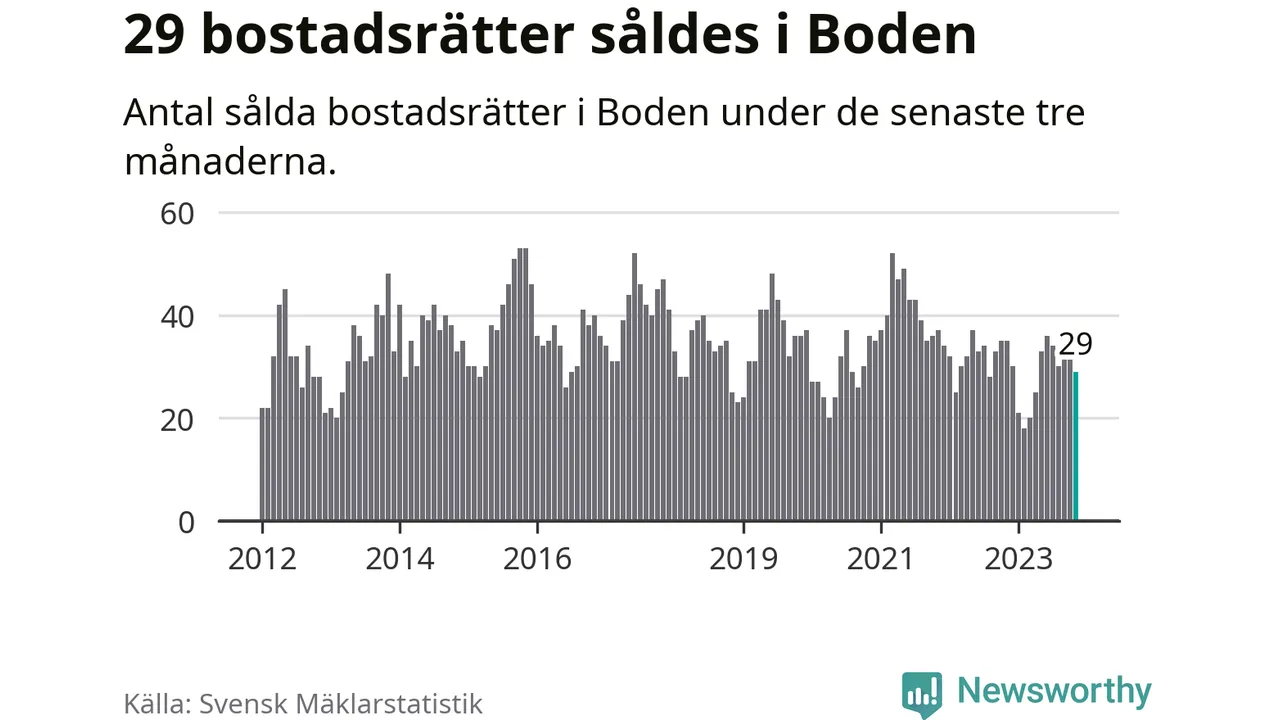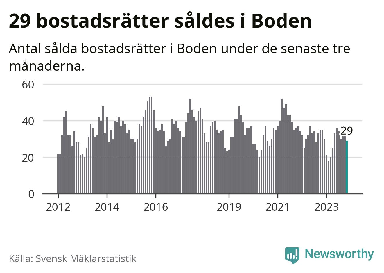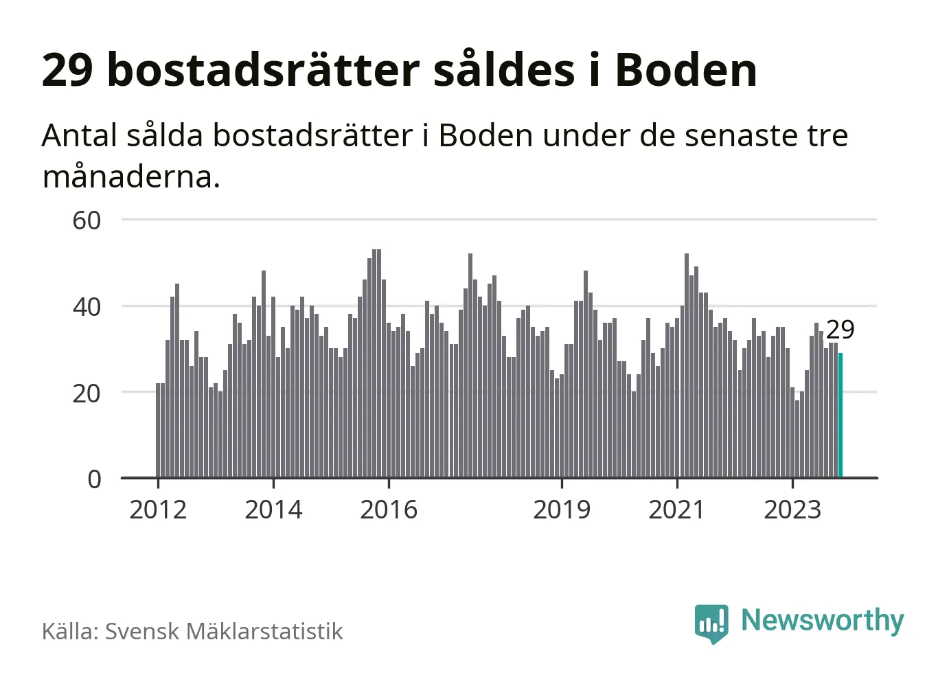 Sammanlagt såldes 29 bostadsrätter i Bodens kommun mellan september och november till ett genomsnittligt pris på 1,0 miljon kronor. I fjol gjordes 35 affärer vid den här tiden på året.