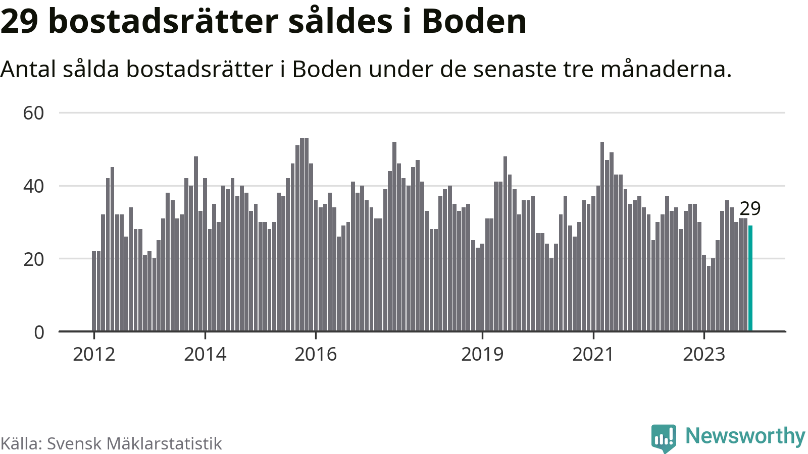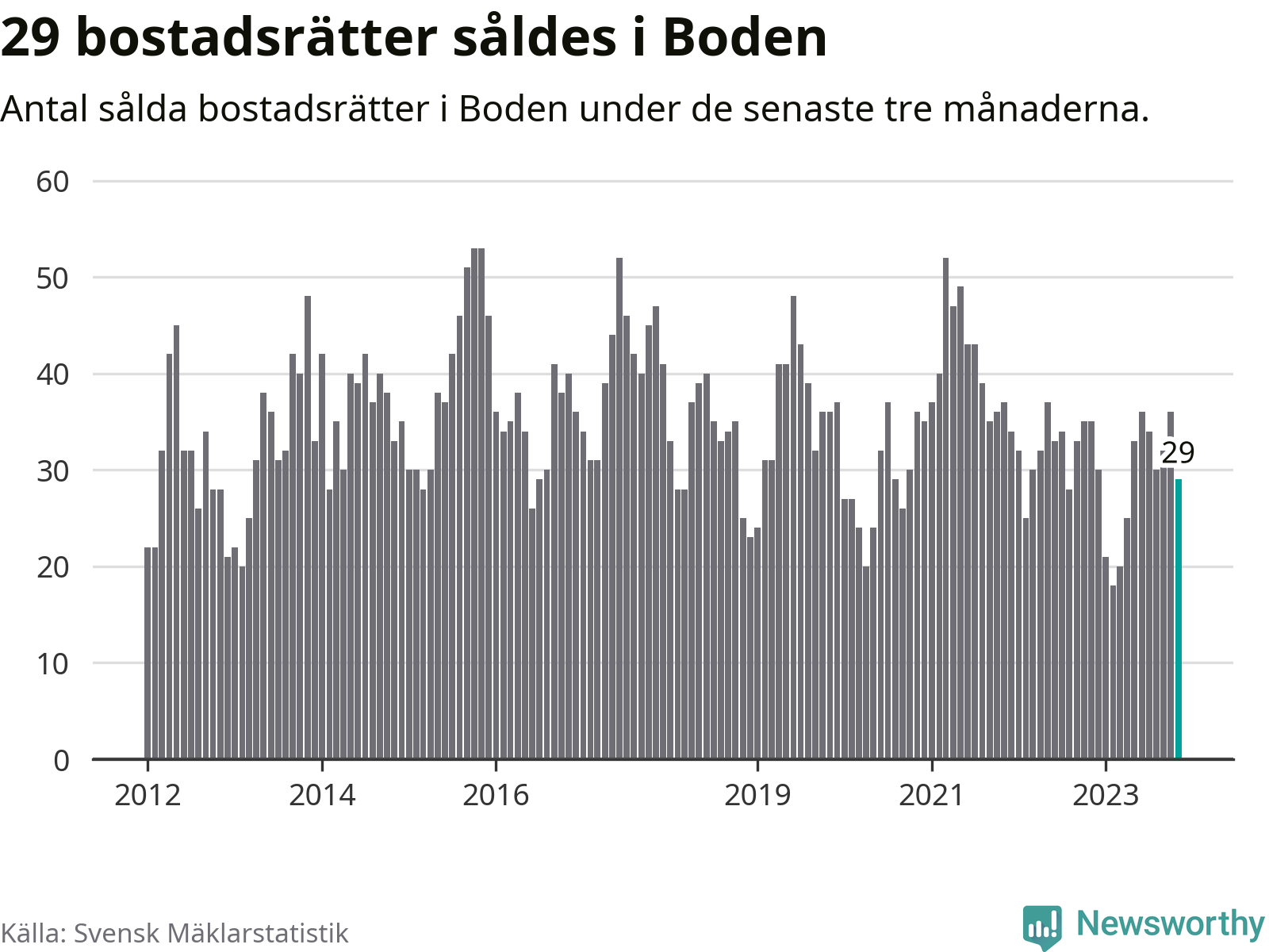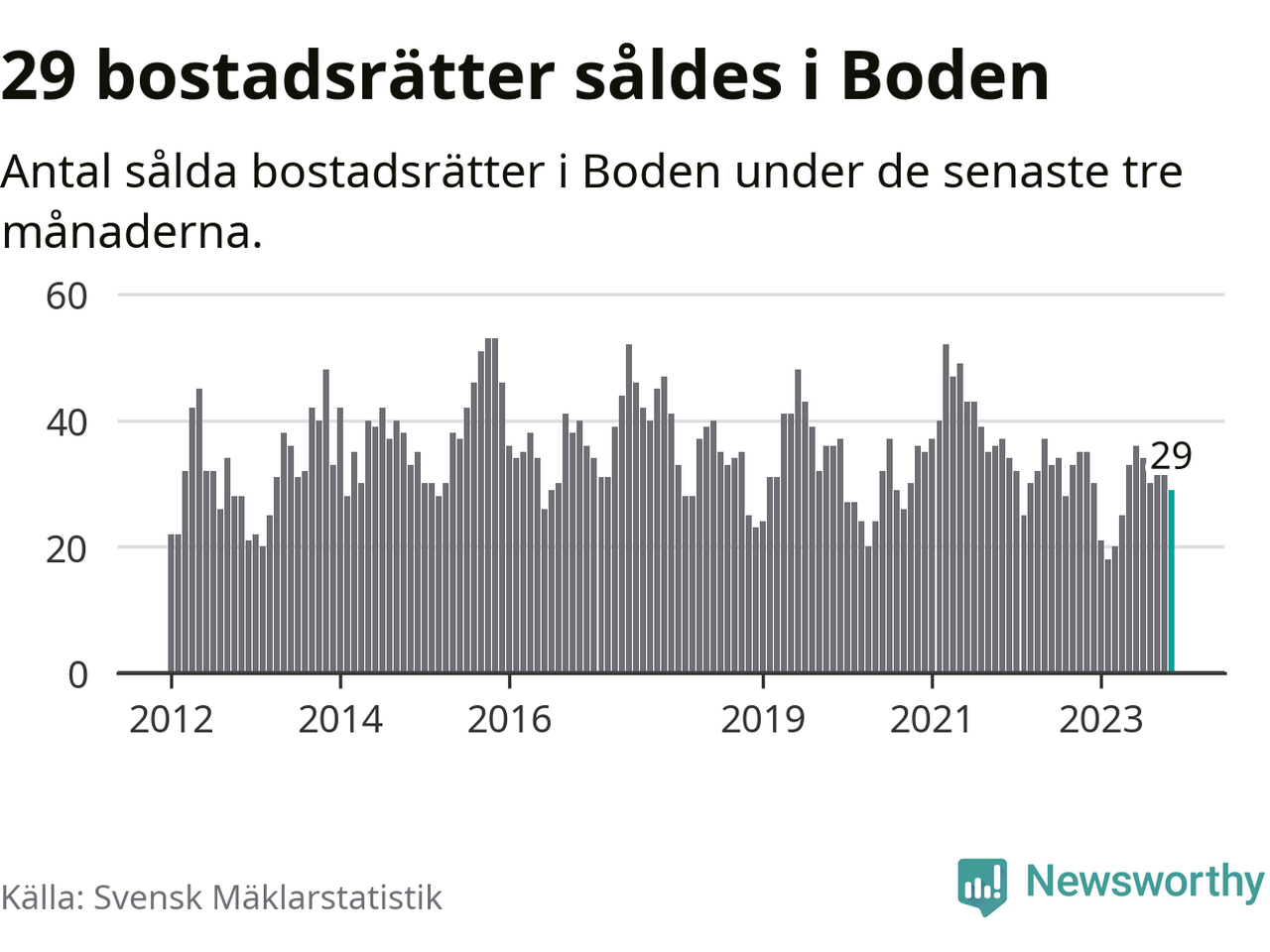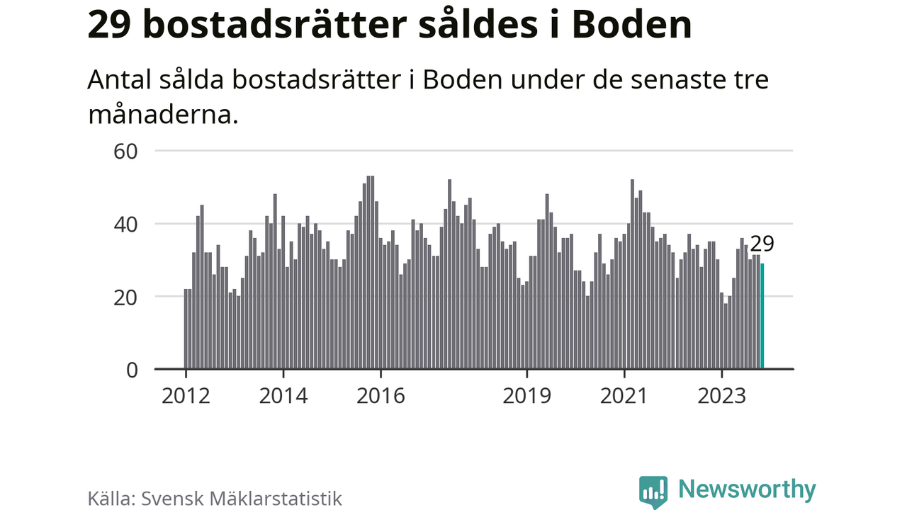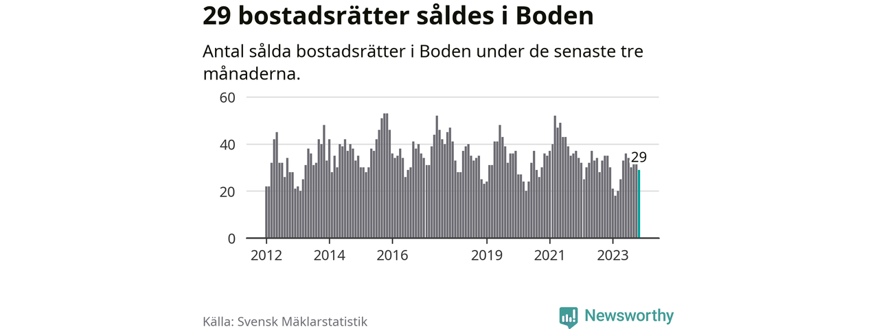 Sammanlagt såldes 29 bostadsrätter i Bodens kommun mellan september och november till ett genomsnittligt pris på 1,0 miljon kronor. I fjol gjordes 35 affärer vid den här tiden på året.