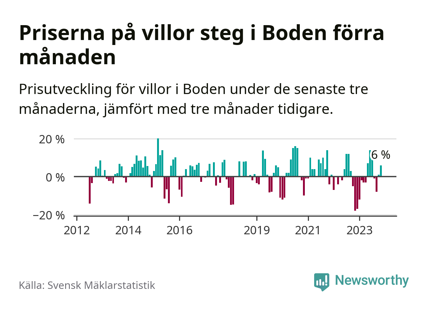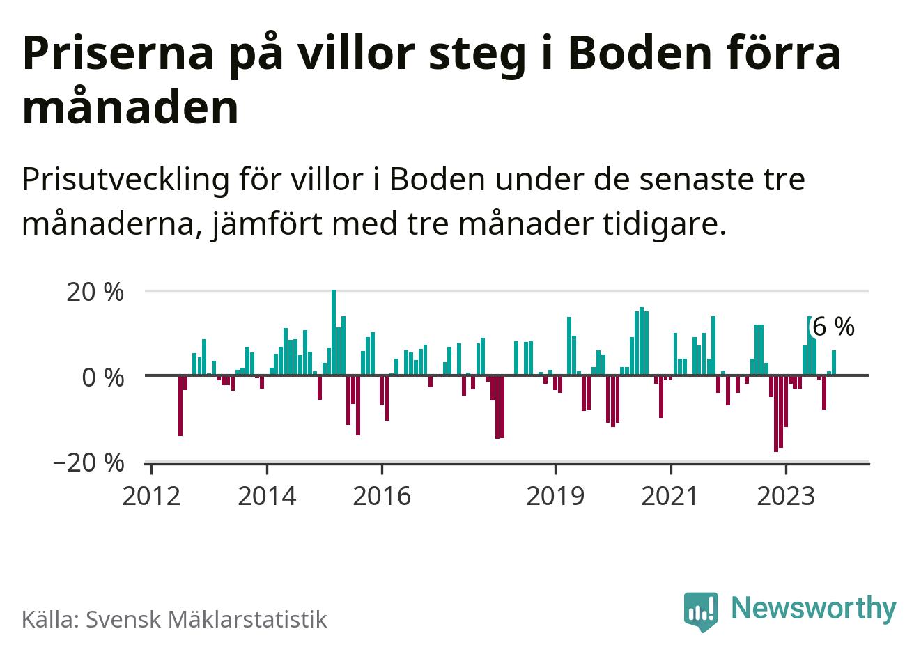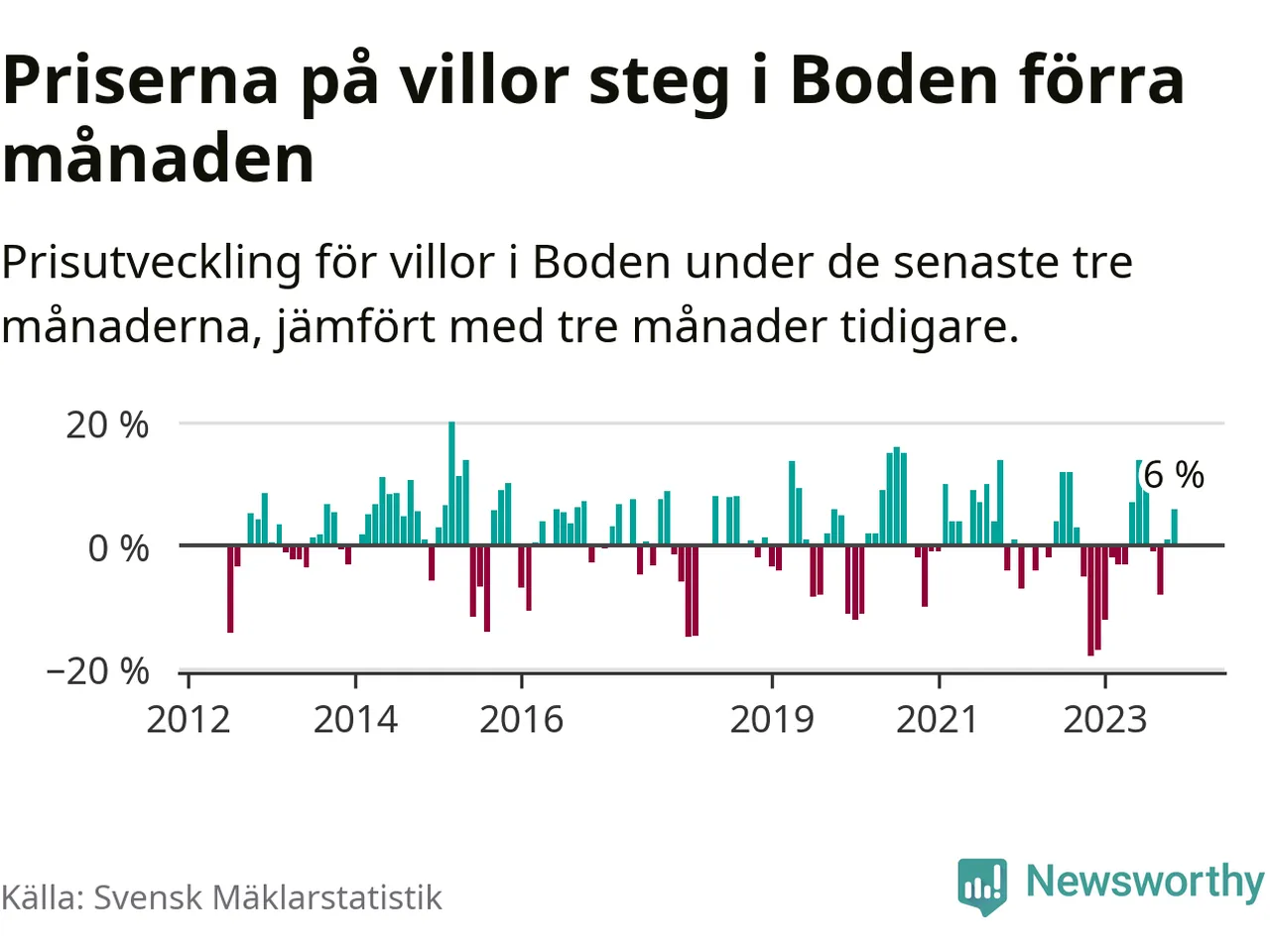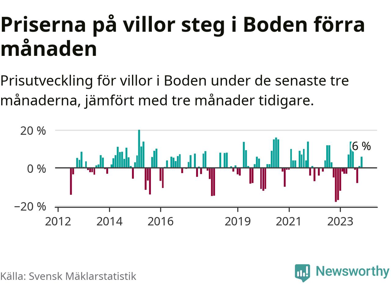 Villapriserna har gått upp i Bodens kommun. Medelpriset på försäljningarna under de senaste tre månaderna visar på en uppgång med 6 procent.